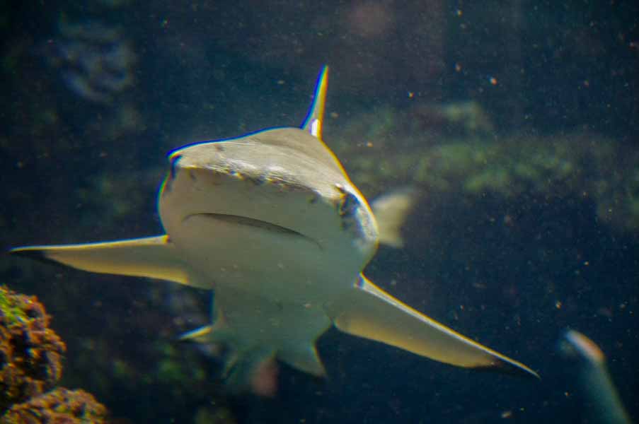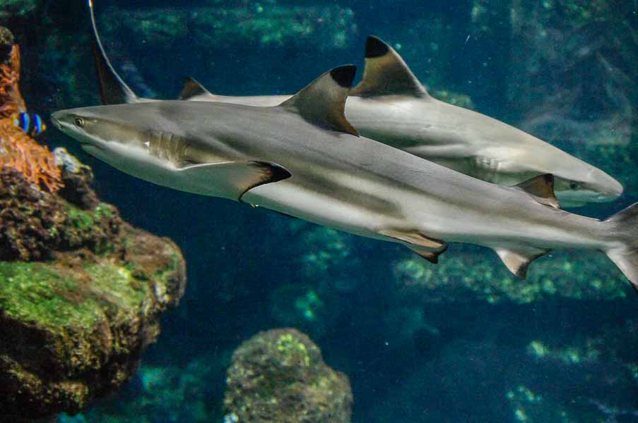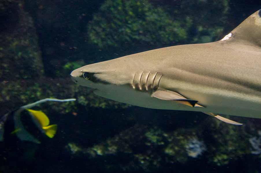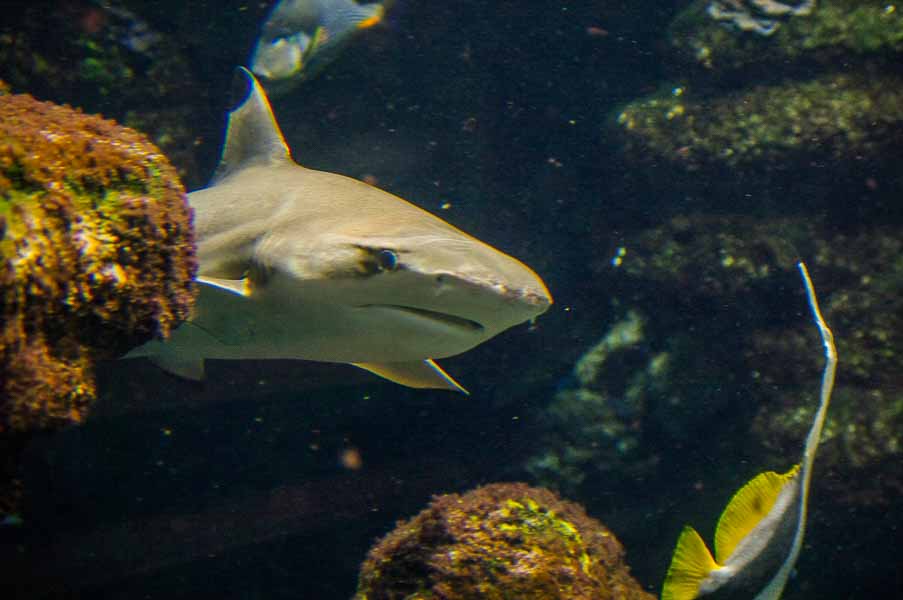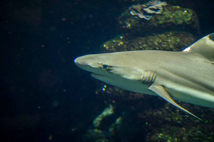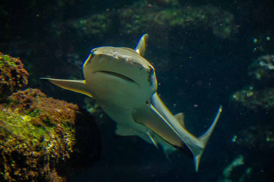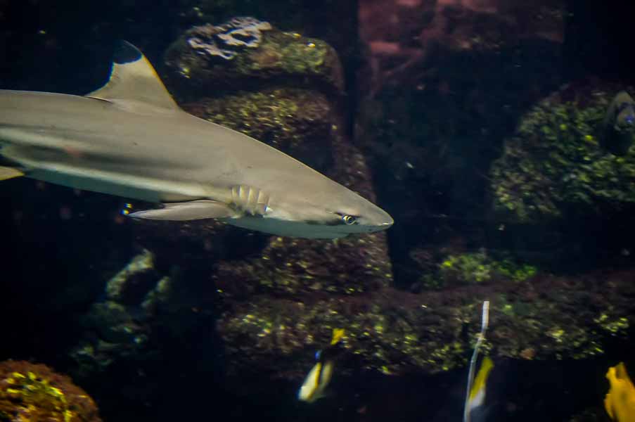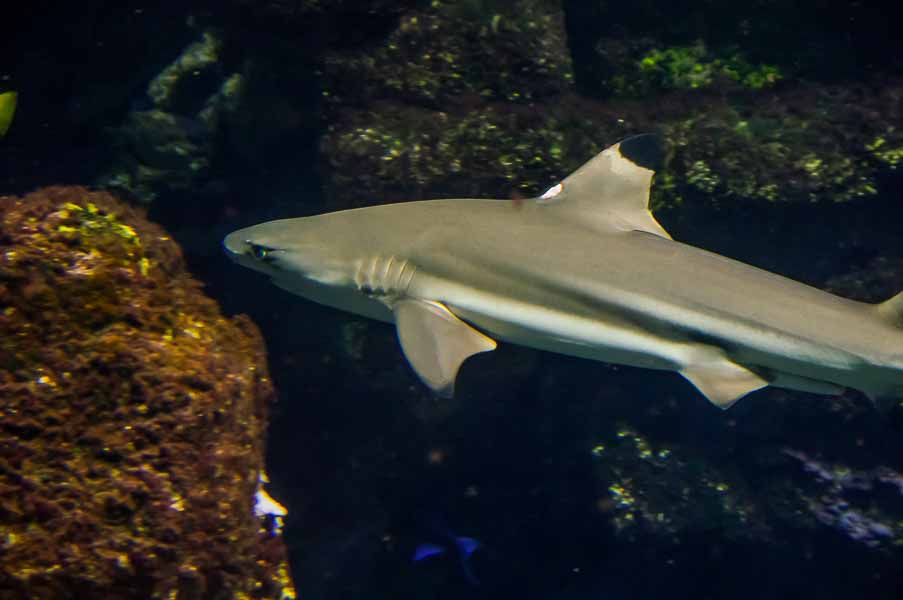 Der 2. Anlauf. Diesmal mit dem maßgeblichen Versuch, die Schwarzspitzen-Riffhaie angemessen in Szene zu setzen. Die dicke Glasscheibe und die Licht-Reflektionen haben das Vorhaben anfangs fast unmöglich werden lassen. Aber mit Geduld und ständigen Positonswechseln habe ich dann doch für mich recht ansehnliche „Unterwasser-Fotos“ vom Hai-Paar machen können.