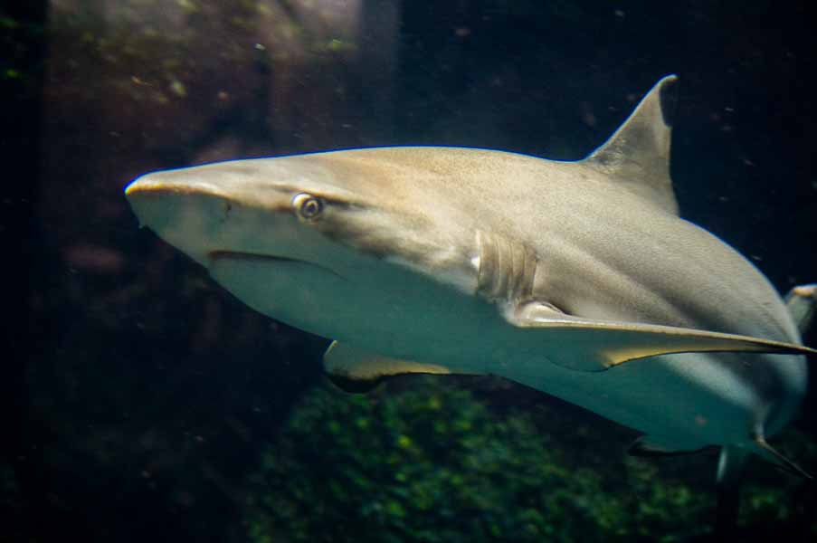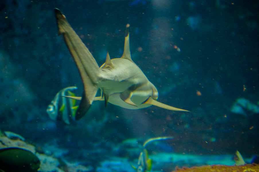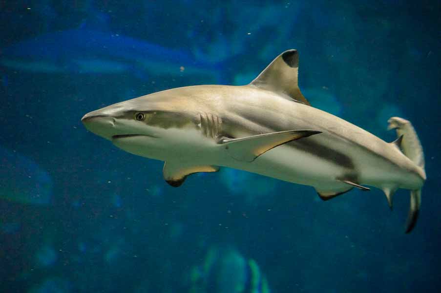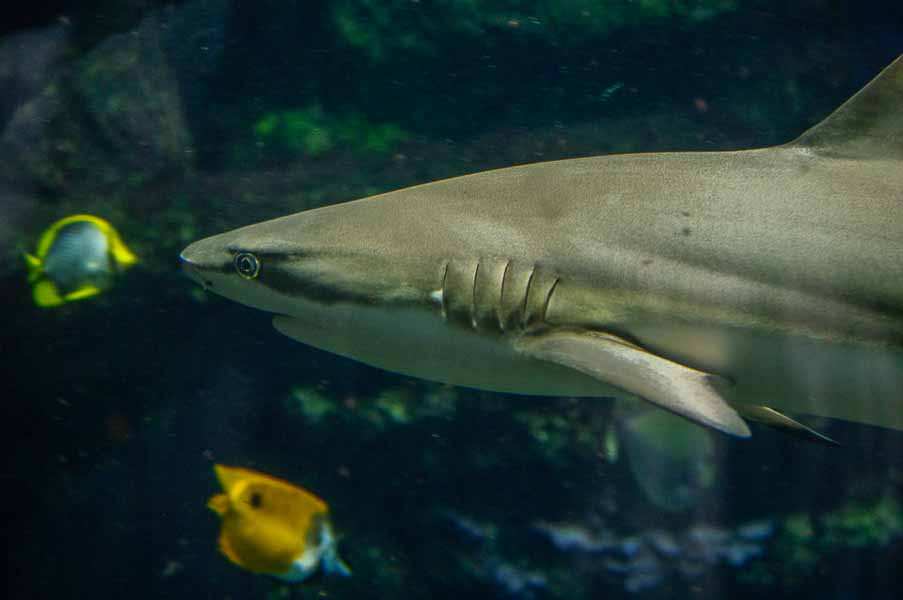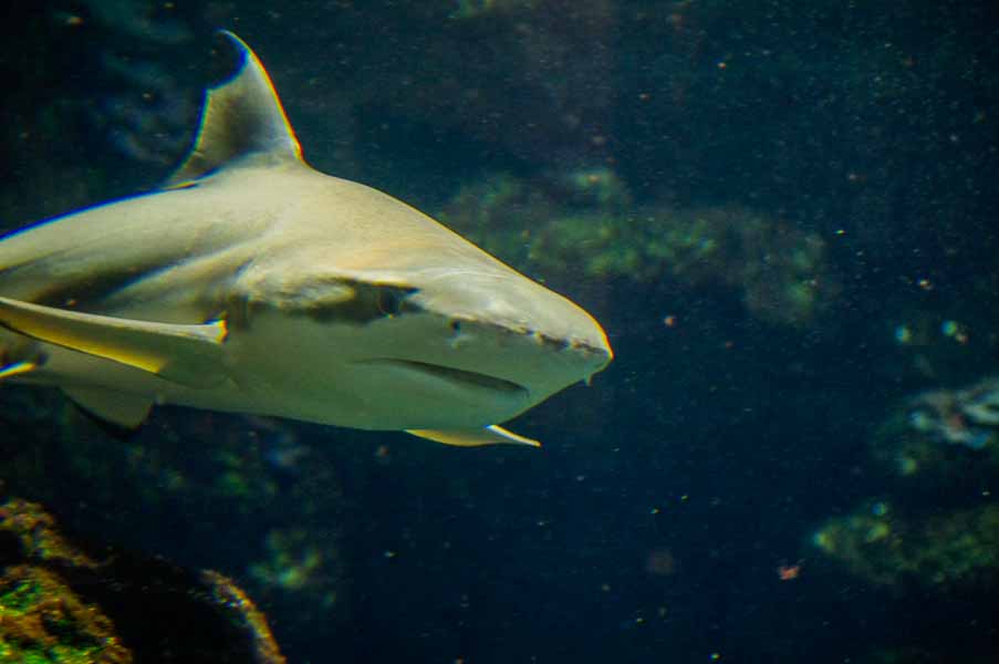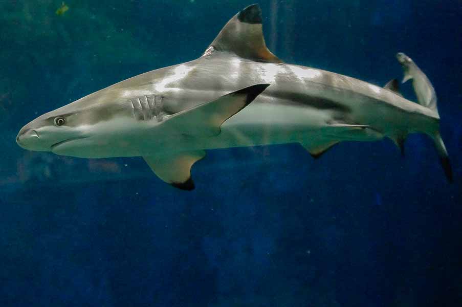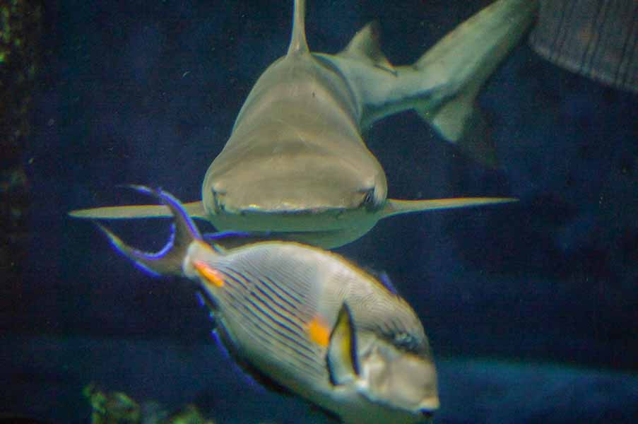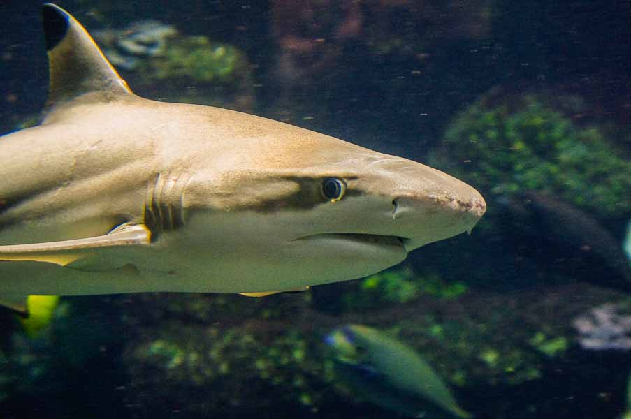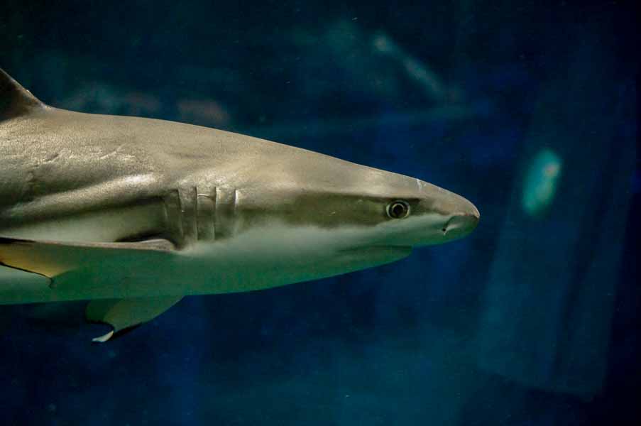 Der 2. Anlauf. Diesmal mit dem maßgeblichen Versuch, die Schwarzspitzen-Riffhaie angemessen in Szene zu setzen. Die dicke Glasscheibe und die Licht-Reflektionen haben das Vorhaben anfangs fast unmöglich werden lassen. Aber mit Geduld und ständigen Positonswechseln habe ich dann doch für mich recht ansehnliche „Unterwasser-Fotos“ vom Hai-Paar machen können.