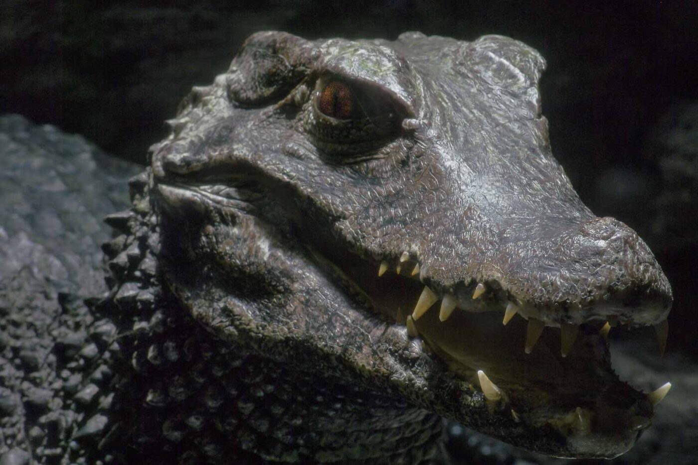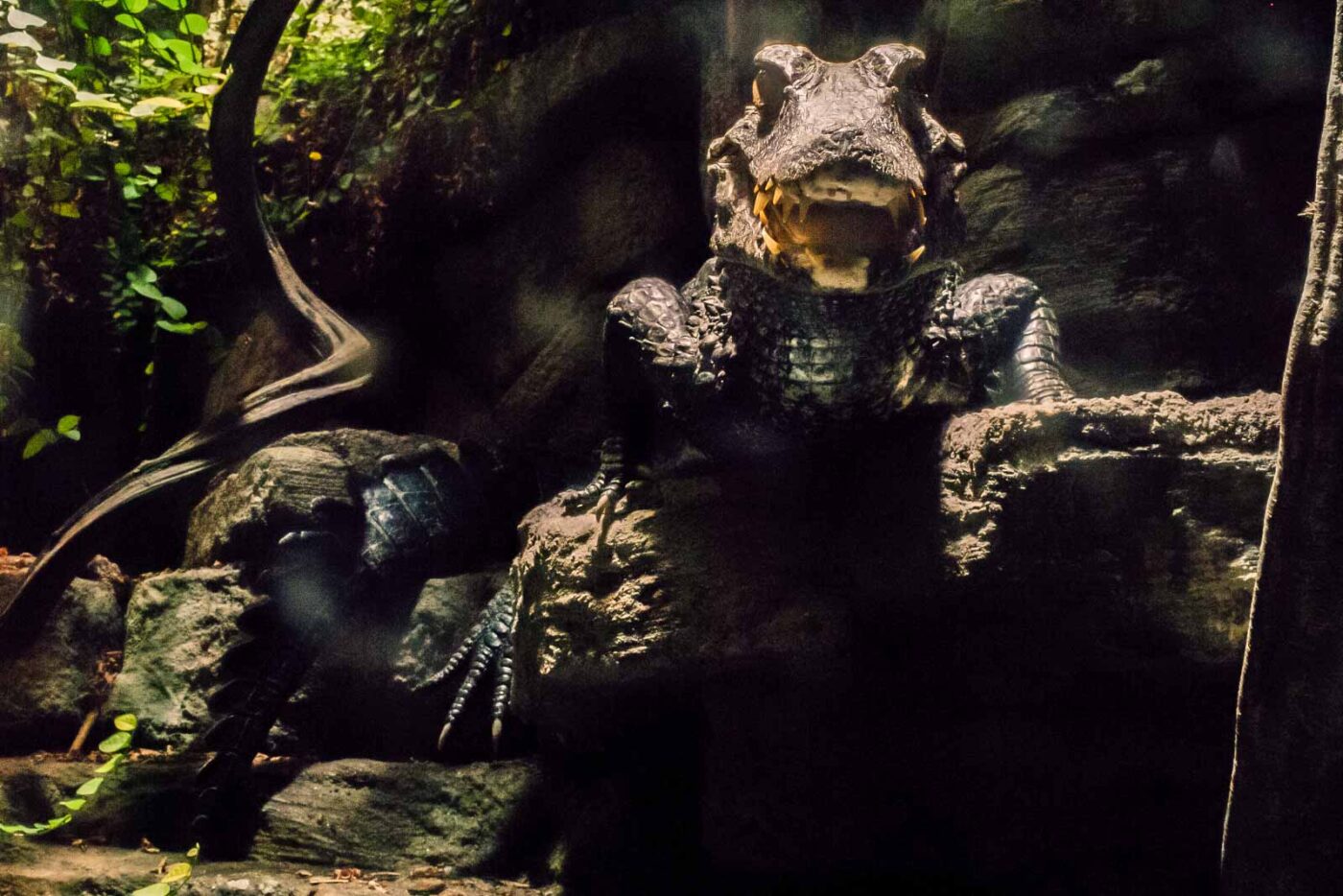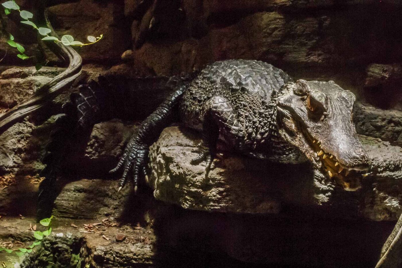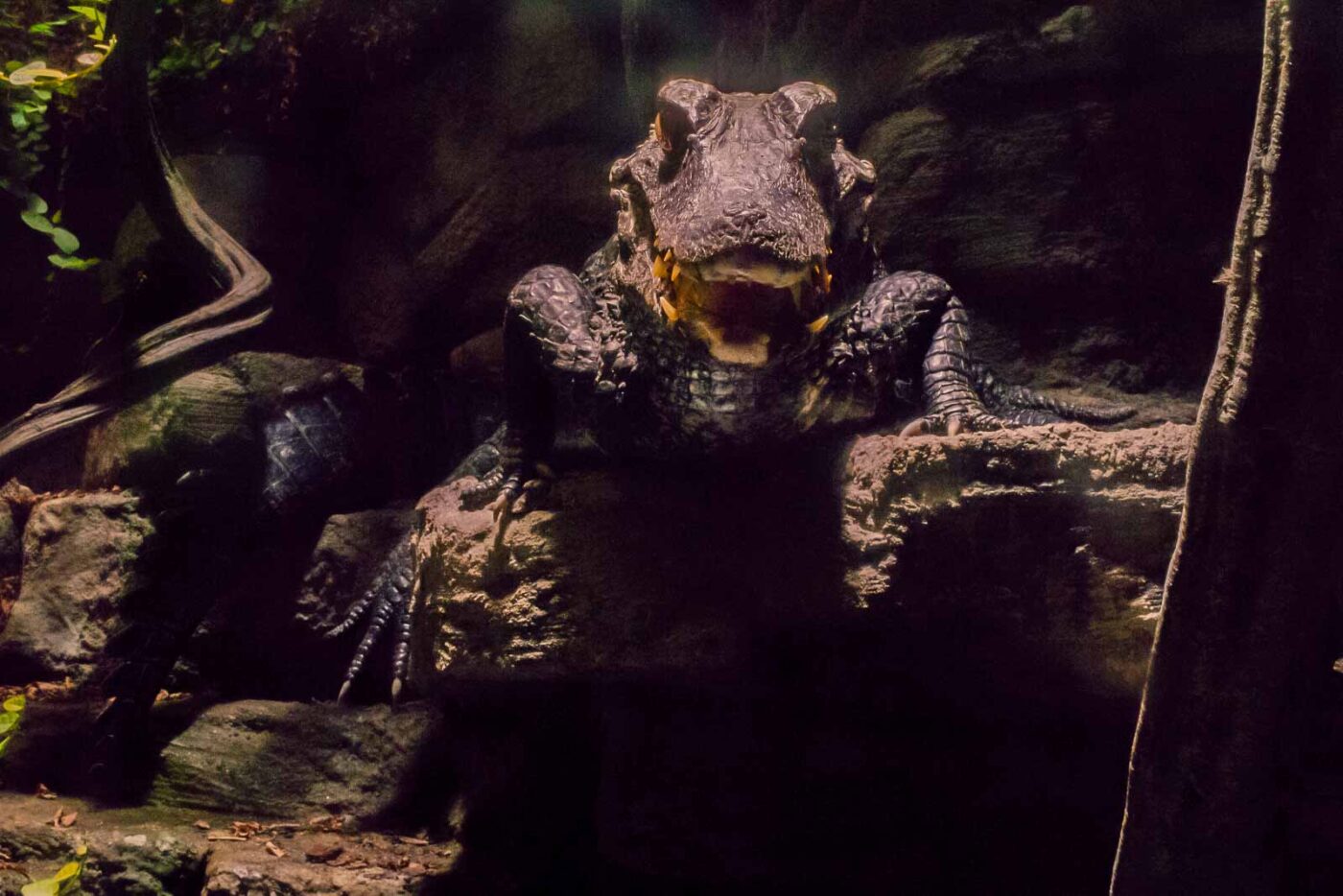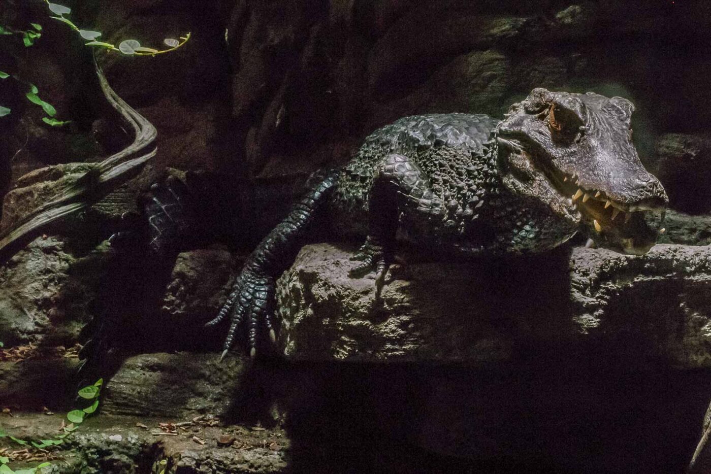Den Kaimanen war meine Erscheinung allerdings ziemlich egal. Bis auf einen kurzen Moment, in dem ich direkt an der Scheibe sass, wollte ein Kaimain die Revierverhältnisse geklärt wissen. Ohne Panzerglas hätte der Kaiman sein Besitzrecht ungehindert geltend gemacht. Ansonsten waren die Krokos aber friedlich und äusserst ruhig und unbeweglich. Was natürlich die langen Belichtungszeiten begünstigt hat, die bei der schwachen Beleuchtung unbedingt erforderlich waren.