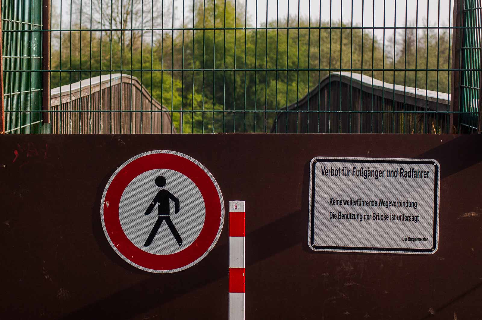 2017-04-08 – EmscherValleyWay – Holzbrücke über die Emscher – die Benutzung des Bauwerks ist (leider aber nachvollziehbar) verboten.