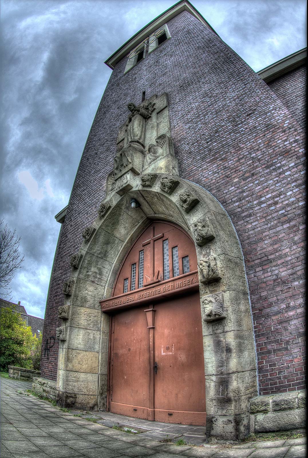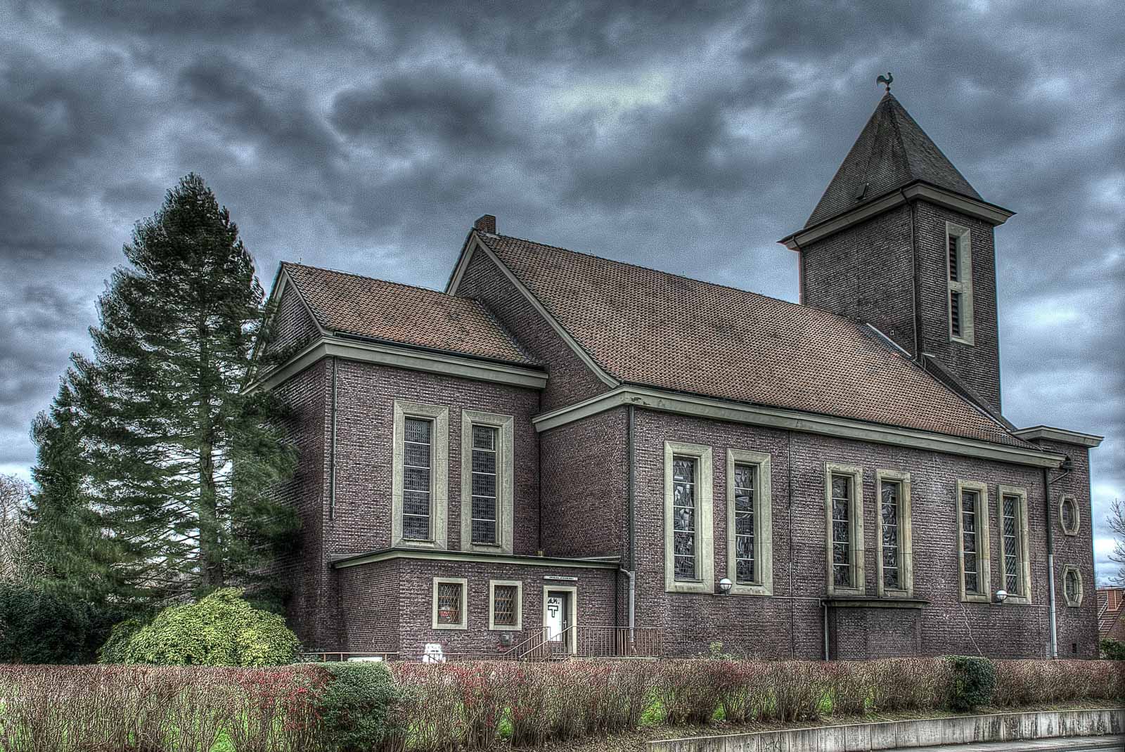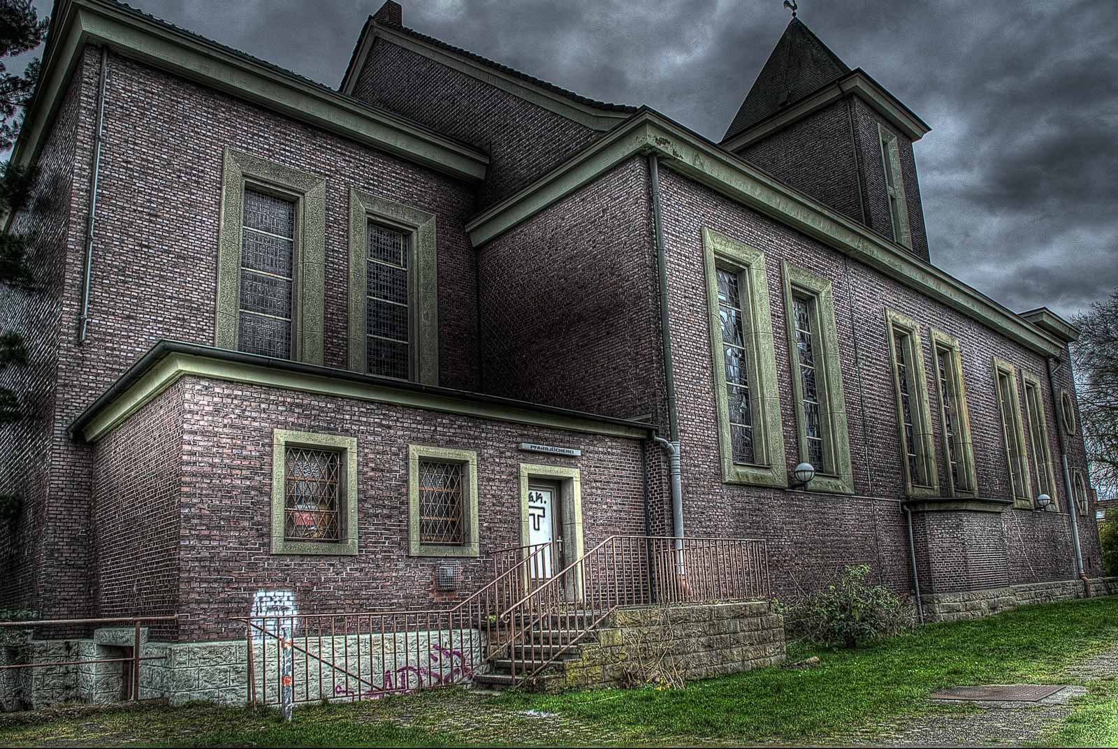 Strukturwandel – da wäre ich wieder bei den korrupten Städteplanern und neumodernen Immobilienhaien wie z. B. die RAG – und dadurch bedingt Abwanderung mangels einträglicher Verdienstmöglichkeiten mangels bezahlter Arbeit, Geldmangel der wenigen verbliebenen Schäflein, abfallende Sterbequote und Überalterung der Gesellschaft sowie Kirchenaustritte mit steigender Tendenz haben wohl dazu geführt, dass die katholische Kirchengemeinde Herz Jesu an der Röhlinghauser Straße 6 mangels Steuereinnahmen und leerer Klingelbeutel dann ebenfalls in 2007 den Deckel draufmachen musste. Der Klotz von 1927 steht also schon etwas länger leer. Selbst die Glocken hat das THW mittlerweile rausgeschraubt. Wahrscheinlich wurden die Bimmeln eingeschmolzen und nach Islamabad verschifft, um Kanonen daraus zu löten. Aber ich durfte trotztdem nicht an die Kirchenwand pinkeln. Das Schatzi hat’s mir verboten. Die Bude ist mittlerweile komplett geräumt. Das haben wir aus sicherer Quelle eines täglich dort mit seinem Fiffi laufenden Eingeborenen erfahren.