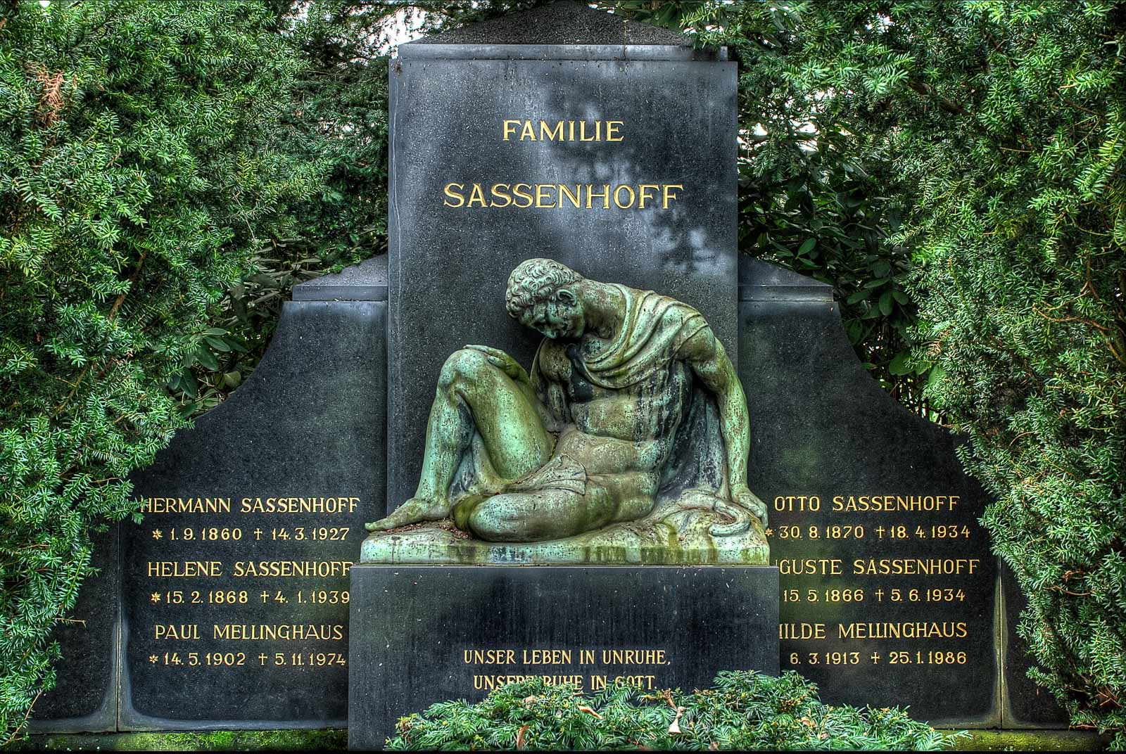 Mal abgesehen von dem für mich hierzulande völlig unsinnigen Bestattungskult haben solche 1. Klasse-Gräber sicher auch ihre Berechtigung. Denn es werden schließlich verdiente Söhne und Töchter der Stadt in bleibender Erinnerung für nachfolgende Generationen gehalten. Wie die in den Weltkriegen Gefallenen. Wobei die zu ehren schon deshalb wichtig ist, weil die armen Hunde für ein paar schwachmatische Idioten ihren Kopf hingehalten und buchstäblich auch verloren haben. Das sind die reichen Schweine, die für die Bestattung armen Schweine, die für die einen zweifelhaften Tod gestorben sind, mehr als nur schuldig. Allerdings sind die Reichschweine, die auf den Friedhöfen ihre letzte Ruhe finden dürfen, nicht nur durch ihre persönliche Arbeit an ihren Reichtum gelangt. Die Industriellen dieser hier wohnenden Vertreter haben zumindest während des 2. Weltkrieges haufenweise Zwangsarbeiter beschäftigt, die den Unternehmen nix gekostet und trotzdem für schicke Umsätze und Gewinn gesorgt haben. Und das alles zum Wohle des Volkes. Und der Gefallenen …