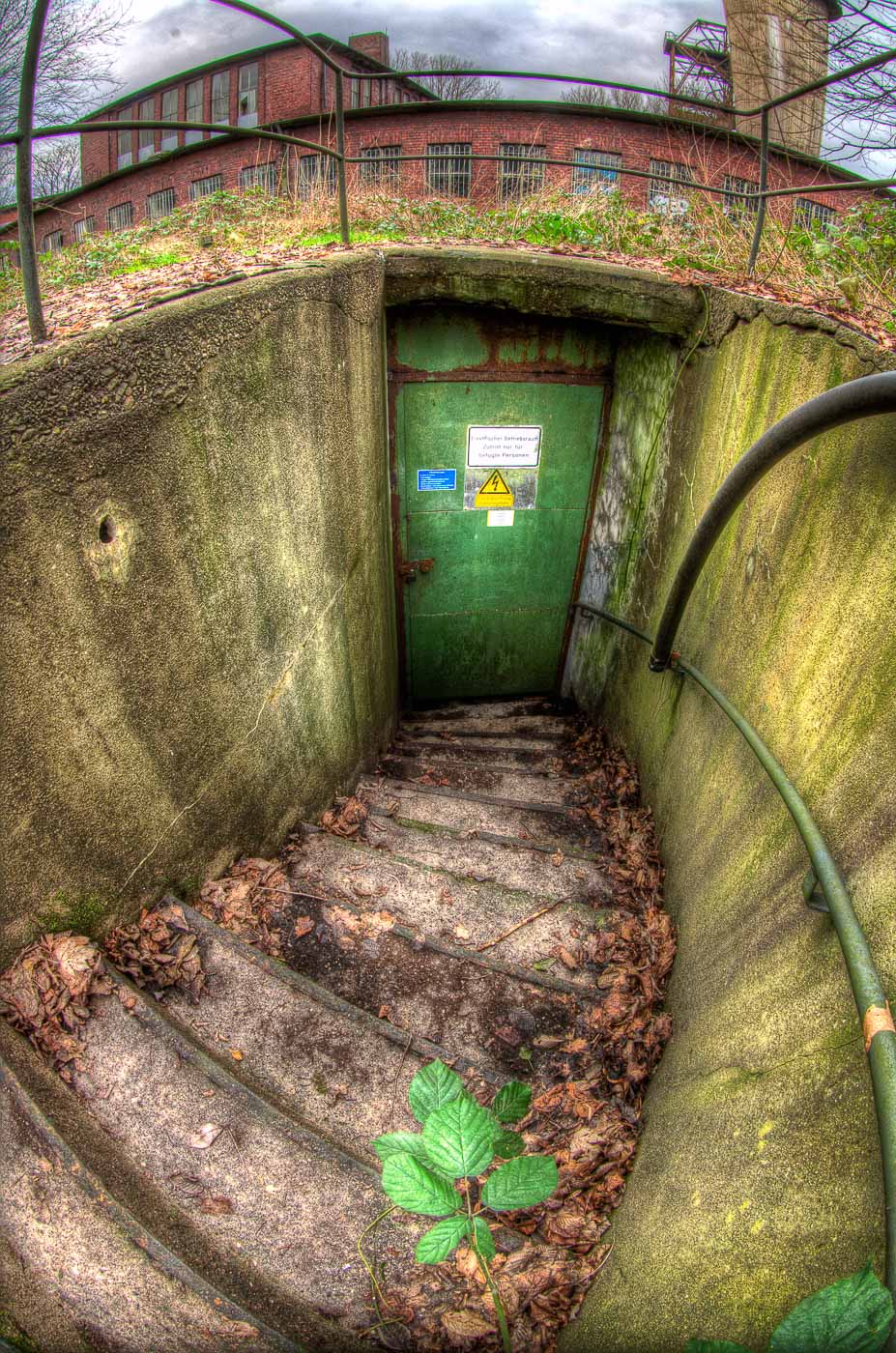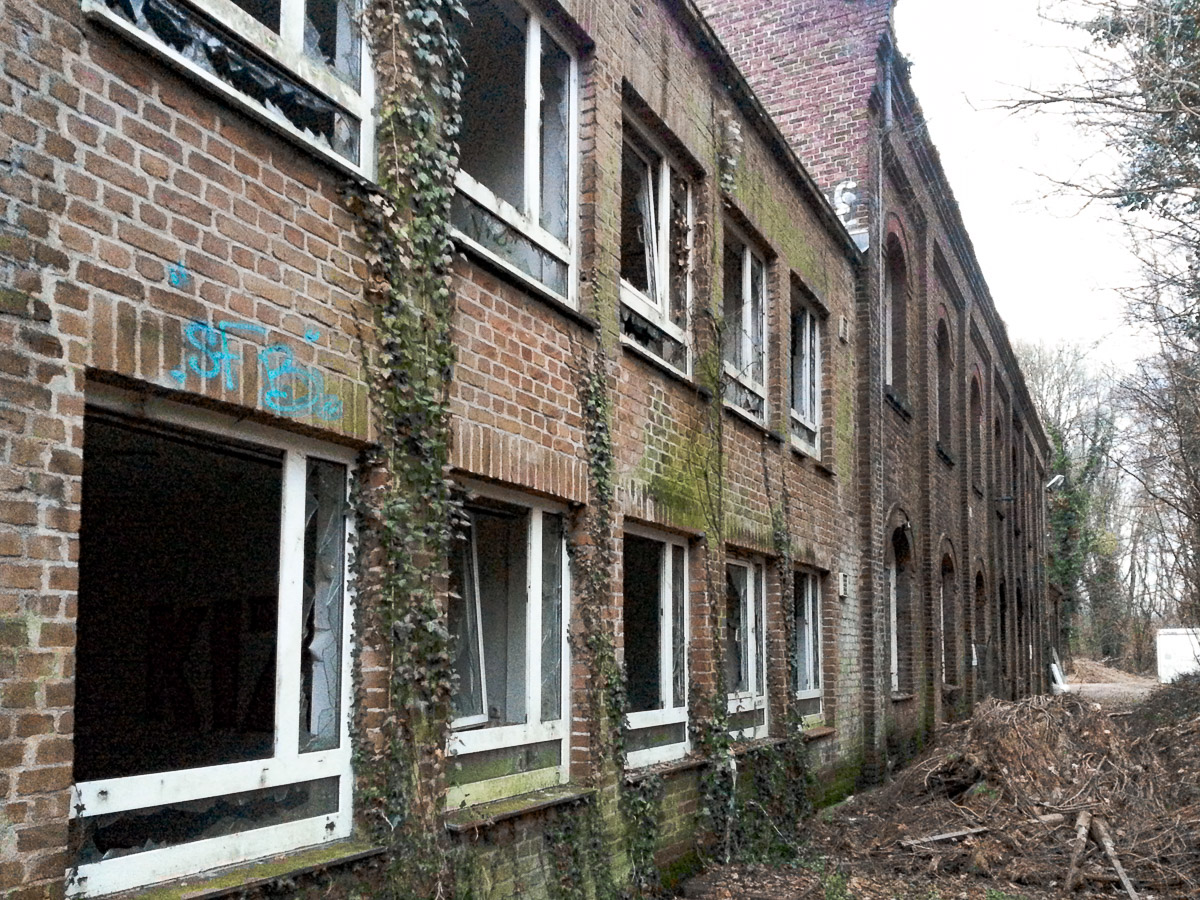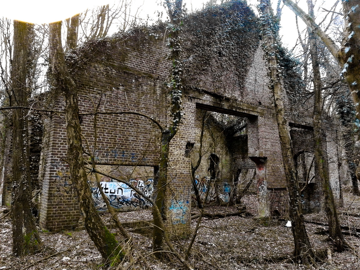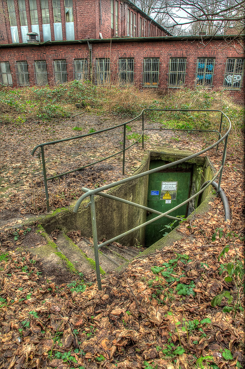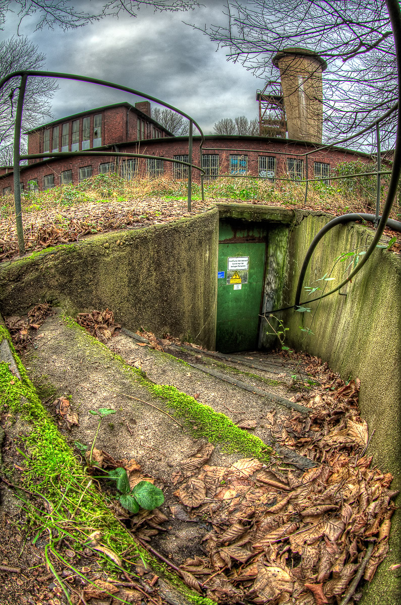 Nebenan auf dem gleichen Grundstück der RAG befand sich seinerzeit die Bergmann-Berufsschule. Die Hütte steht noch. Auch ein Nebengebäude ist als Ruine vorhanden. Durch den Metallgitterzaun kann man hindurch schlüpfen und durch die Wildnis geschützt die alten Gebäude unbemerkt erreichen. Ich hab das allerdings heute nur mal testweise gemacht und auch nur das Händie beigehabt.