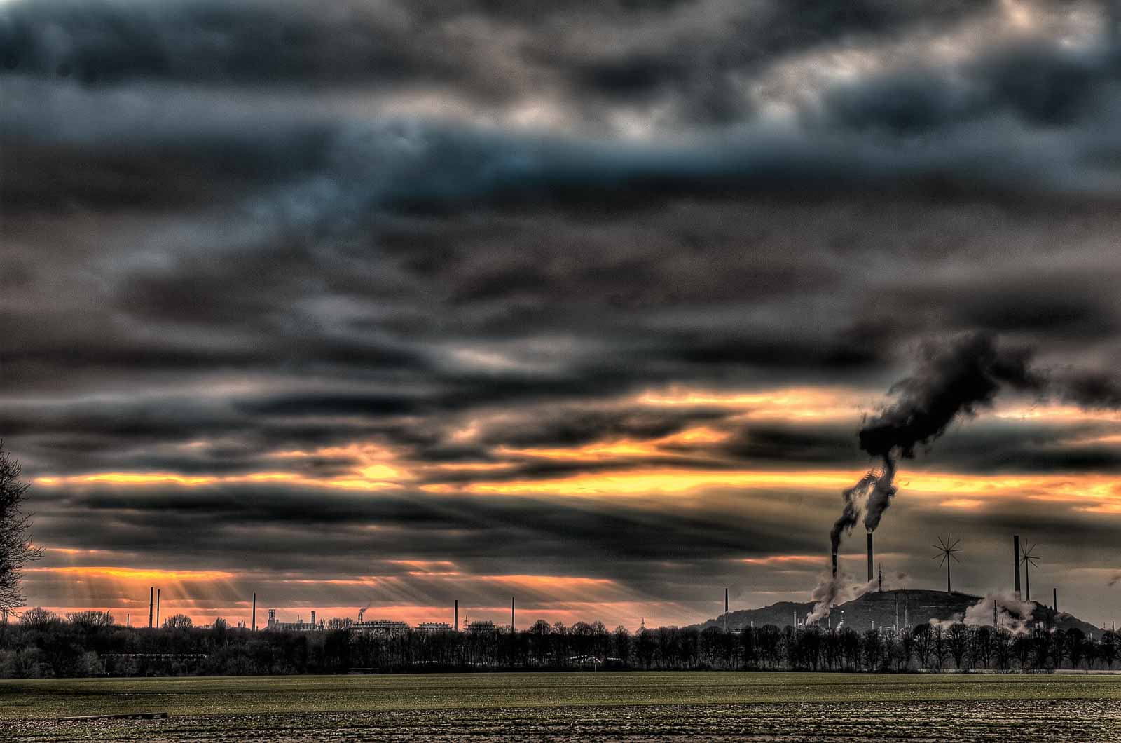 Auf dem Weg in’s Blaue sahen wir aus der Ferne die Schlote vom Kraftwerk Scholven in den wolkigen Himmel qualmen. Die tief stehende Sonne hat die Schwaden und die Wolken sehr dekorativ hinterleuchtet. wir waren aber zu weit entfernt. So entstand der spontane Plan, in genau die Richtung nach Gladbeck zu fahren. Einen Feldweg als Abkürzung benutzend hielten wir an der Wegkreuzung, weil wir von dort aus die Straße überquerend das Schauspiel einfangen konnten.