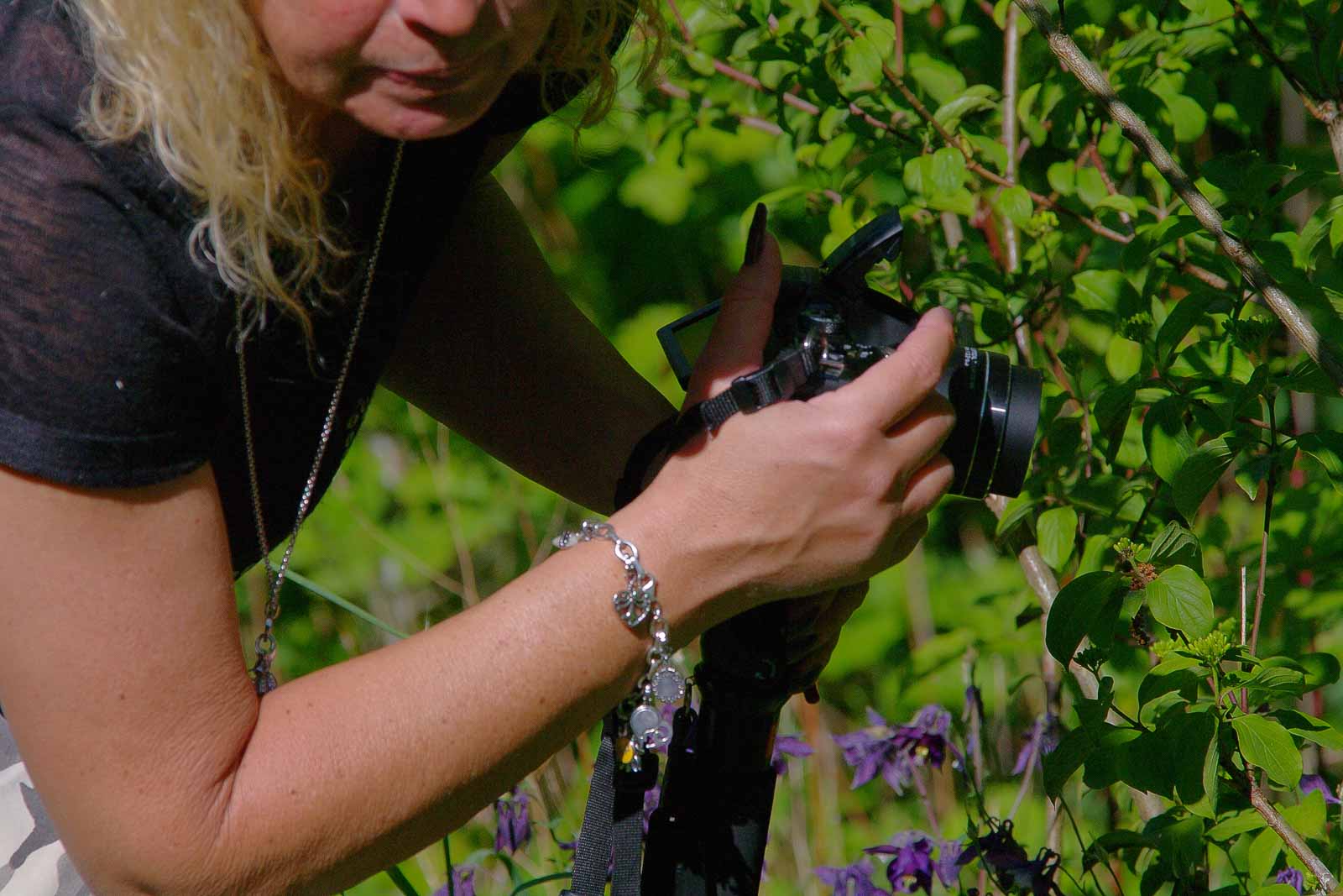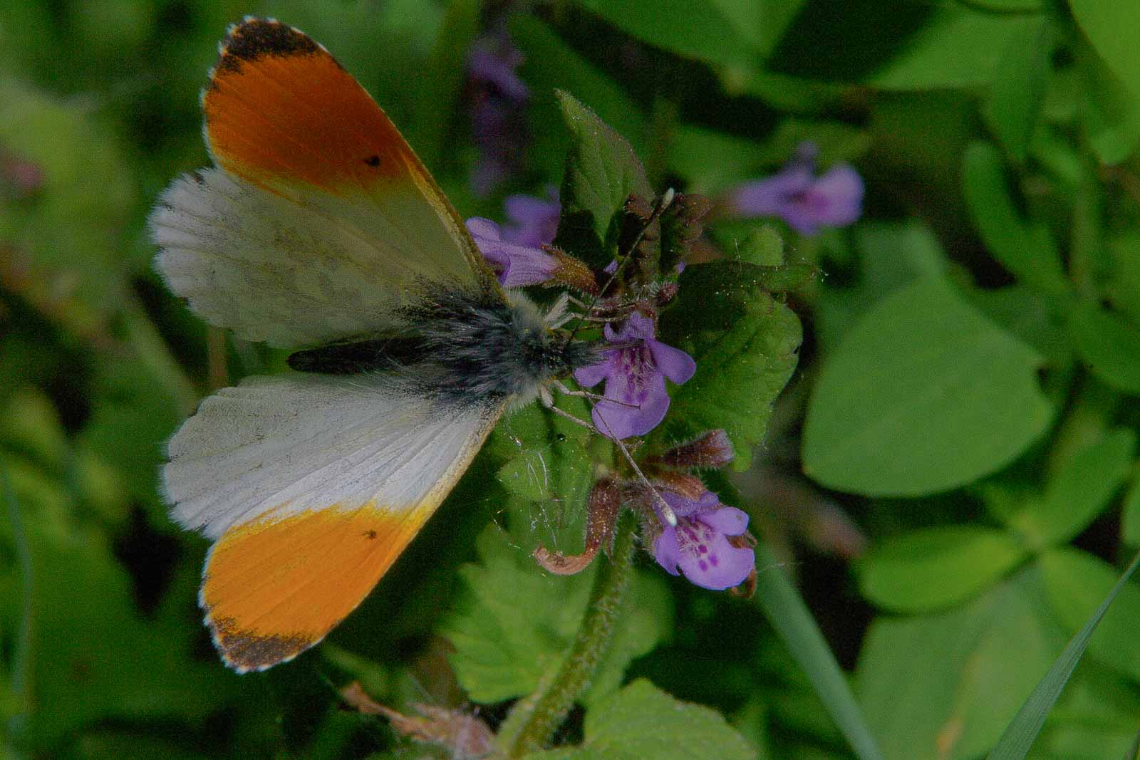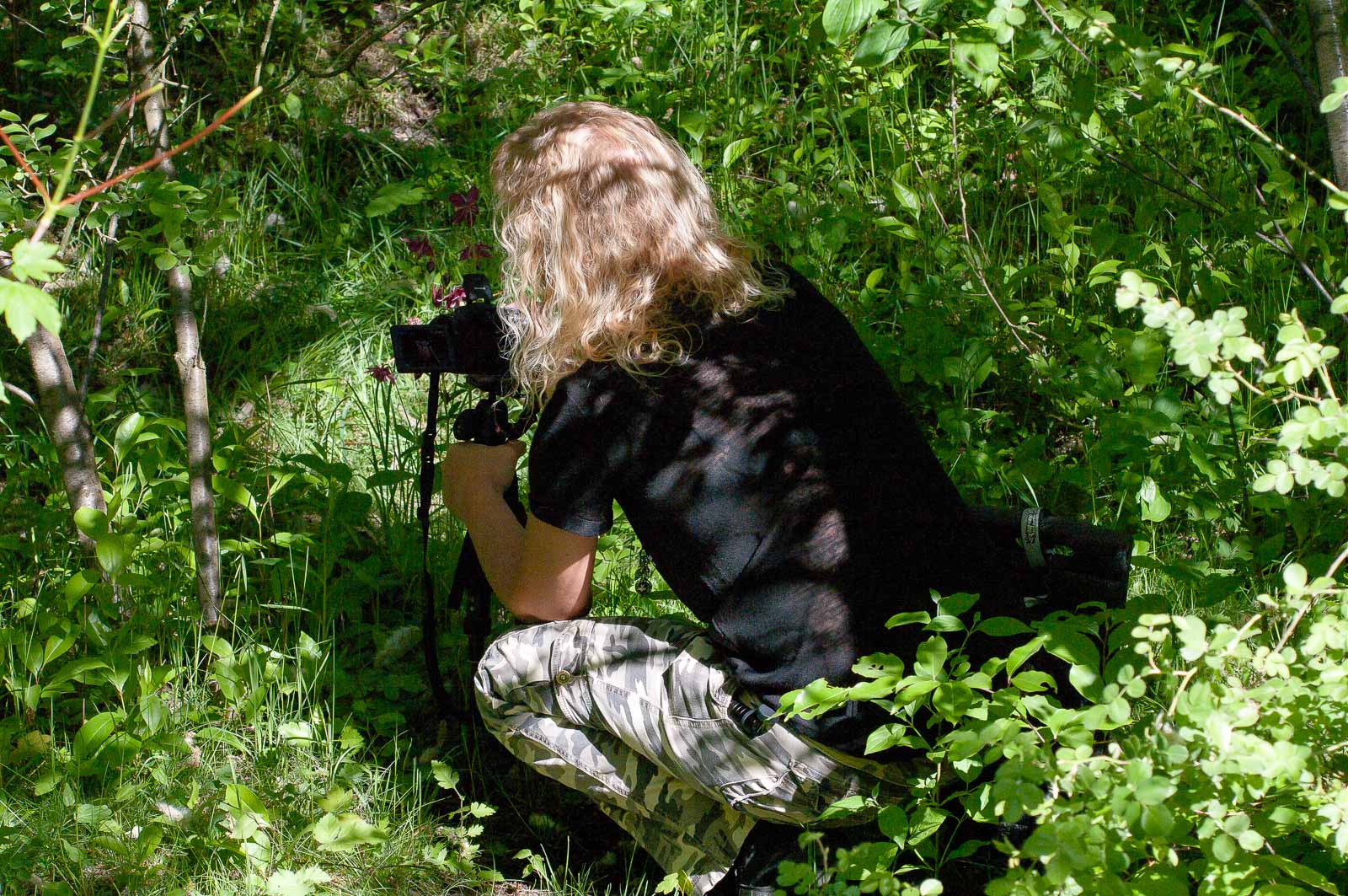 Die Aufwärmphase verbrachte das Schatzi im feucht-schattigen Gebüsch beim Akelei. Sie war aber nicht alleine. Aufmerksame weil hungrige und ausschließlich nach Blut rünstende Stechmücken hielten sich zuerst noch verborgen, griffen dann aber unbemerkt aus dem Hinterhalt an und das zarte Leibchen war wie ’ne Einladung für die. Die stachen einfach da durch. Sie hätte auch gleich nackt da tanzen können. Was ich persönlich nicht sooo schlecht gefunden hätte, wenn die Gegend menschenleer geblieben wäre. Zumindest die Mücken hatten ihren Spaß.