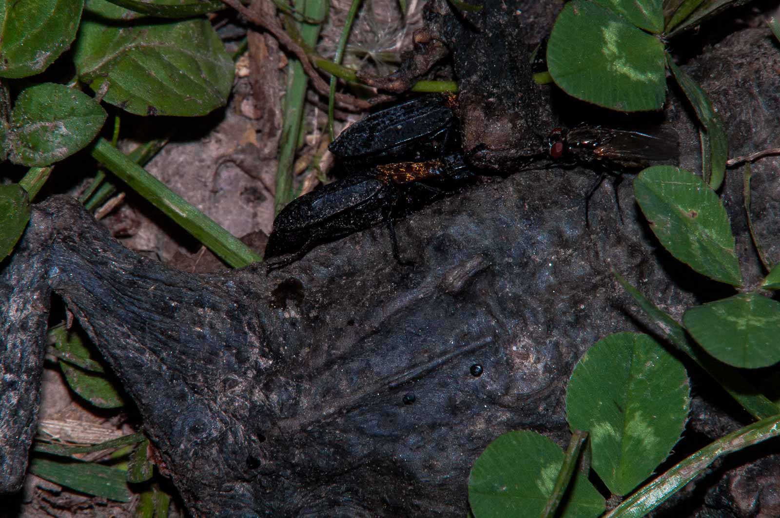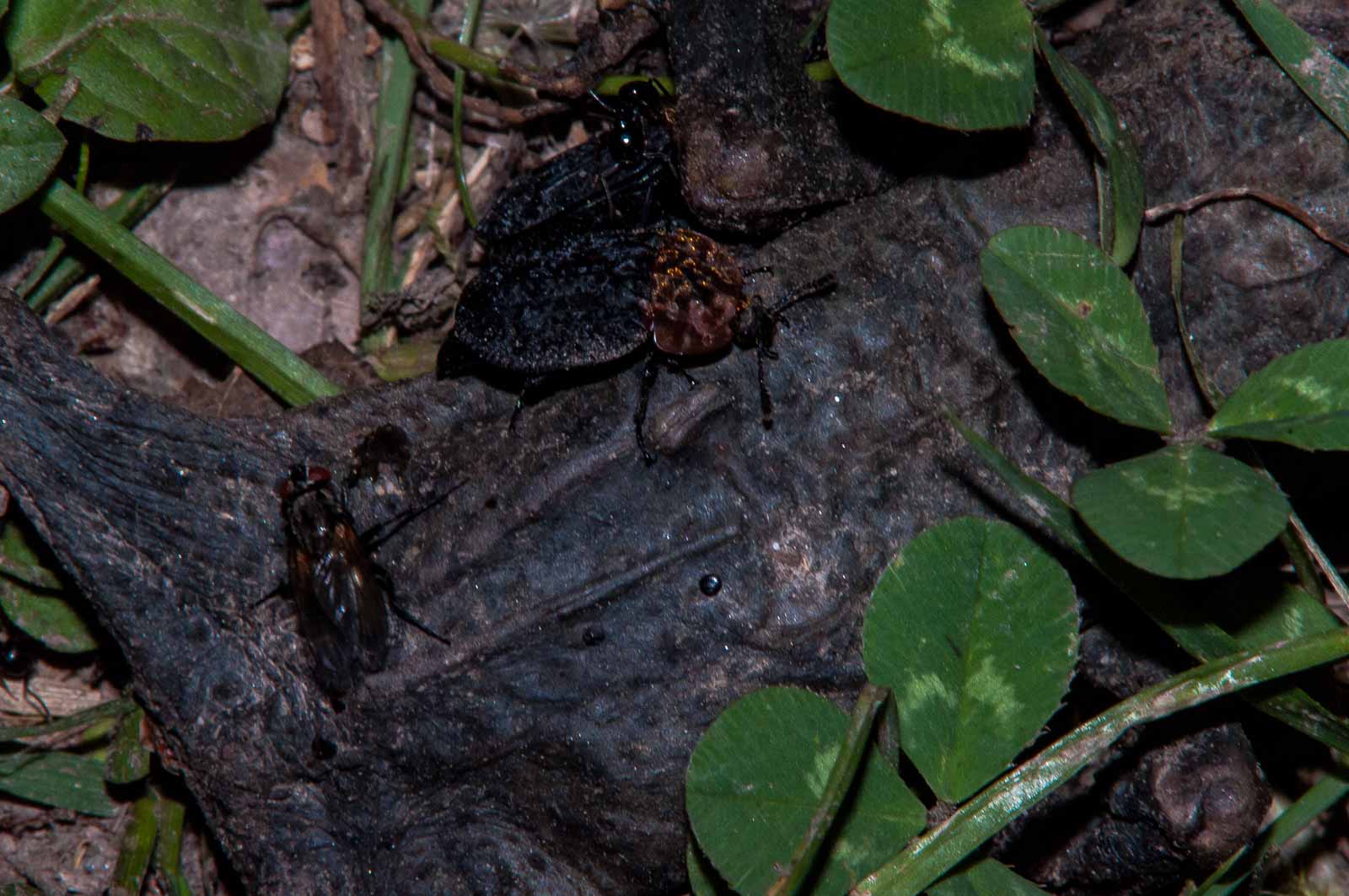 Auf dem weiteren Weg bemerkten wir viele kleine und große blauschwarze Mistkäter, die allesamt auf dem Rücken liegend die letzten Zuckungen machten. Unsere Reanimationsbemühungen blieben erfolglos. Der Lebenszyklus der Käfer nahm unweigerlich sein Ende.