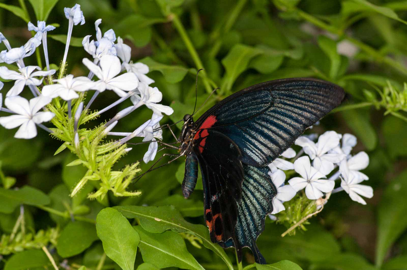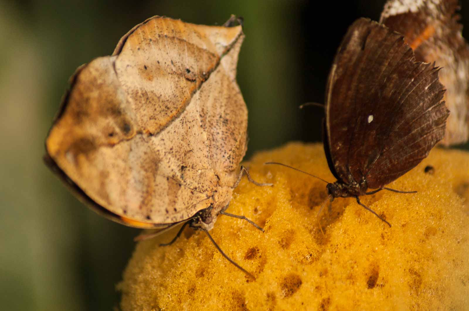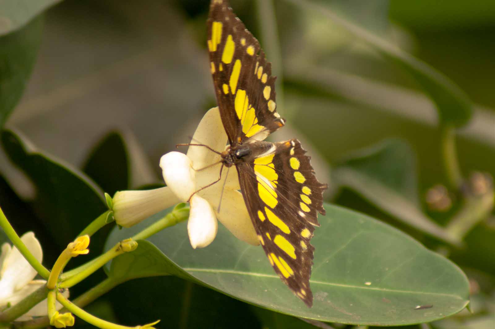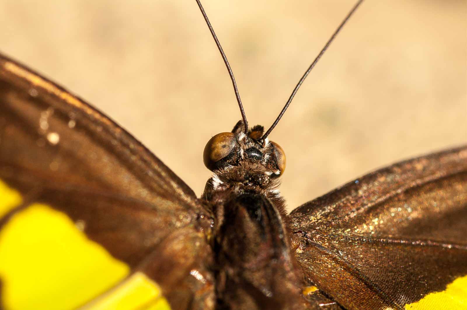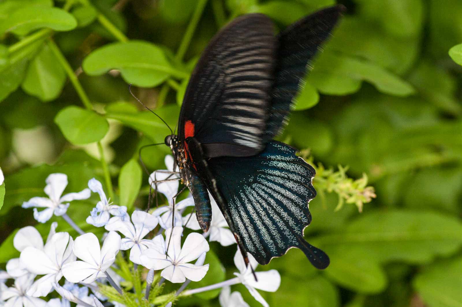 Die nachfolgenden Abbildungen der hier gesehenen Schmetterlinge ersetzen keinesfalls die Live-Show, die uns hier geboten wurde. Zumal ich aufgrund der Größe der Falter und der nicht ganz einfachen Lichtbedingungen mit annähernd Offenblende und mindestens ISO 800 zu belichten versuchte. Hässliche Tiefenunschärfen in entscheidenden Bildbereichen und starkes Bildrauschen trüben aber nicht den Genuss des tatsächlich Gesehenen und Erlebten.