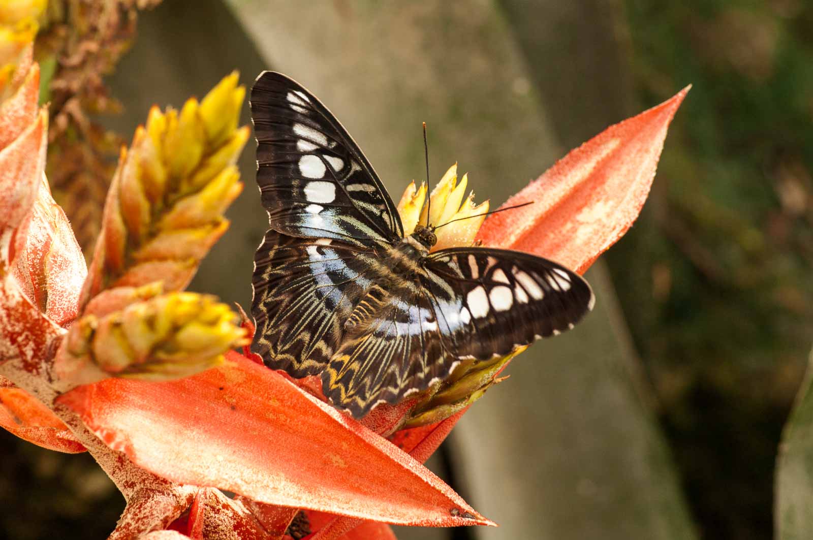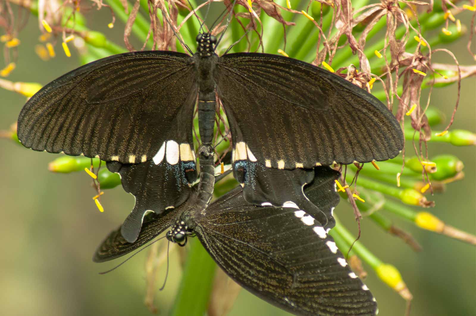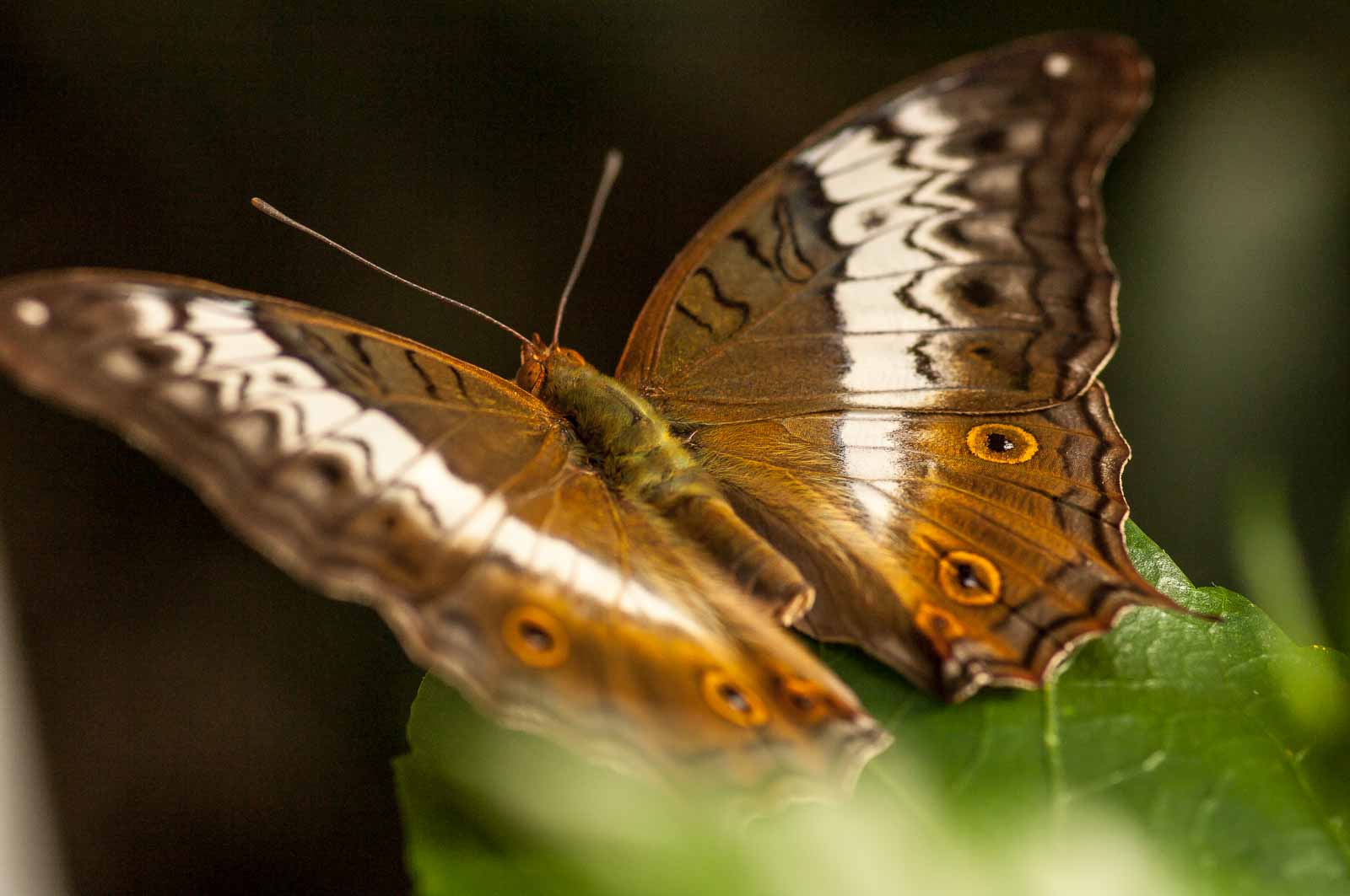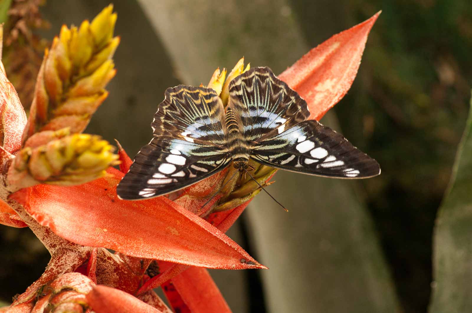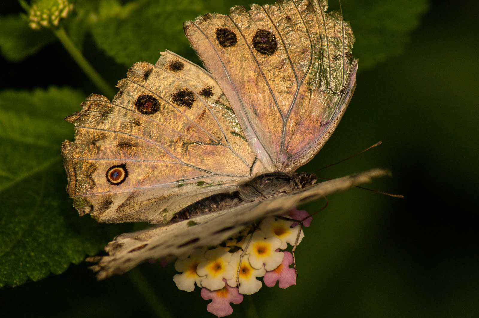 Die nachfolgenden Abbildungen der hier gesehenen Schmetterlinge ersetzen keinesfalls die Live-Show, die uns hier geboten wurde. Zumal ich aufgrund der Größe der Falter und der nicht ganz einfachen Lichtbedingungen mit annähernd Offenblende und mindestens ISO 800 zu belichten versuchte. Hässliche Tiefenunschärfen in entscheidenden Bildbereichen und starkes Bildrauschen trüben aber nicht den Genuss des tatsächlich Gesehenen und Erlebten.