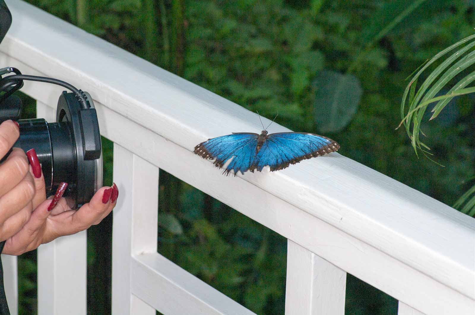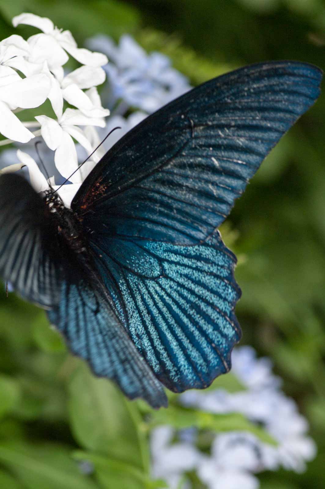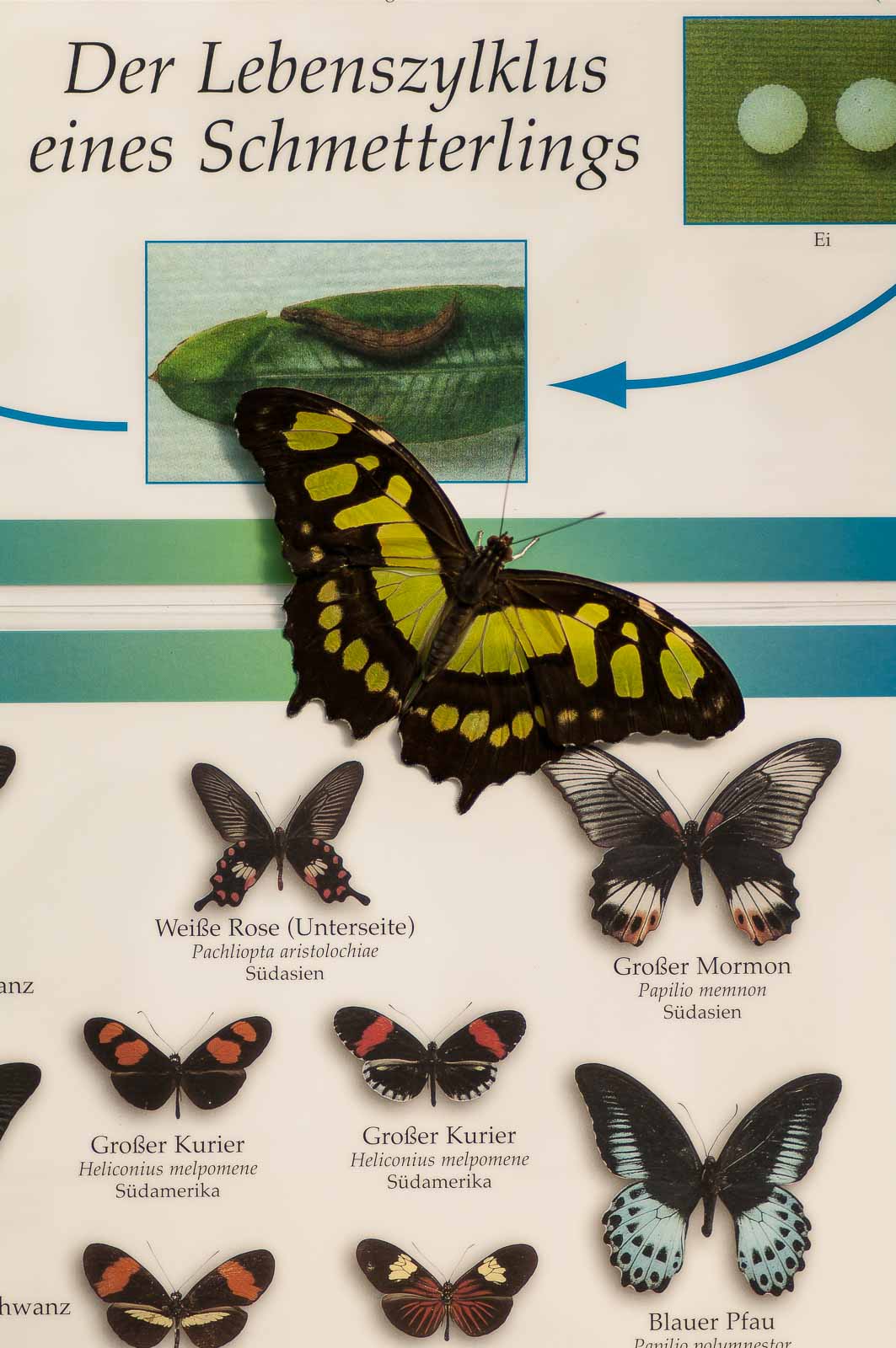 Mein Hauptaugenmerk habe ich leider nur auf die flatternden Exemplare aber nicht auf deren Nachwuchs gelegt. Eier und Raupen habe ich nicht gesucht. Wie ich erst später erfahren habe, wäre die spektakuläre Möglichkeit in greifbare Nähe gerückt, den Schlupf der Falter zu beobachten. Die meisten werden in den Vormittagsstunden „geboren“, und das Schauspiel wird in einem speziell dafür hergerichteten Aufzuchtkasten dem interessiert staunenden Besucher präsentiert.