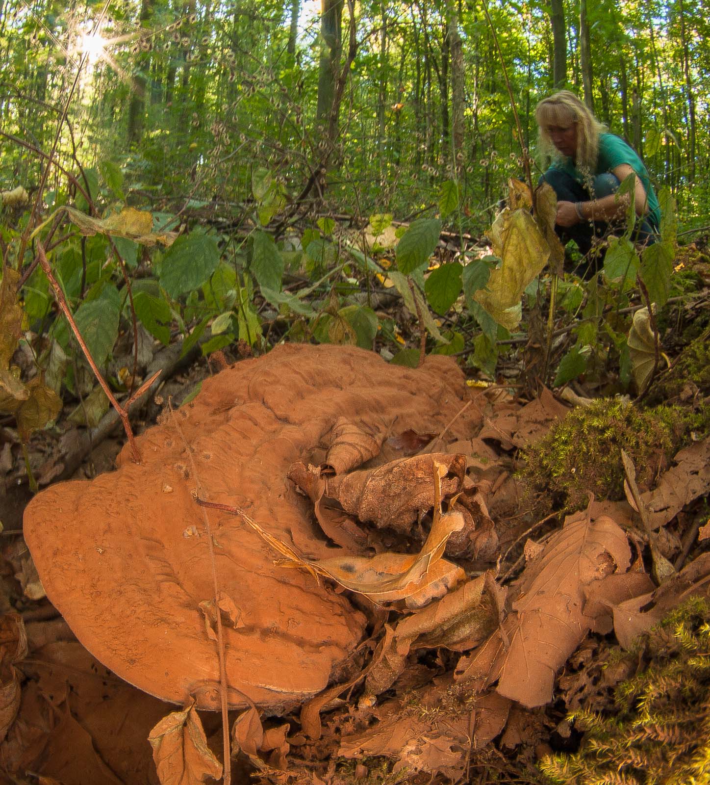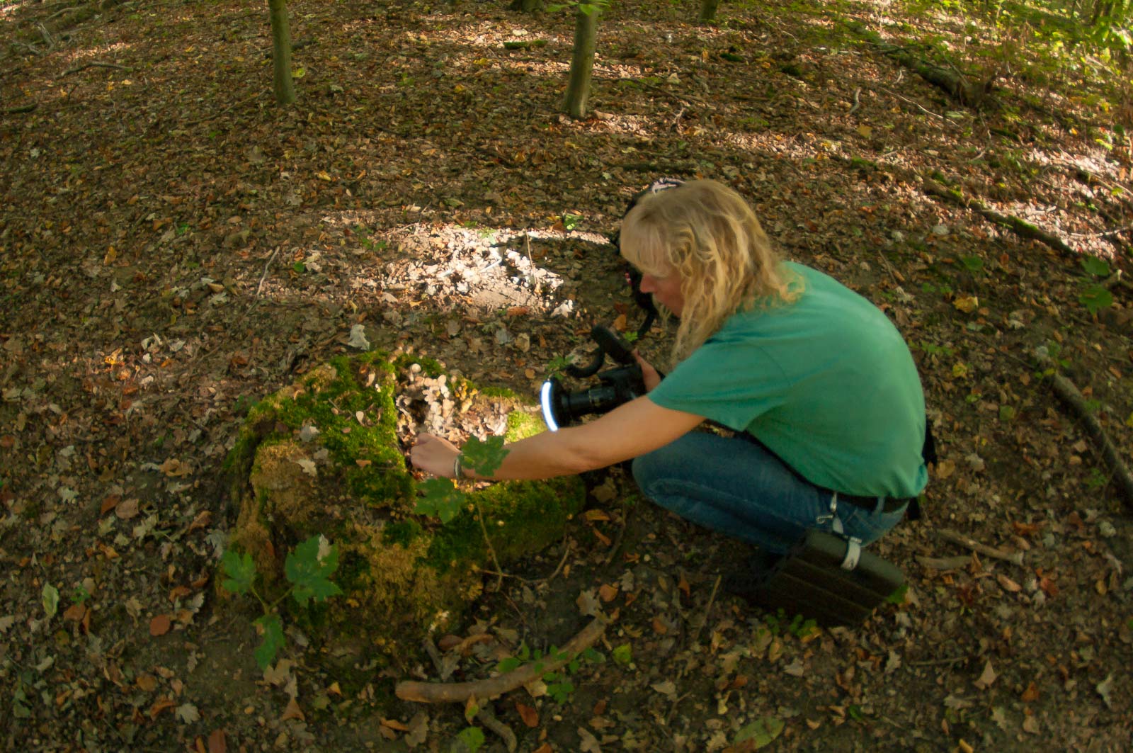 Aufnahmen mit Bodenkontakt der gesamten Körperfläche (einschließlich Kinn) bin ich eigentlich gewöhnt. Obwohl mir diese spezielle Haltung auf die Dauer auch schon unbequem und das Aufrichten in die Lotrechte dann mühselig wird. Ist ja zwar ab und an gemütlich, mal da so rumzuliegen, wenn’s sonnig warm und trocken ist. Aber Pilze haben da so ganz spezielle Lebensräume, die ich mehr so in den Bereich der tropischen Feuchtgebiete einordnen würde. Was dem Pilz gut tut, macht meine Buxe feucht im Schritt. Oder bestenfalls nur die Knie. Und beide Stellen sehen nach getaner Arbeit dann auch nicht wirklich mehr salonfähig aus.