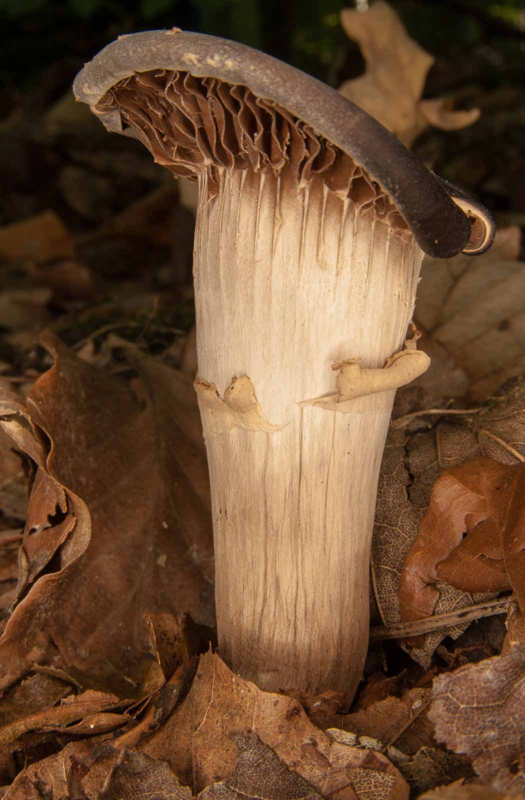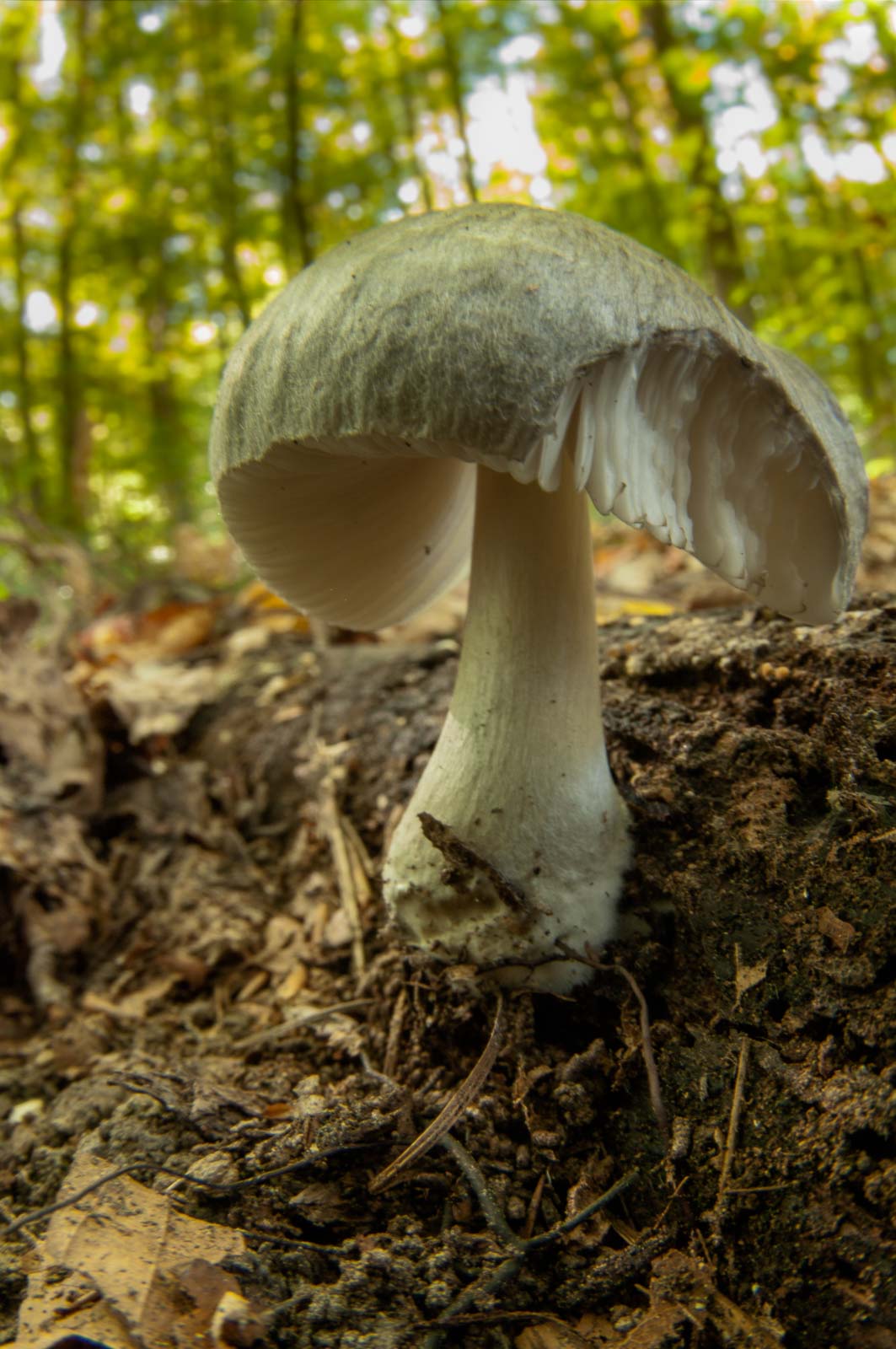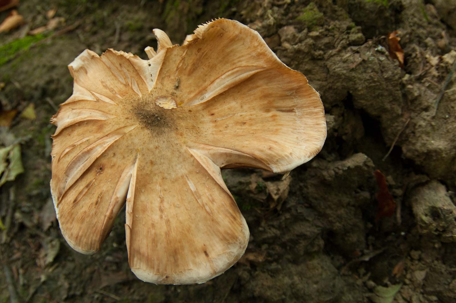 Wenn man denn so’n Pilzhut auch mal von unten – also seine Hutlamellen – sehen möchte, dann muss man ganz tief runter. Und selbst dann ist noch nicht sicher, ob man das, was man will, auch wirklich fotografieren kann: denn entweder ist die Kamera zu groß und unhandlich oder der Pilz ist schlichtweg zu klein für sowas. Oder steht genau da, wo man nicht dran kommt. Und wenn ja, dann den Schauplatz entweder mit von Brennnesseln malträtierten Händen und Unterarmen und von Brombeersträuchern zerfetzten Kleidungsstücken verlässt. Da sind die Kletten an den Textilien noch harmlos. Die klauen einem nur Lebenszeit beim Abknibbeln.
