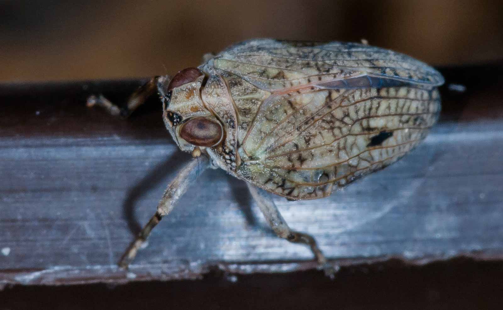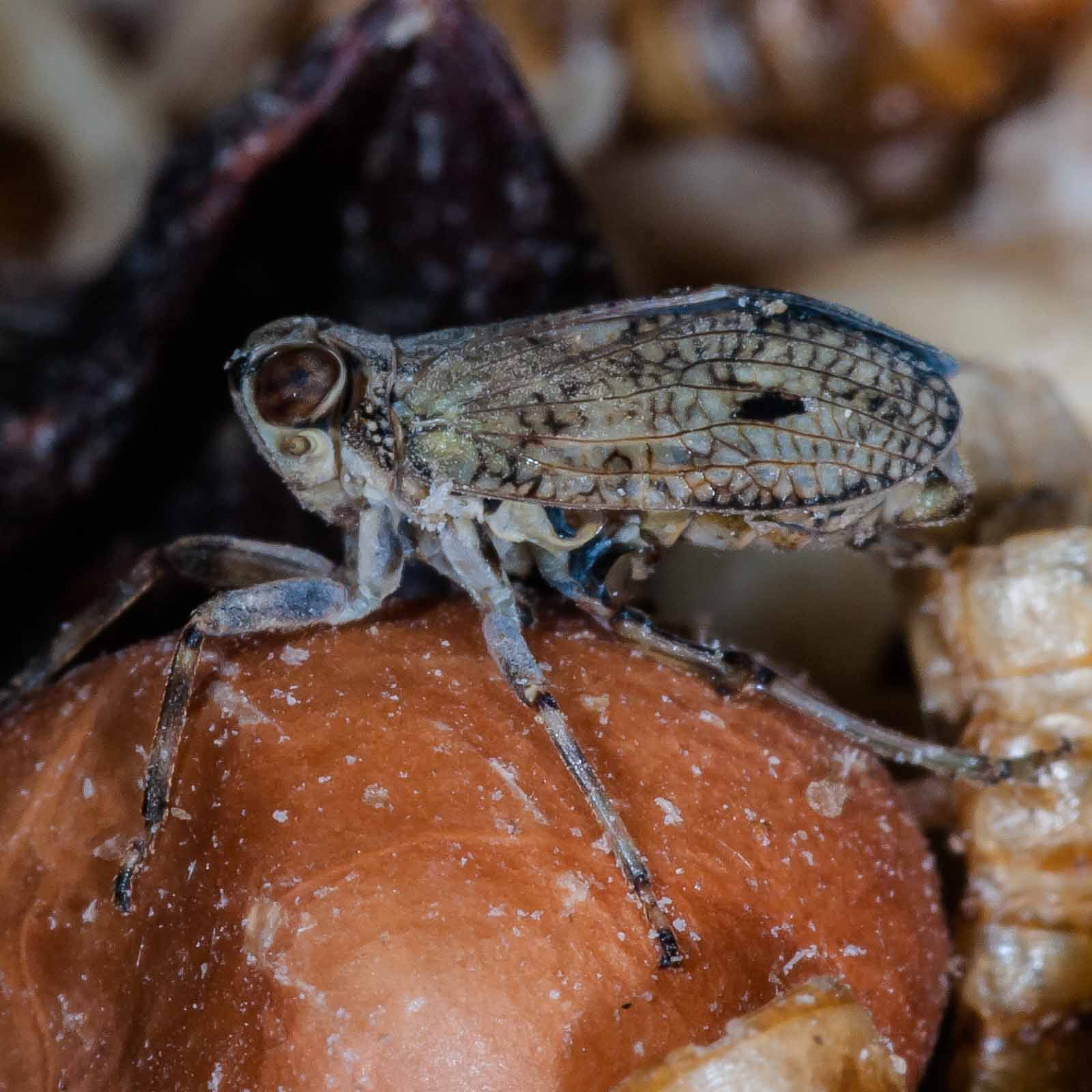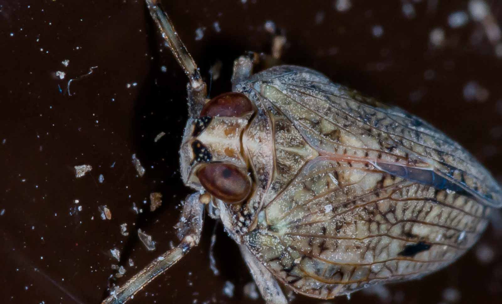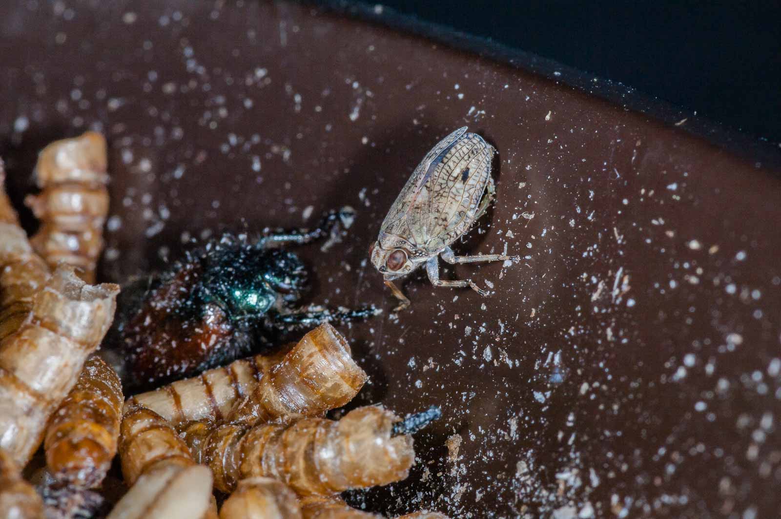 Wir fanden eine Echte Käferzikade, die sich an einem Meisenknödel zu schaffen machte und ein Käfer, der die Zikade im Vogelfutterteller um Hilfe angefleht hatte, bevor er starb.