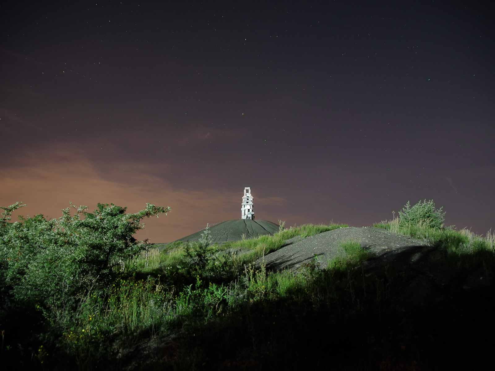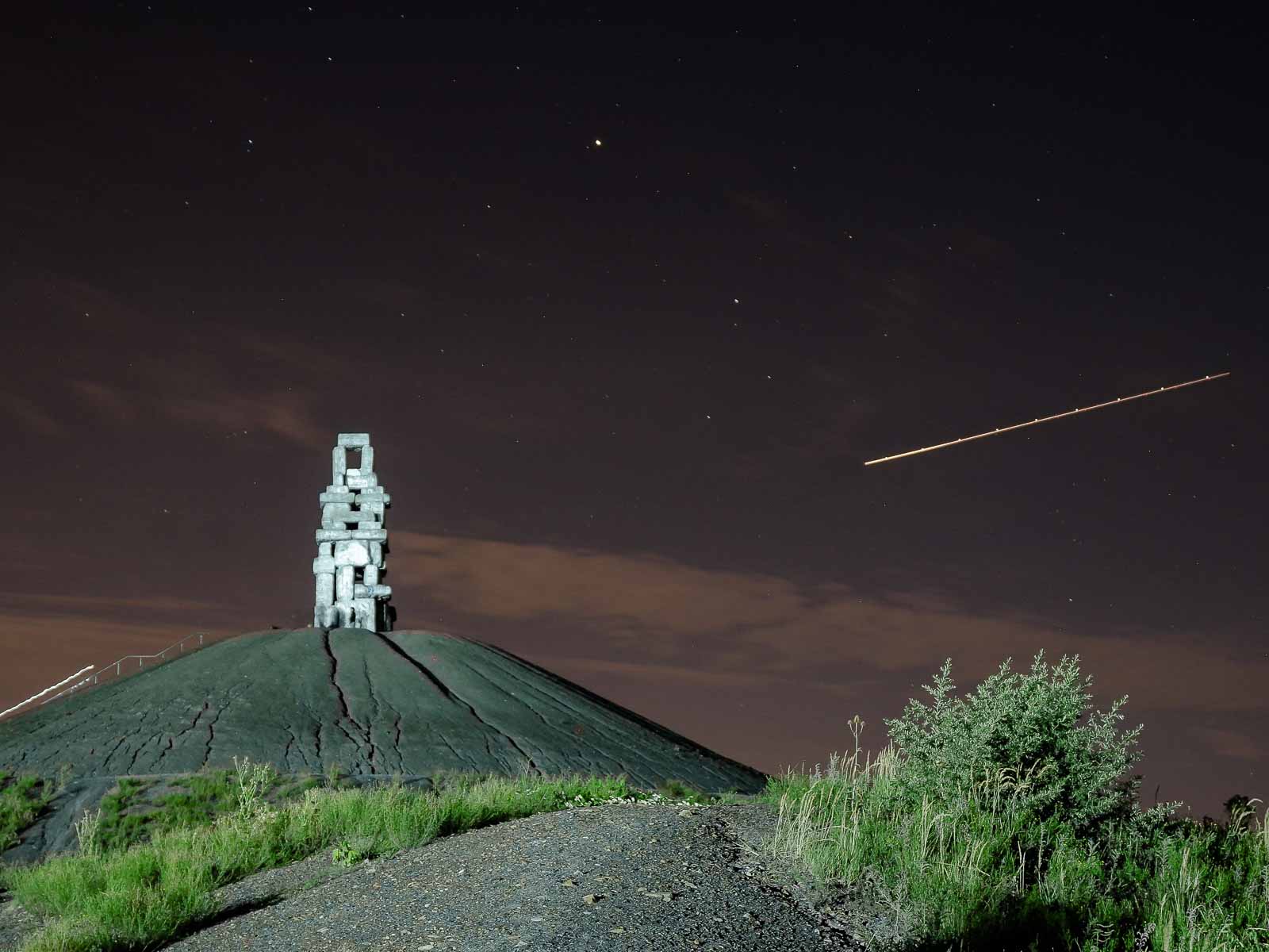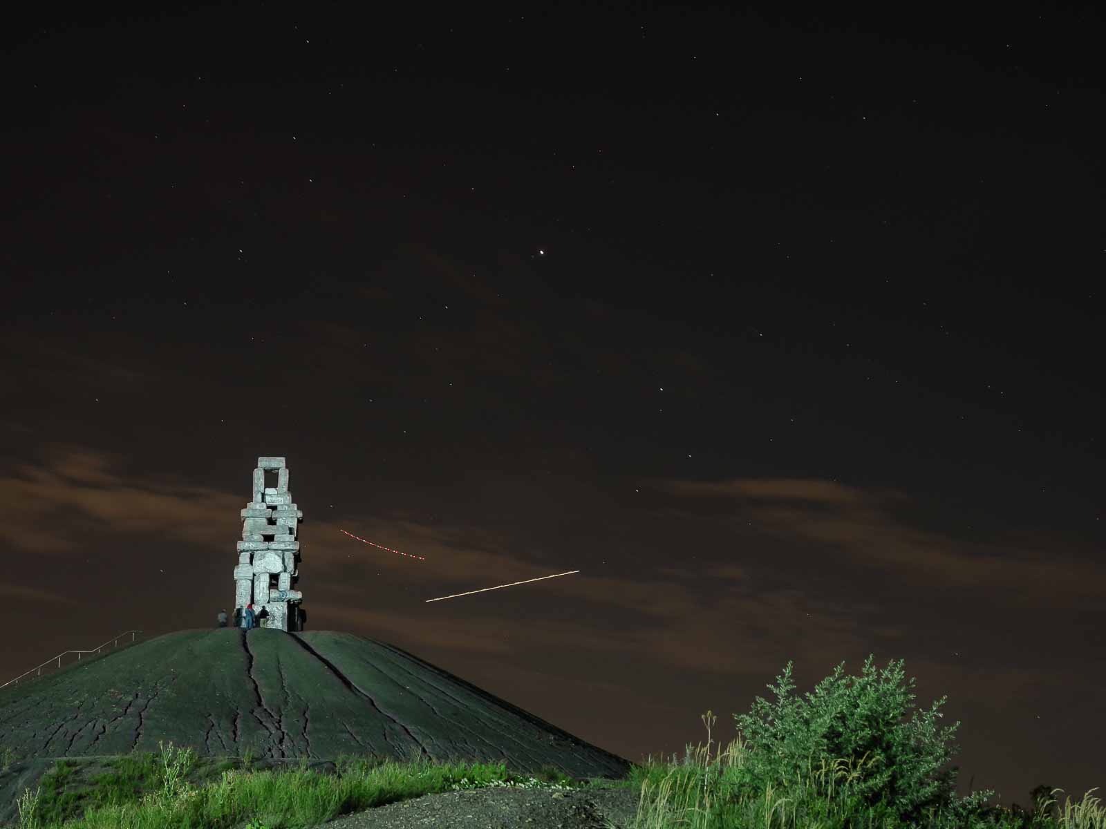 Weil ich also hier, mitten auf der Landebahn des nächtlich hell erleuchteten Musems der Republik, in der Lage war, einen insgesamt schwach sichtbaren Sternenhimmel, dessen Sternbilder ich aufgrund der unsäglichen Lichtverschmutzung selbst mit blossem Auge nicht richtig identifizieren konnte, mit der K-01 sichtbar zu machen, beratschlagte ich ich mich zwecks passender Standortwahl mit dem Schatzi. Sie erinnerte sich, dass die Halde Rheinelbe doch so’ne mittelgroße Skulptur auf die Kuppe aufgepflanzt bekommen hatte, und der ansonsten uselige Betonklotz mit dem verführerischen Namen „Himmelsleiter“ sich bestimmt ganz nett in das geplante Projekt „Sternspuren“ einfügen lässt.