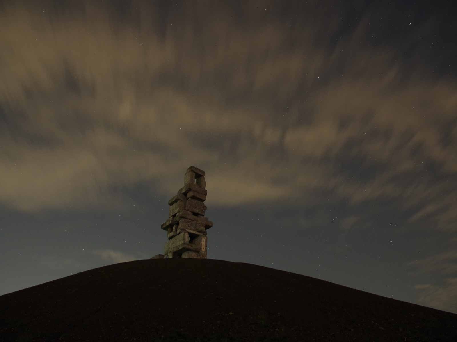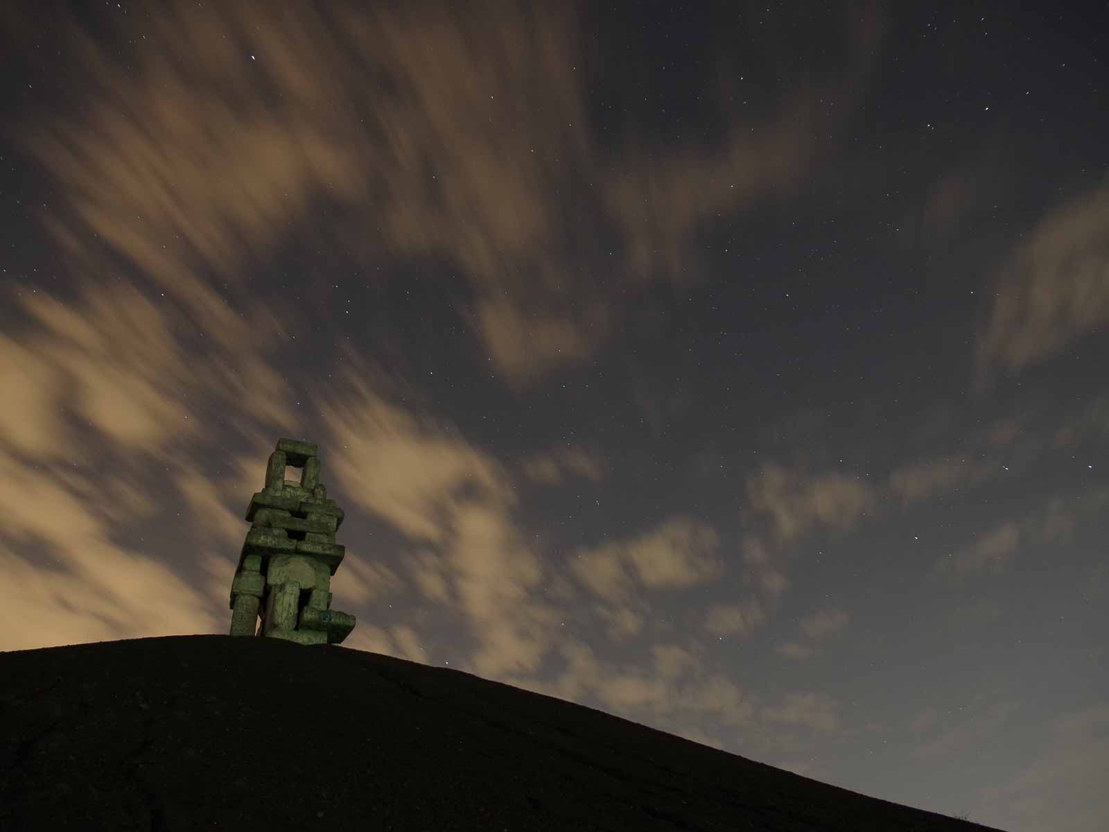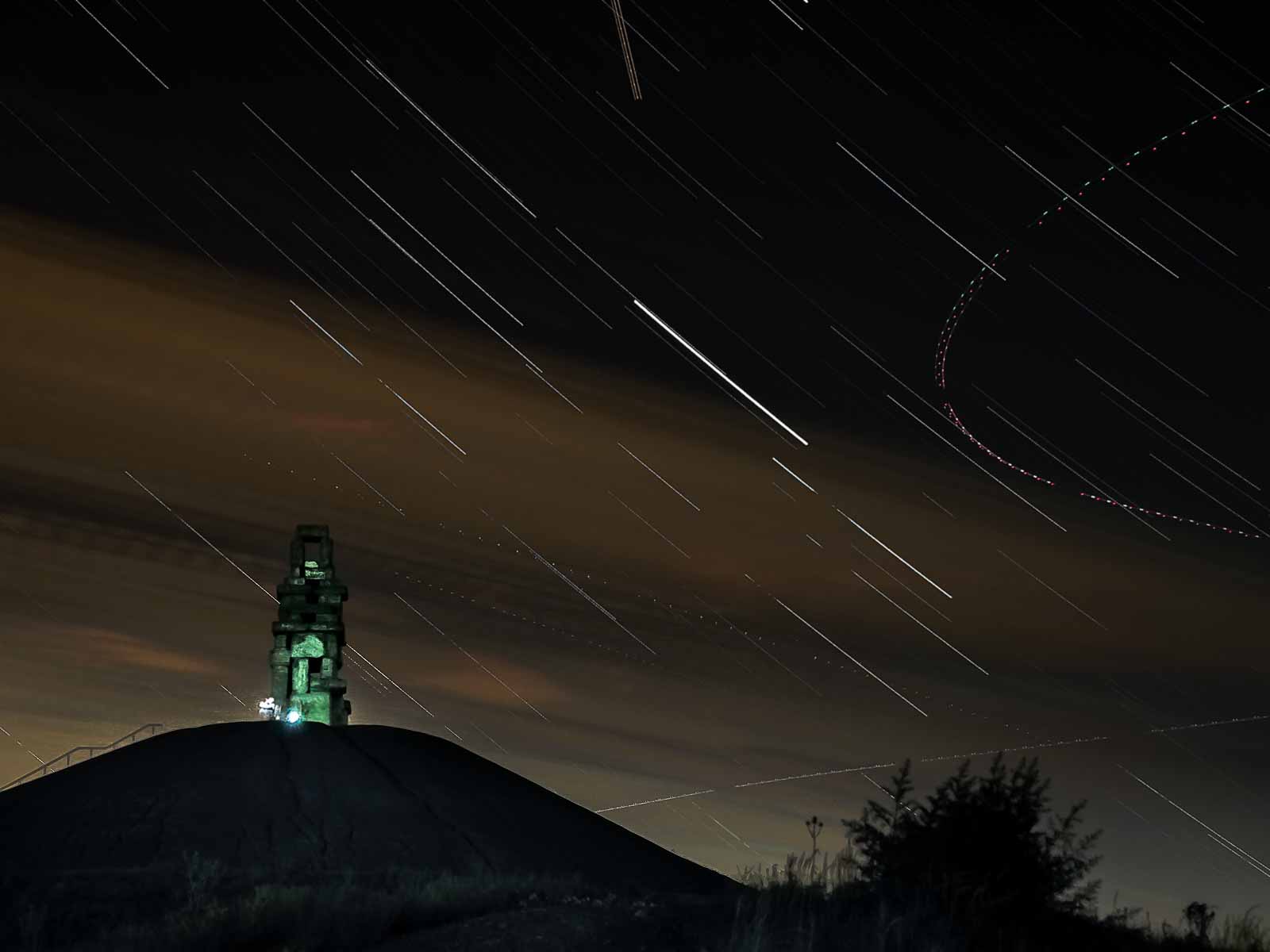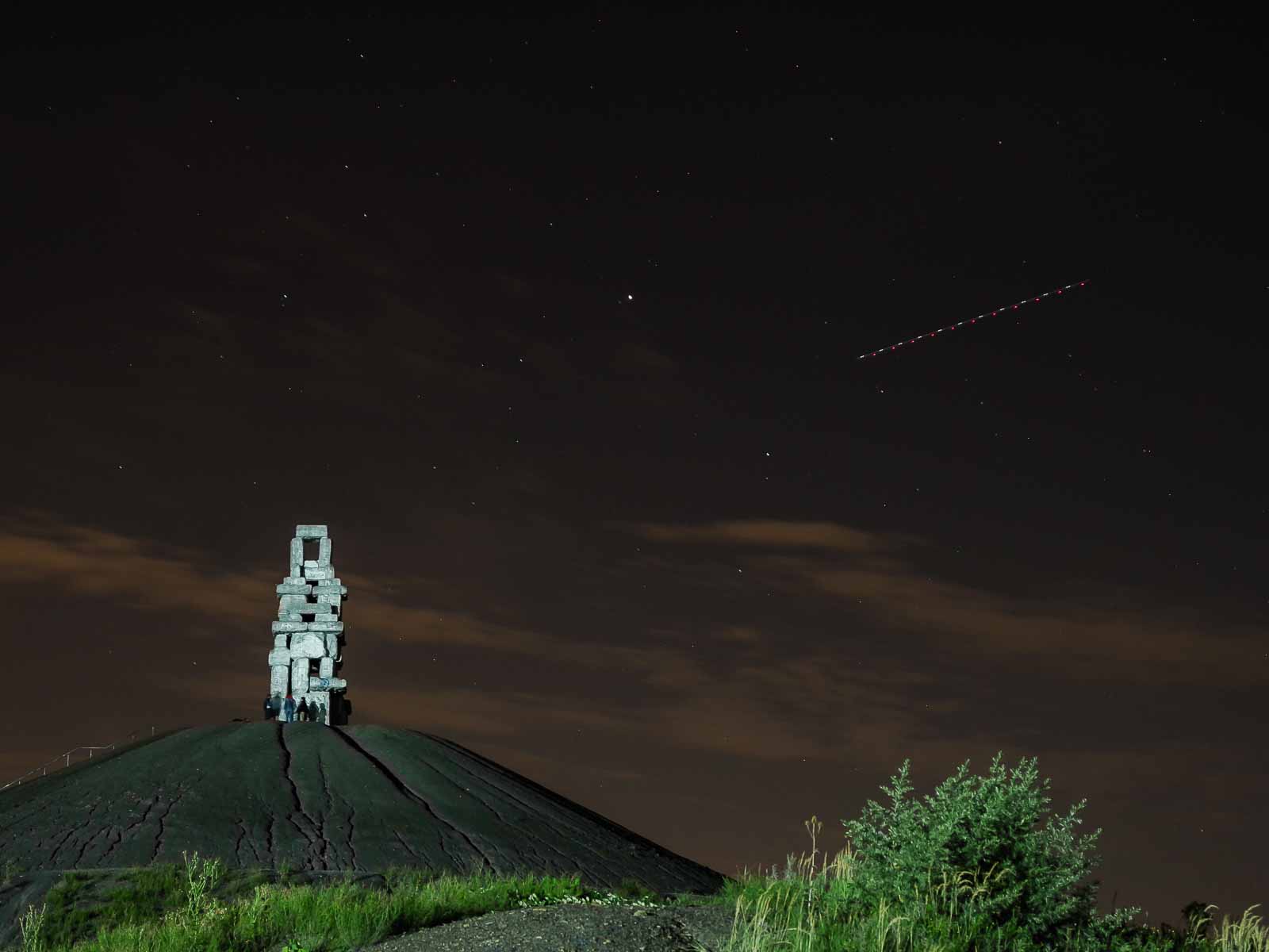 Weil ich also hier, mitten auf der Landebahn des nächtlich hell erleuchteten Musems der Republik, in der Lage war, einen insgesamt schwach sichtbaren Sternenhimmel, dessen Sternbilder ich aufgrund der unsäglichen Lichtverschmutzung selbst mit blossem Auge nicht richtig identifizieren konnte, mit der K-01 sichtbar zu machen, beratschlagte ich ich mich zwecks passender Standortwahl mit dem Schatzi. Sie erinnerte sich, dass die Halde Rheinelbe doch so’ne mittelgroße Skulptur auf die Kuppe aufgepflanzt bekommen hatte, und der ansonsten uselige Betonklotz mit dem verführerischen Namen „Himmelsleiter“ sich bestimmt ganz nett in das geplante Projekt „Sternspuren“ einfügen lässt.