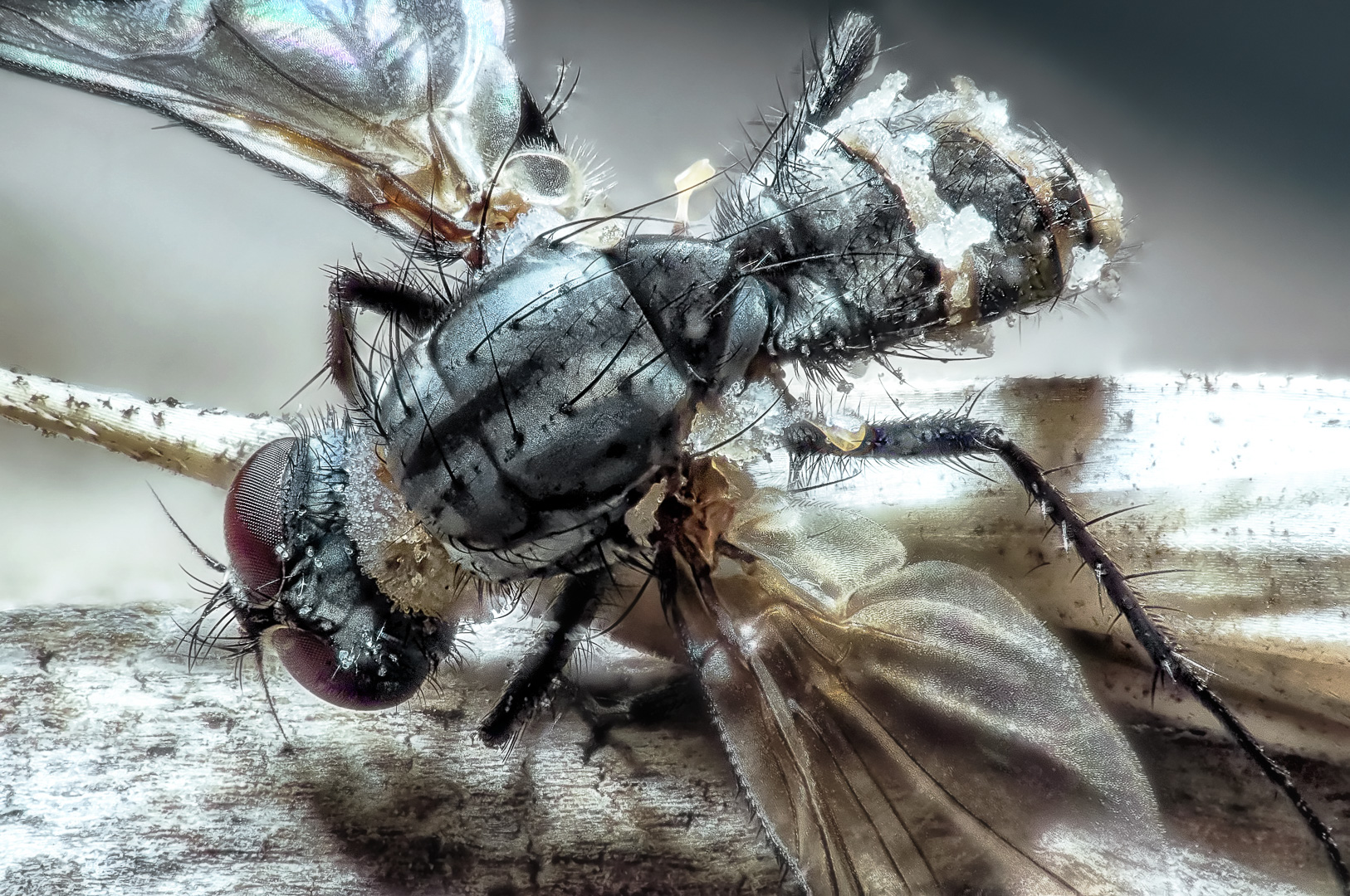 Die Fliege hab ich im Garten von Haus Graf Adolf in Wattenscheid gefunden. Sie war bereits tot. Der von innen herauswachsende Pilz hat sie umgebracht.