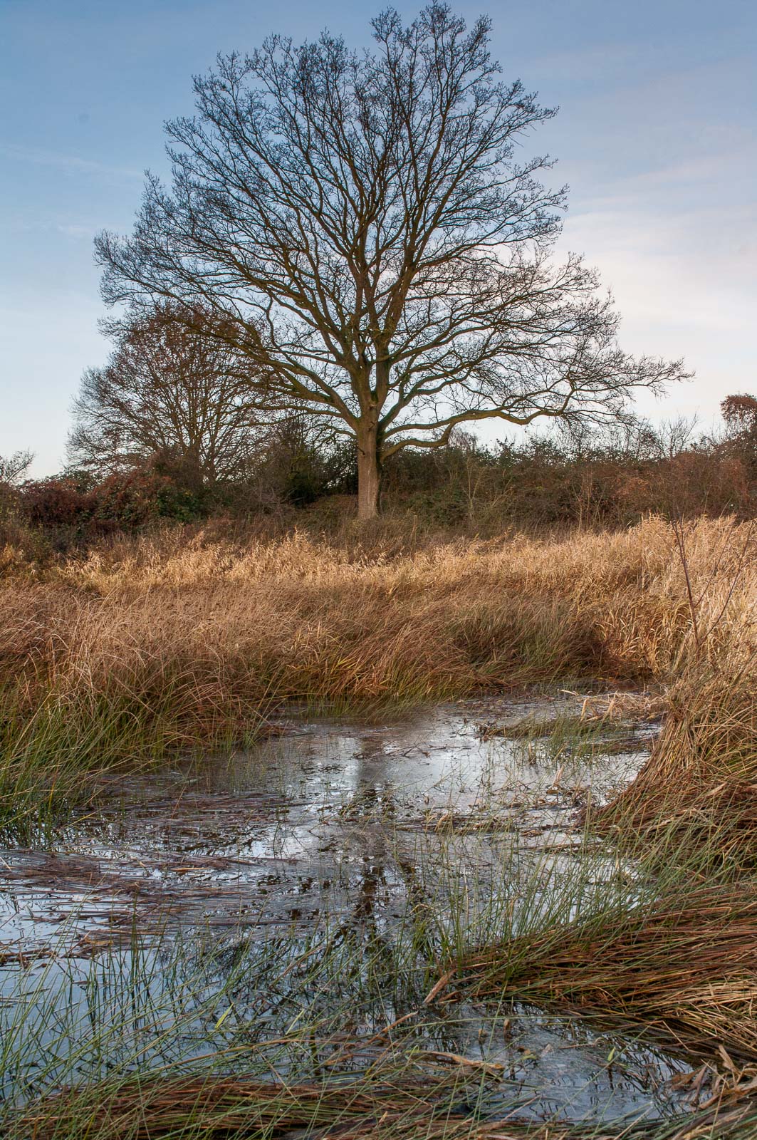 das Wetter war wie vorhergesagt frostig-kalt, aber trocken und zwischendurch sogar sonnig. Aufgrund der Jahreszeit stand der Lorenz natürlich jetzt fast an seiner tiefsten Stelle über dem Horizont und blendete durch sein Gegenlicht dadurch schon ganz ordentlich. Landschaftsfotos waren damit also schon mal nicht so ohne Weiteres möglich. Aber es gab ja in unmittelbarer Nähe noch das andere Ziel: die alte Wassermühle.