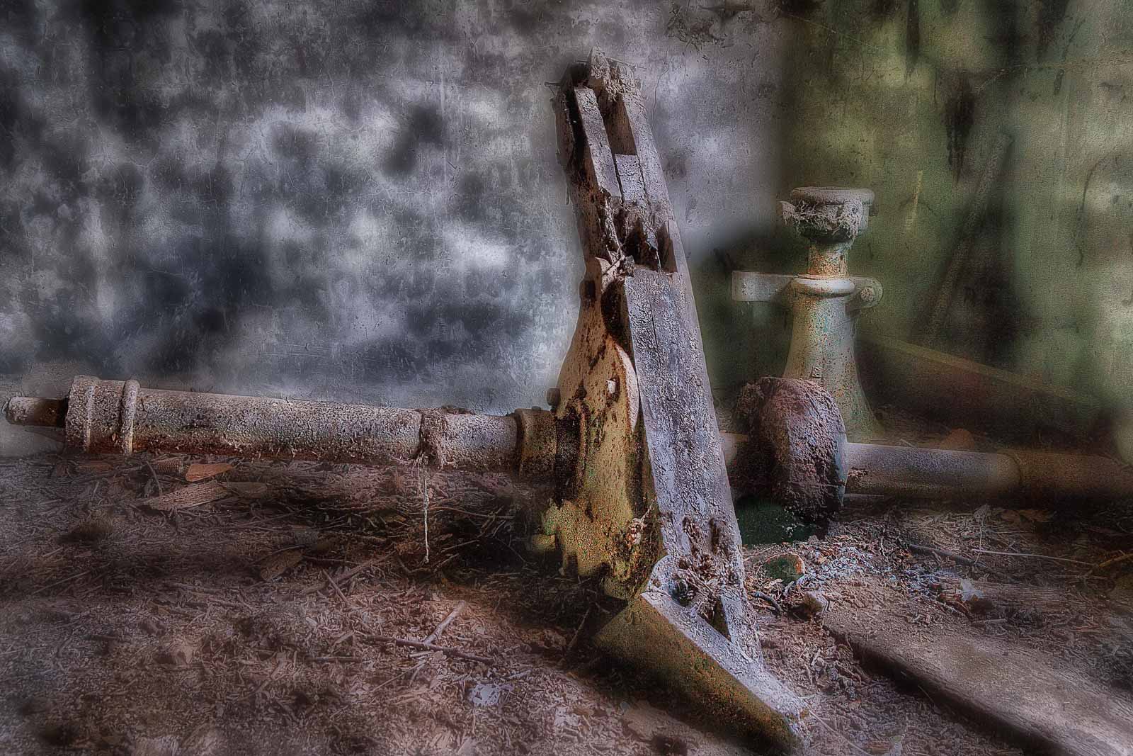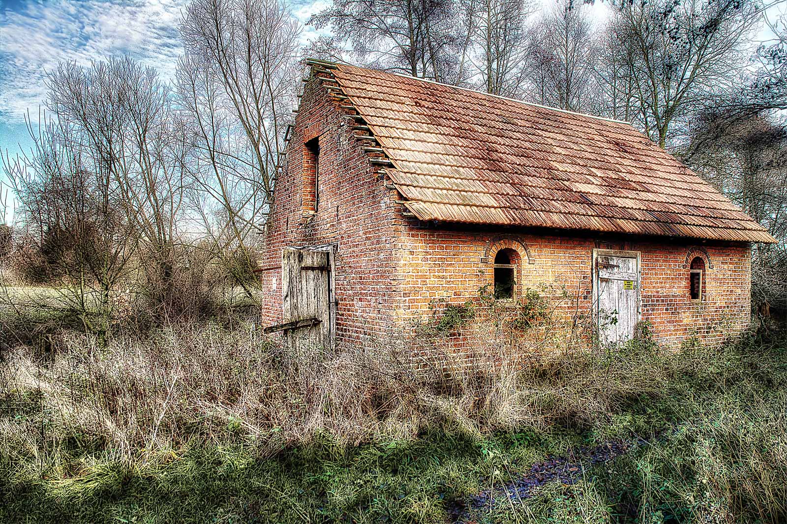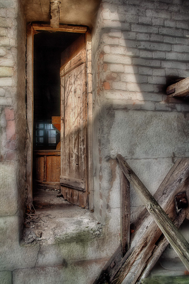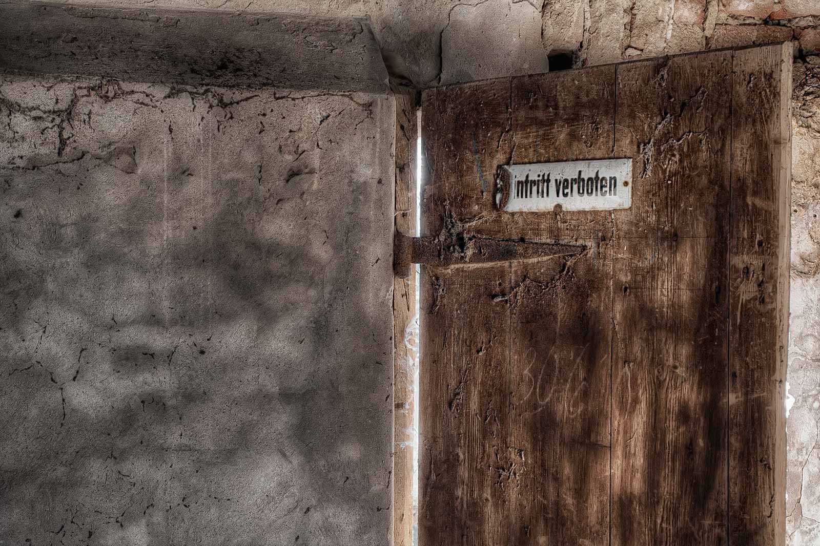 Ich tummelte mich erst draussen auf dem plattgesensten Gelände rum, um die eine und andere Aussenaufnahme der alten Gebäude zu machen. Heute war mal wieder HDR angesagt. Aber weil ich ständig aufpassen musste, dass mich keiner erwischt, konnte ich das Stativ nicht aufstellen und musste versuchen, die Bildreihen freihändig zu machen.