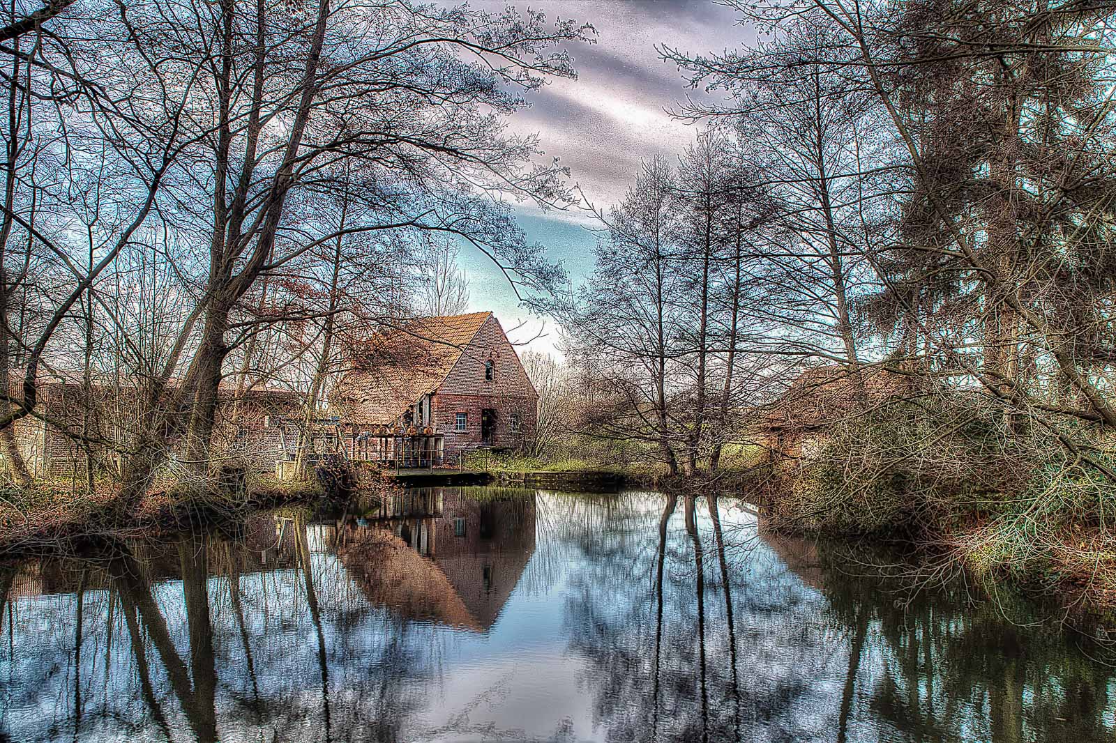 Das war auch spannend. Weil man vom Hauptwohnhaus der Familie Egberdings direkt auf die Mühle gucken konnte und ich nicht sicher war, ob sich hinter den Fenstern nicht doch irgendwann zufällig mal einer hinstellt und mal so doof rausguckt um dann ausgerechnet mich am Flußufer kletternd zu erspähen …