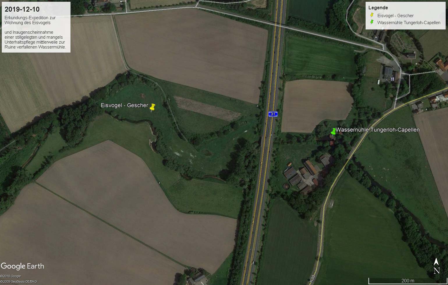 war auch nur noch einige Schritte entfernt. Und ich wurde – Google Earth sei Dank !! – in meiner Annahme bestätigt: die Auenlandschaft ist fernab jeglicher Störungen. Nur der Verkehr auf der A31 macht vergleichsweise einen Höllenlärm. Aber den Eisvogel stört das nicht. Der lebt ja am Wasser und hat mit Autobahnen nun auch eher weniger was an der Mütze.