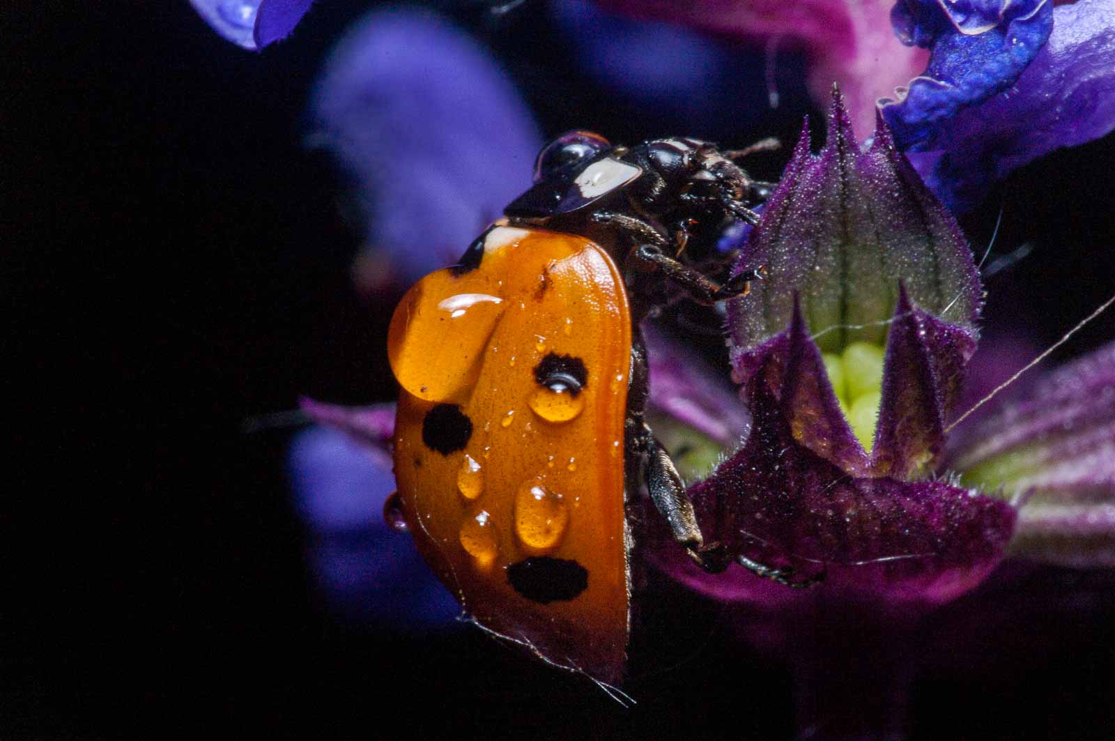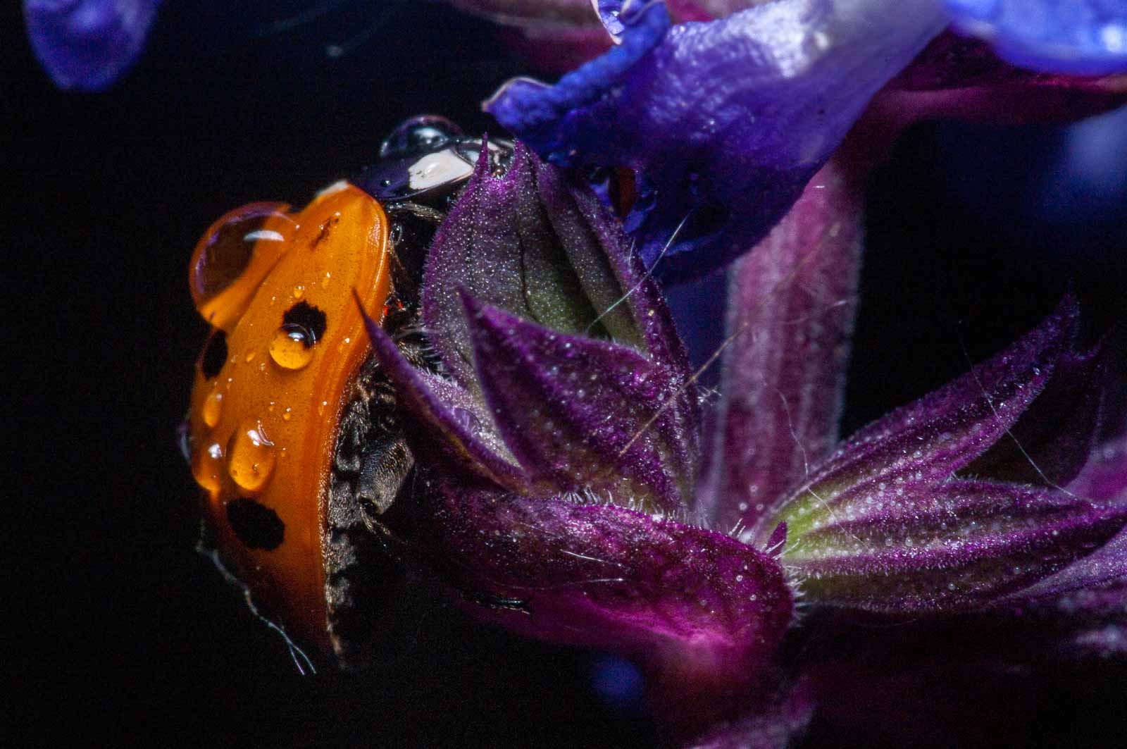Ein Marienkäfer hat es sich auch auf dem Salbei gemütlich gemacht und nuckelte unbeeindruckt vom Regen an den leckeren Blüten. Sollen sich doch andere úm die doofen Blattläuse kümmern …