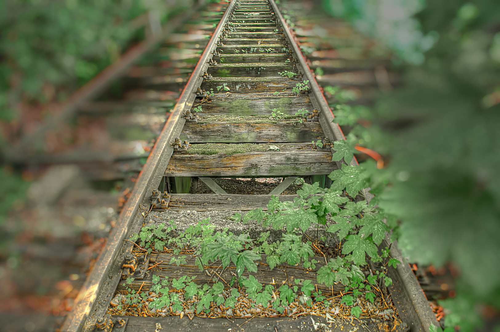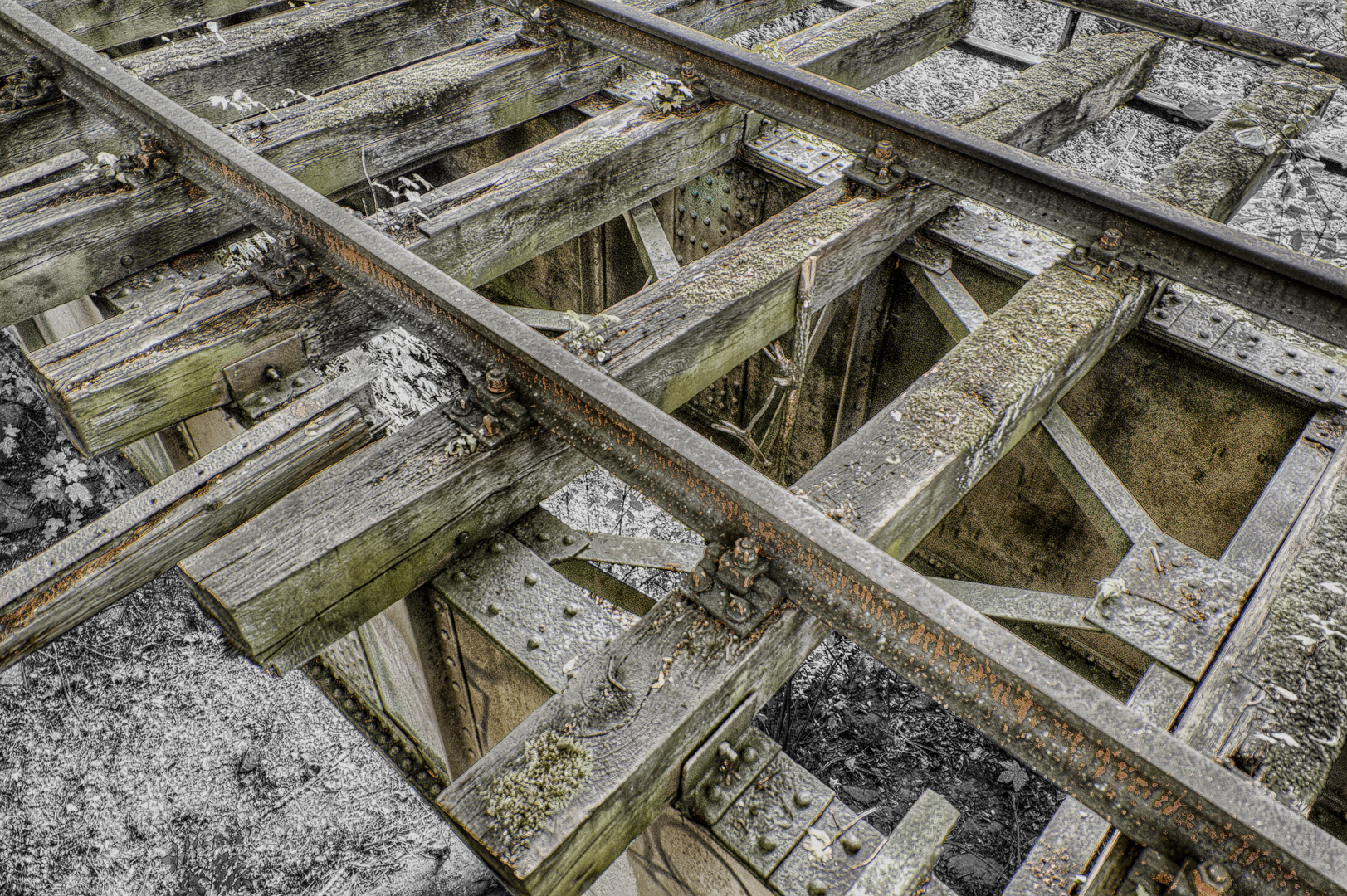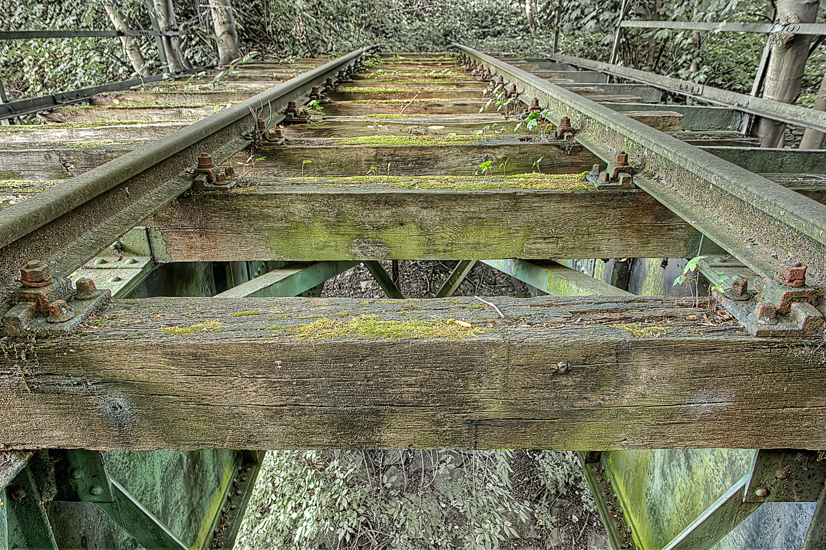 Die heutige Eisenbahnbrücke, die über den in der Vergangenheit aus der Not heraus für den hoffnungslos überzogenen Bevölkerungszuwachs wie die Emscher als Abwasserkanal zweckentfremdeten Hellbach führte, entdeckte ich bei einer vorangegangenen Expedition wieder mehr so zufällig bei einem anders gewählten Rückweg, über den ich die Streckenführung und markante Wegpunkte herausfinden wollte. Und siehe da: in einer Wegbiegung lag sie dann auch, unter Büschen und Bäumen versteckt und fast komplett zugewuchert. Und natürlich auch extrem baufällig. Wobei das massive Traggerüst aus Kruppstahl immer noch topp aussieht. Wäre der Stahl damals schon aus China importiert worden, würde die Brücke wohl heute nicht mehr stehen. Nur die Gleisbettholzbalken sind zwischenzeitlich verrottet oder geklaut worden.