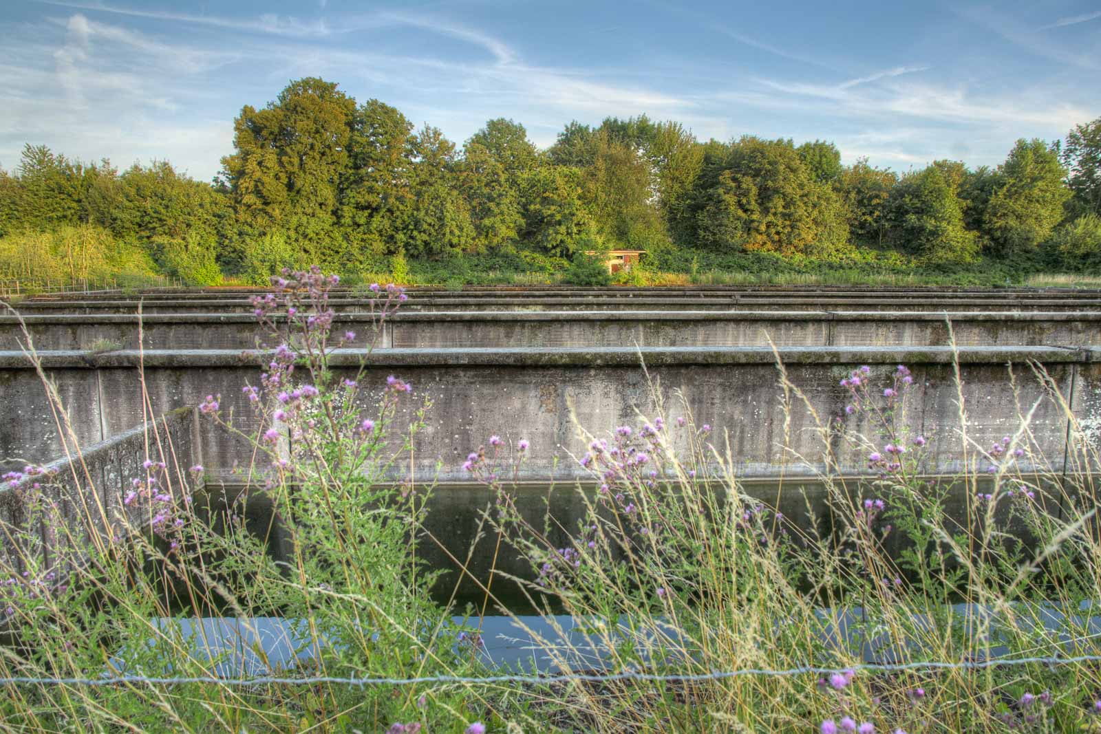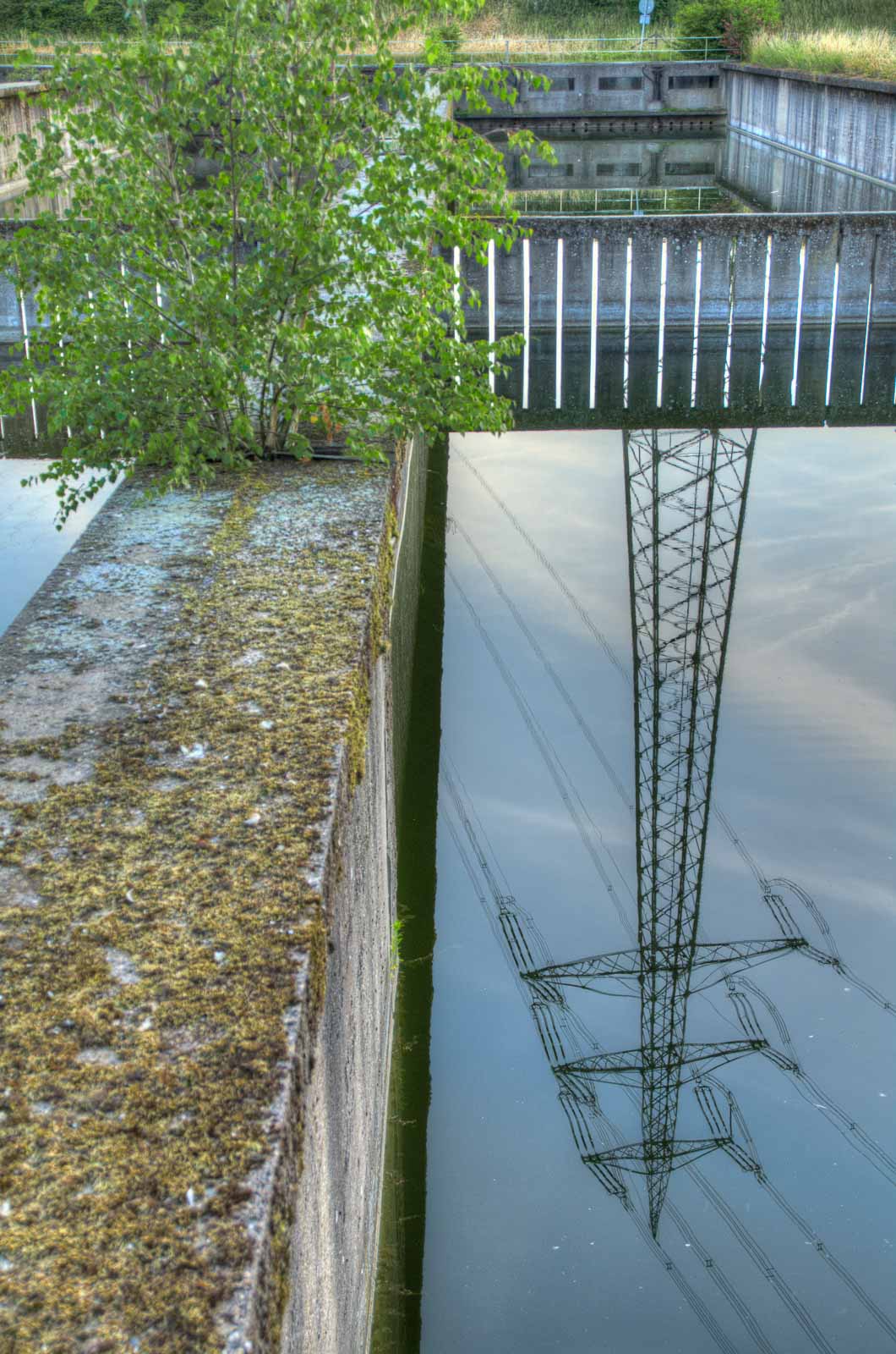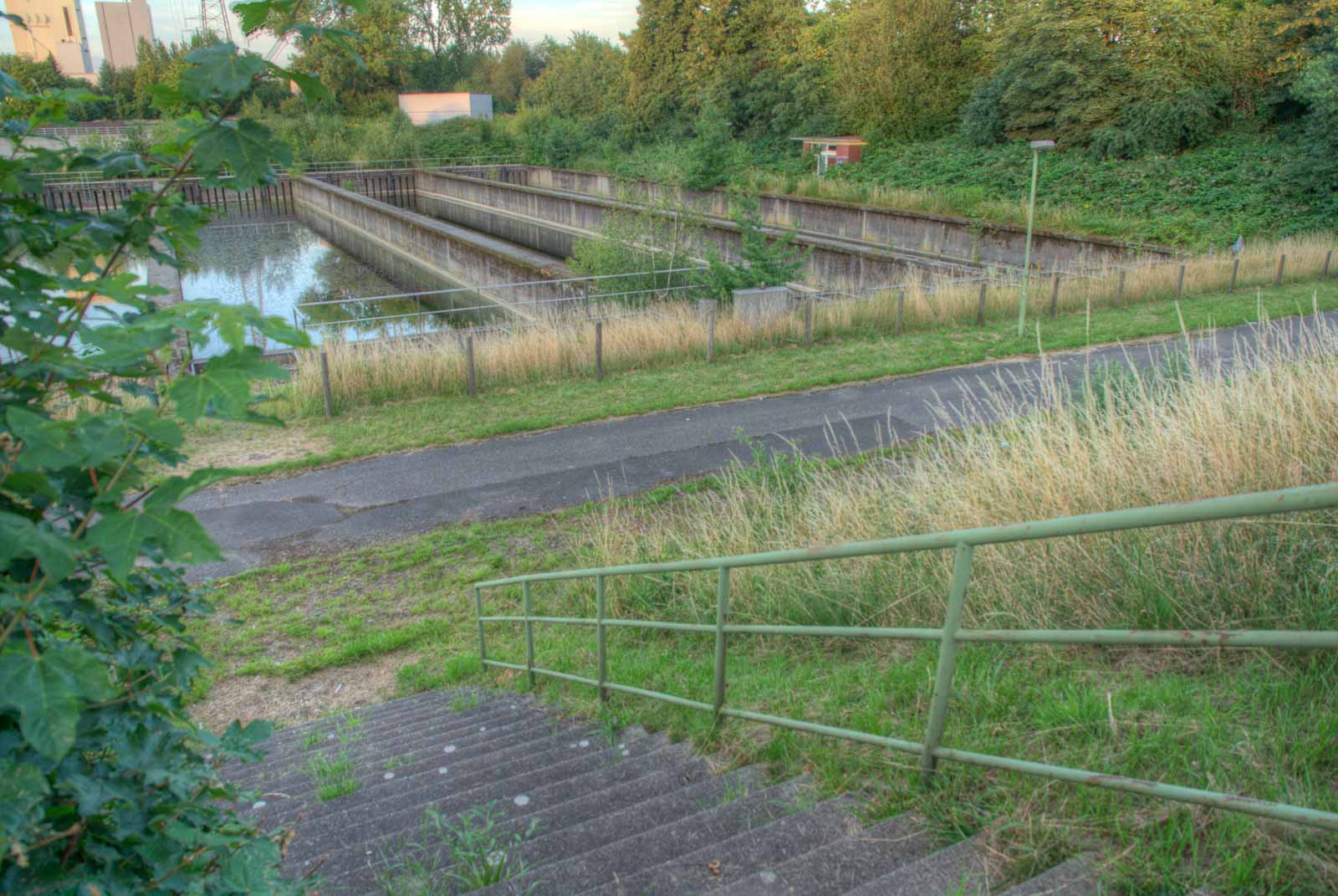 Mein Rundflug führte mich zurück zum Ausgangspunkt am Faulschlammturm. Diesmal von der nördlchen Kanalseite aus Westen kommend. Weil mir während der zuvor erhaschten Diskussion über den Sinn des kunstgesteinigten Blecheis schon Böses schwante, nahm ich die Gelegenheit der Einsamkeit wahr, den Klärwerkbecken mal etwas näher zu kommen und kletterte über die Absperrungen und Stacheldrähte. Das hatten andere vor mir auch schon gemacht. Also wird das ja kein Problem werden, die offenen Behälter aus der direkten Nähe zu erforschen. Solange die noch so da sind, wie sie so da sind. Denn es regt sich in mir der Verdacht, dass sich hier bald was ändern wird. Und das wird für meinen Geschmack nichts Schönes werden …