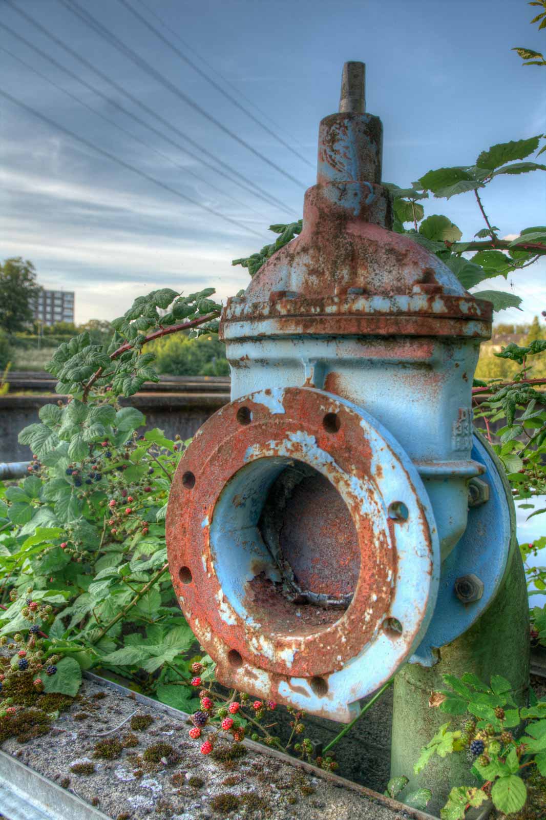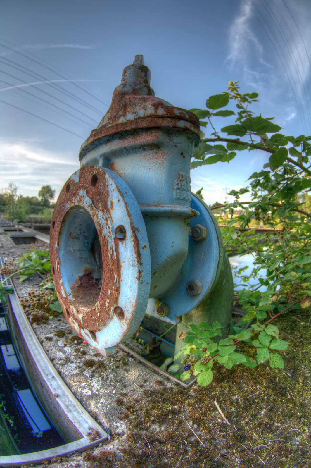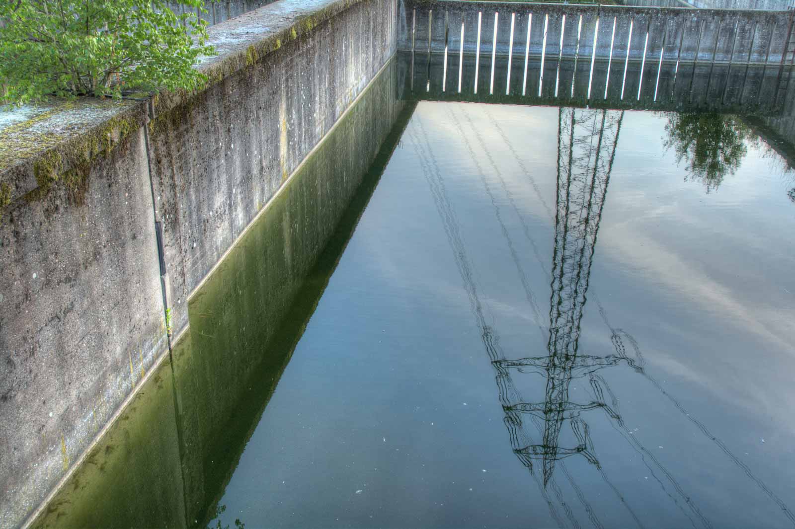 Mein Rundflug führte mich zurück zum Ausgangspunkt am Faulschlammturm. Diesmal von der nördlchen Kanalseite aus Westen kommend. Weil mir während der zuvor erhaschten Diskussion über den Sinn des kunstgesteinigten Blecheis schon Böses schwante, nahm ich die Gelegenheit der Einsamkeit wahr, den Klärwerkbecken mal etwas näher zu kommen und kletterte über die Absperrungen und Stacheldrähte. Das hatten andere vor mir auch schon gemacht. Also wird das ja kein Problem werden, die offenen Behälter aus der direkten Nähe zu erforschen. Solange die noch so da sind, wie sie so da sind. Denn es regt sich in mir der Verdacht, dass sich hier bald was ändern wird. Und das wird für meinen Geschmack nichts Schönes werden …