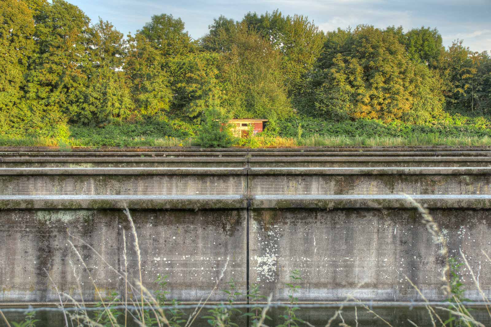 Die stillgelegte und anscheinend ebenfalls stark gealterte und vermutlich baufällige Eisenbahnbrücke über die Emscher hatte ich bereits am 07.07.2020 als Objekt meiner Begierde versucht auf Digiloid zu bannen.