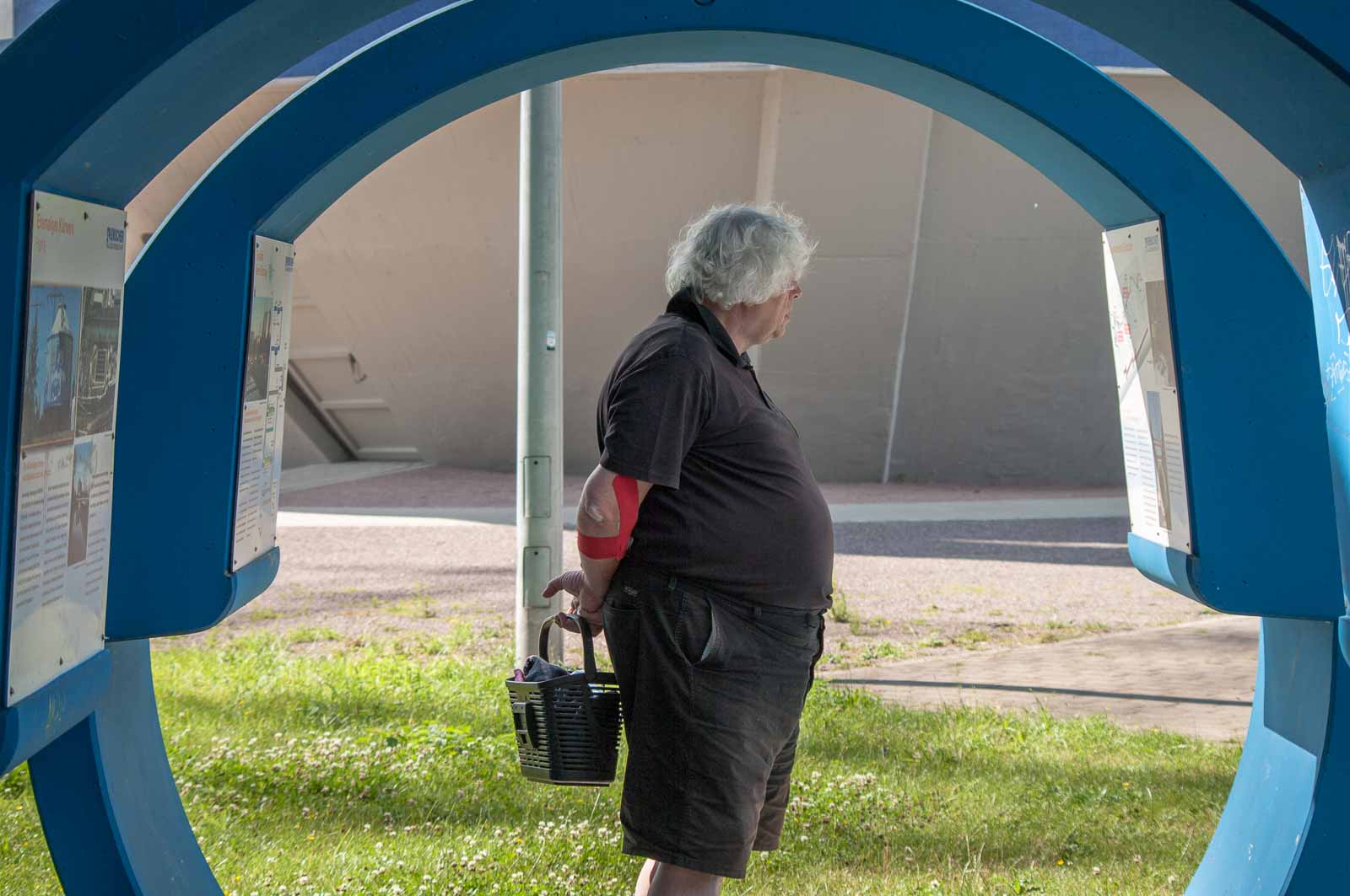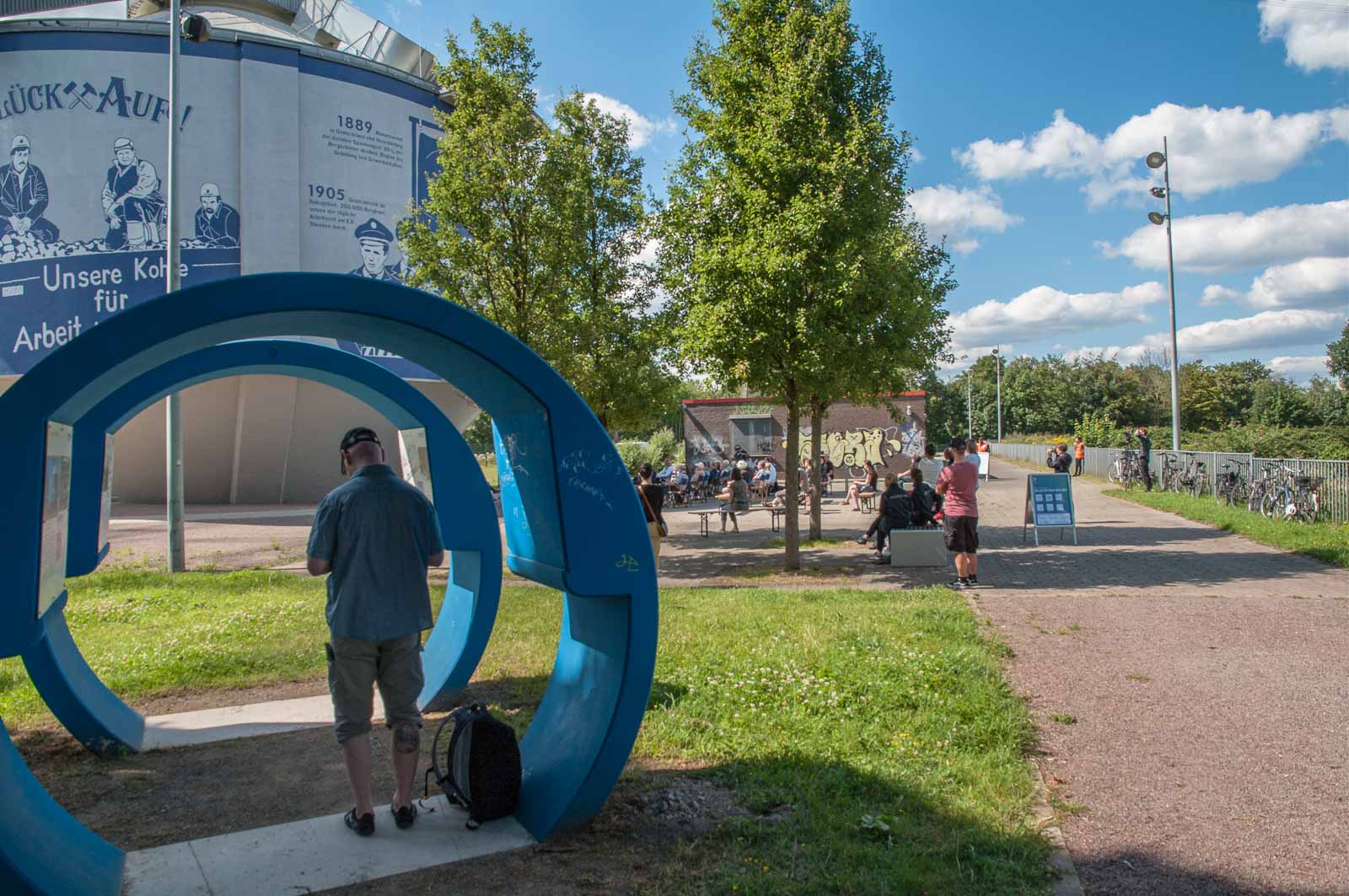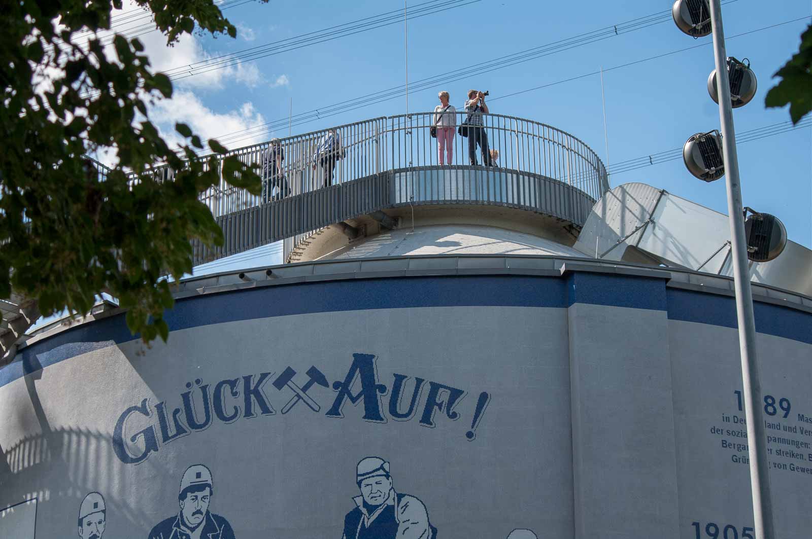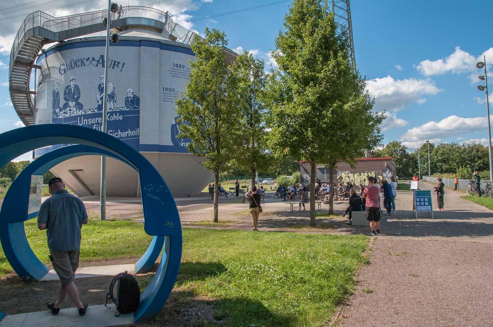 Dass das Gelande bereits in 2010 von einer Hamburger Künstlerin in Mitleidenschaft gezogen wurde, sieht man an dem mit bedeutungsschwangeren Schlagworten und-texten am ehemaligen Faulschlammturm, der im Zuge der Emscher-Renaturierung einer neuen Bedeutung zugeführt werden sollte. Der Trümmer sollte stehen bleiben, wurde dann von innen entkernt und von aussen für die hier anssässige allgemeine Vollpfostenliga und den der Alpenromantik überdrüssigen Urlaubern aus Bayern sowie katastrophengeilen Wochenendschnellsäufern aus Hamburg, Berlin oder sonstwelchen schauderhaften Metropolen als ansonsten völlig belangloses Ruhrgebietsmarkenzeichen umfunktioniert. Ein viel zu niedriger Aussichtsturm auf einem ehemaligen Scheißhaus. Wer hätte das gedacht?