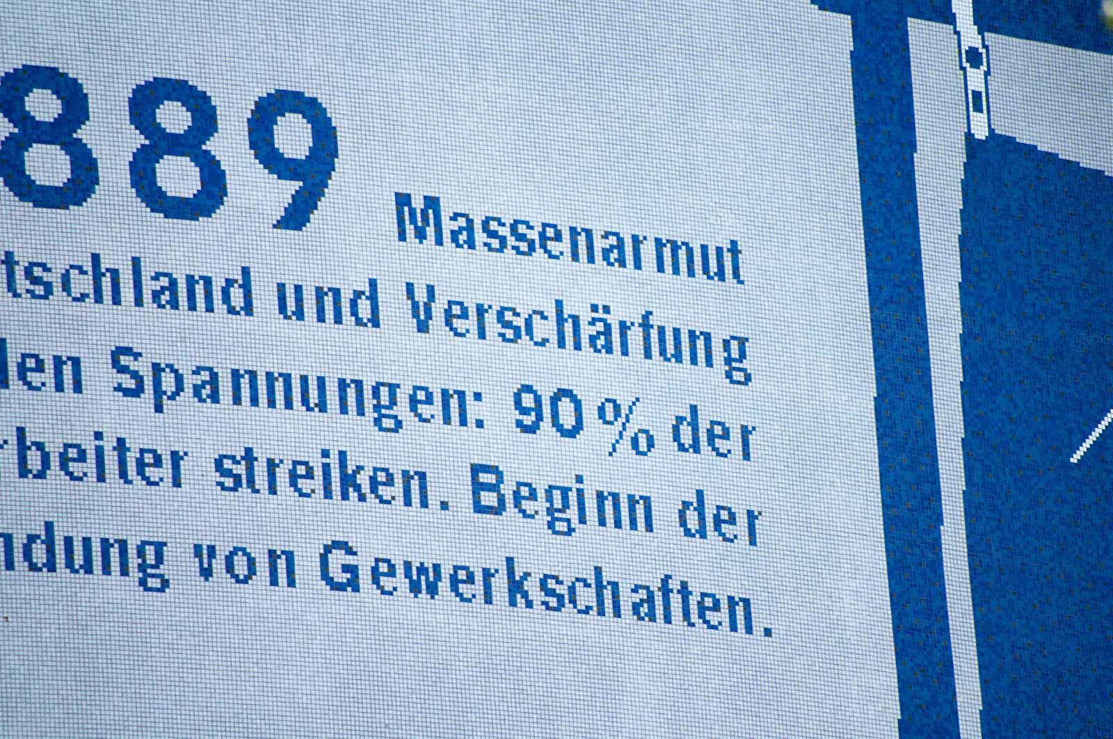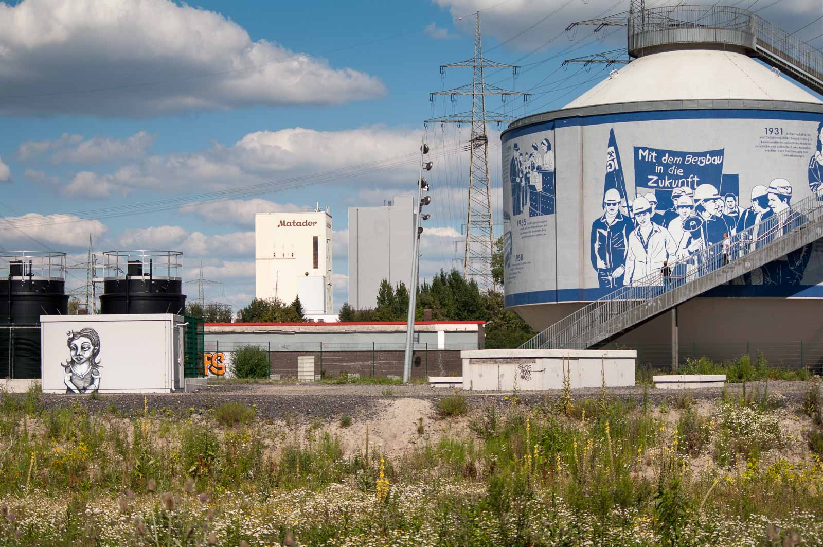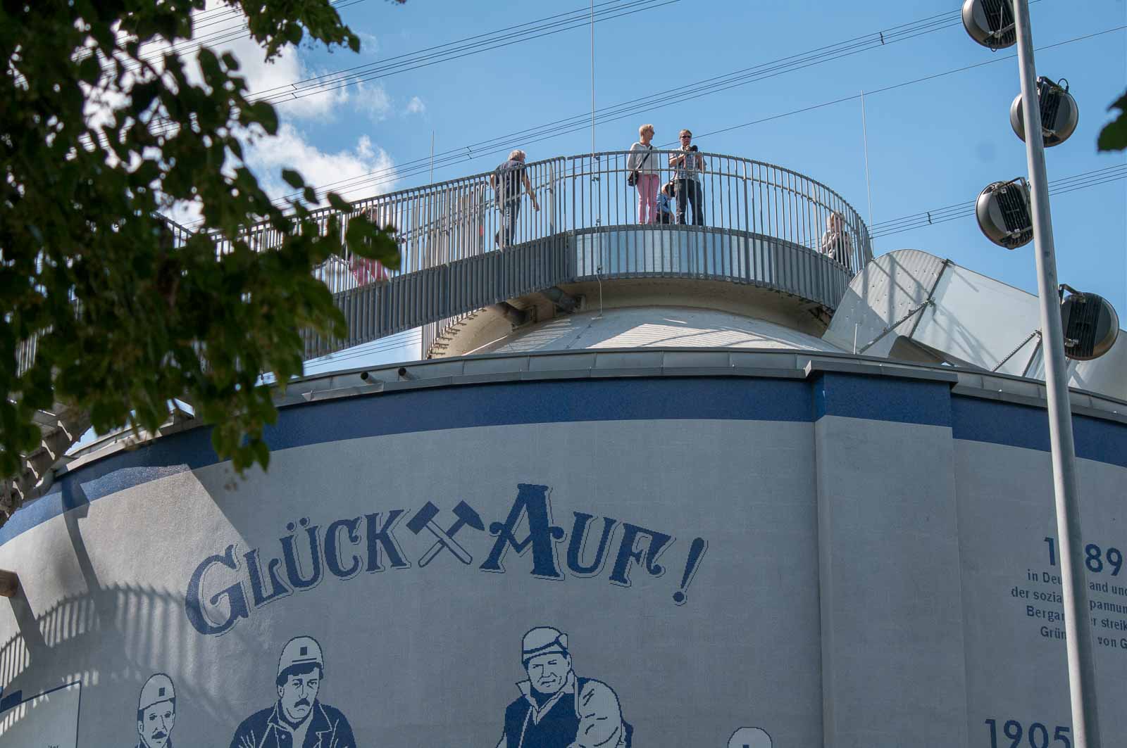 Der Turm erhielt mit den Mosaiksteinchen auf seiner Aussenhülle eine ganz neue Bedeutung. Er wurde damit zum (damals noch) angestrahlten Denkmal des Aufstiegs und Niedergangs der ohnehin geplant kurzen Bergraubbaugeschichte dieser Region. Eigentlich sollten die sichtbaren Datumsmarken anlässlich der ständigen Ausbeutung der hier hart ausgebeuteten Menschen auf die daraufhin auch berechtigten Bergarbeiterproteste hinweisen. Nur leider hat man im Zuge der Entwicklung, die die Konzeptionierung der „Route der Industriekultur“ so mit sich brachte, nicht wirklich bedacht, dass die Ausbeutung von Mensch und Umwelt ja nun mal nicht wirklich ein kutureller Gegenstand ist. Und der verbliebene Ruinenschrott schon mal gar nicht. Der ist nur deswegen stehen geblieben, weil es zu teuer geworden wäre, den abzureissen um dann die erst rücksichts- und jetzt hoffnungslos verseuchten Standortflächen zu sanieren.