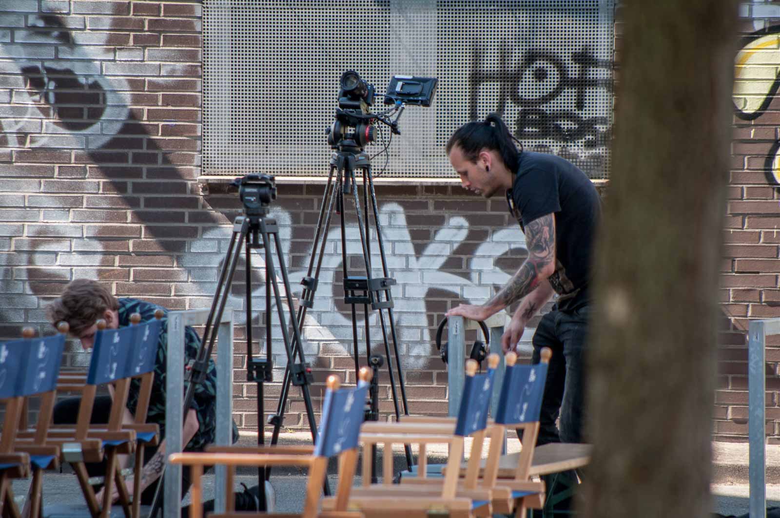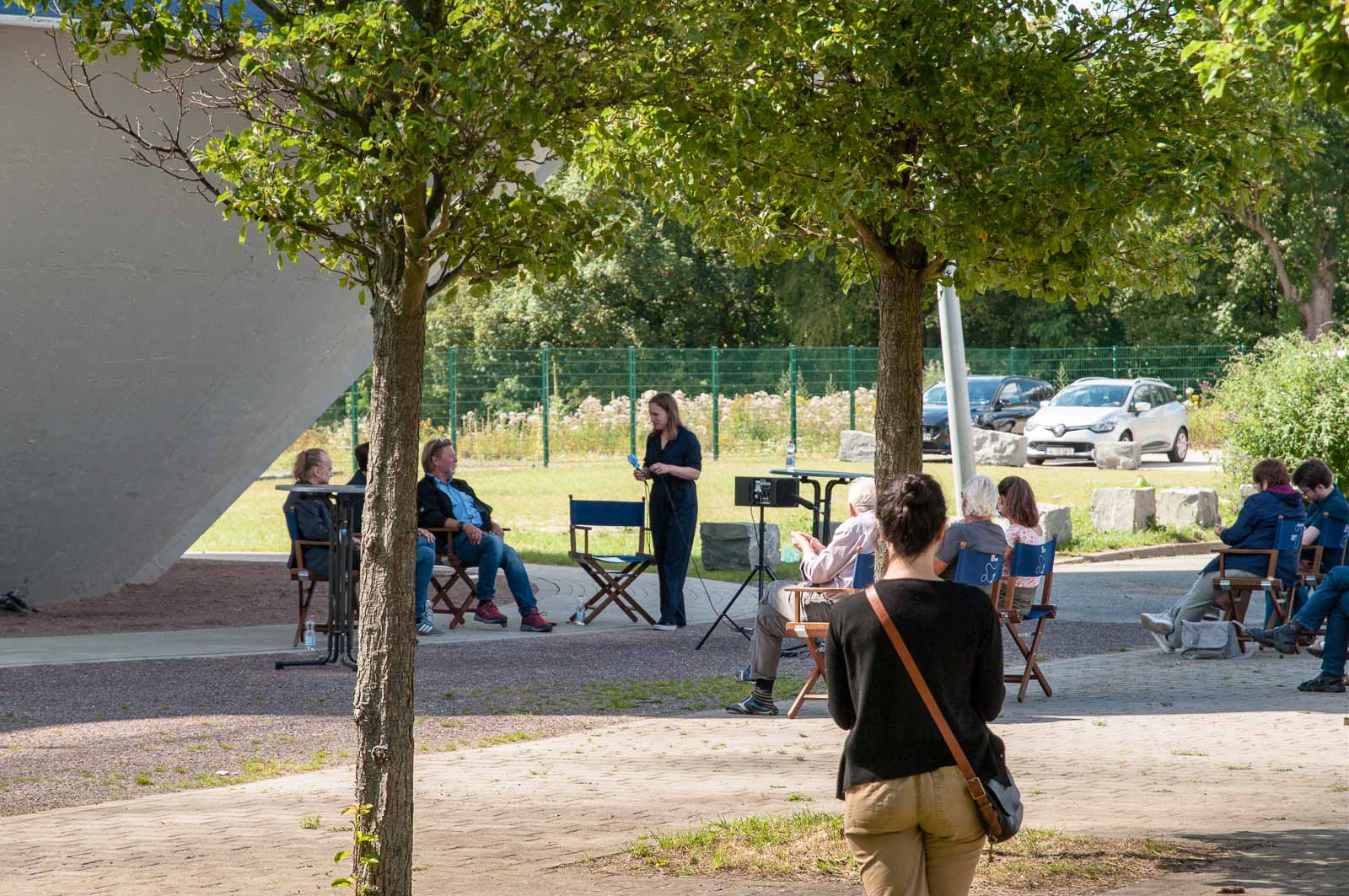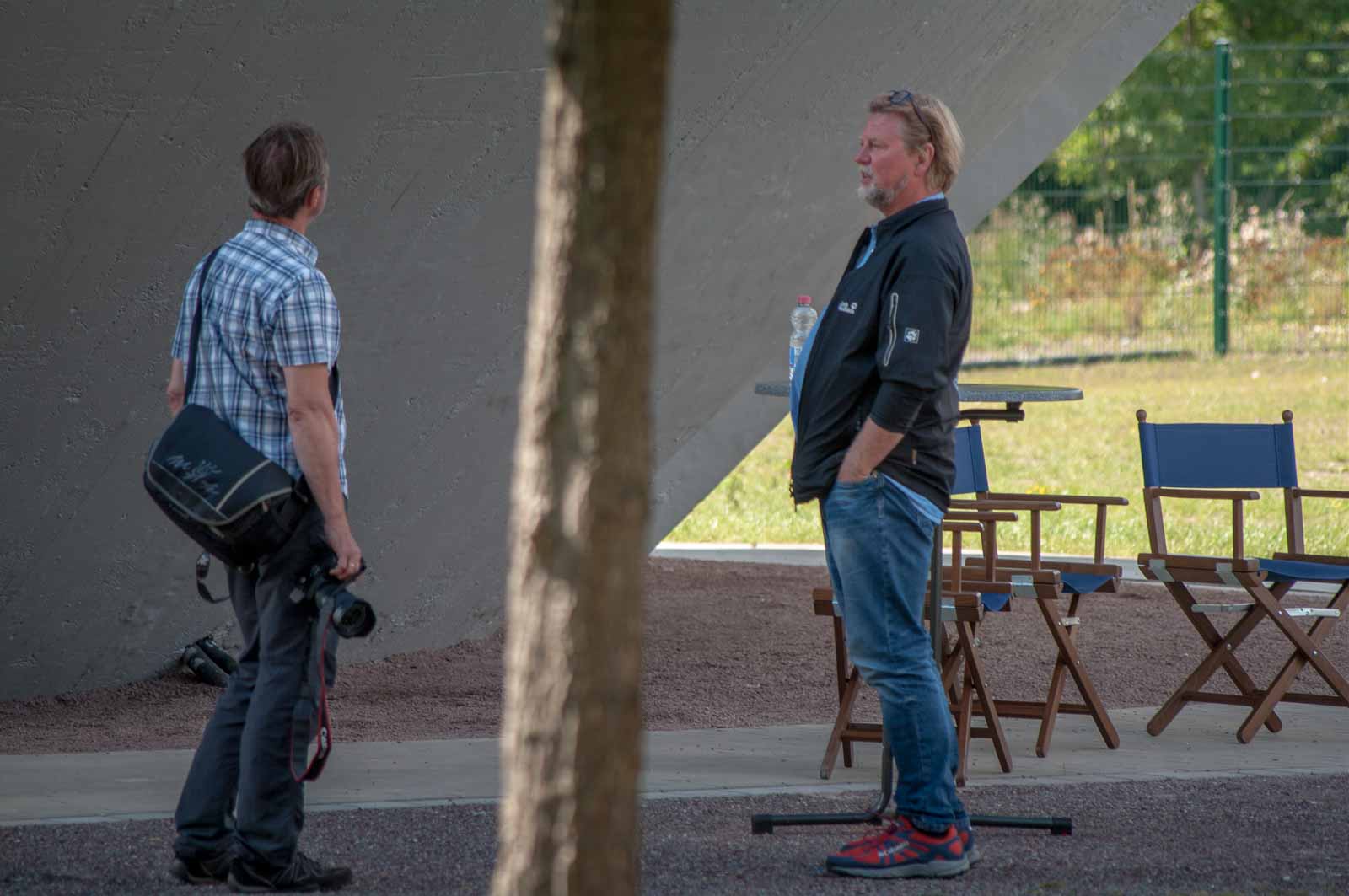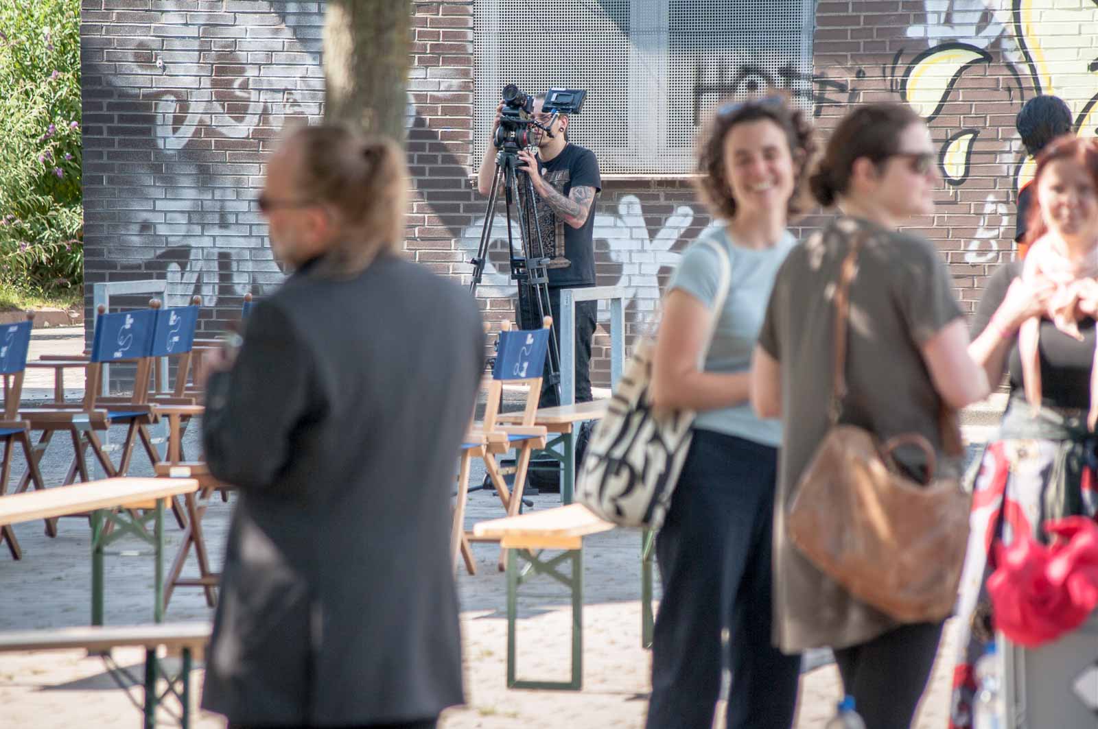 Das in der Pressemitteilung angekündigte Szenario bot sich mir dann bei meiner Ankunft am Turm. Und neugierig hatte ich dann auch aus sicherer Entfernung – ich war weder geladener Gast, noch hatte ich präventiv die bescheuerte Schutzmaske am Mann – das Ende der Veranstaltung noch gerade so eben erhaschen können. Und damit auch die Pracht und Herrlichkeit, in der sich durch hemmungslosen Konsums von teuerer Puffbrause hochrot gesoffene Köpfe und irgendwie merkwürdig erscheinende Künstler sonnen und gegenseitig auf ihre ganz eigene Art selbst beweihräuchern.