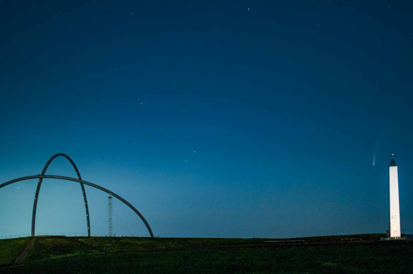 Alternativ schien das näher aber deutlich höher gelegene Horizontobservatorium auf der Halde Hoherward mein Favorit werden zu wollen. Weil Hoherward den Vorteil bot, dass dort mit den Monster-Stahlbögen und dem niedlichen Obelisken die zum Thema passenden Vordergrundmotive zu finden sind.