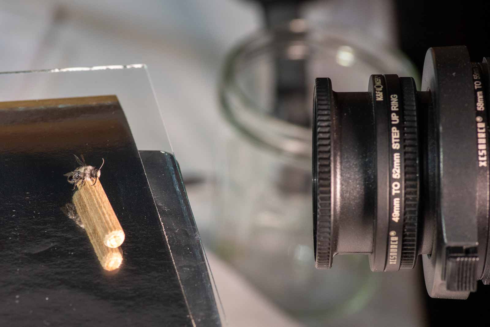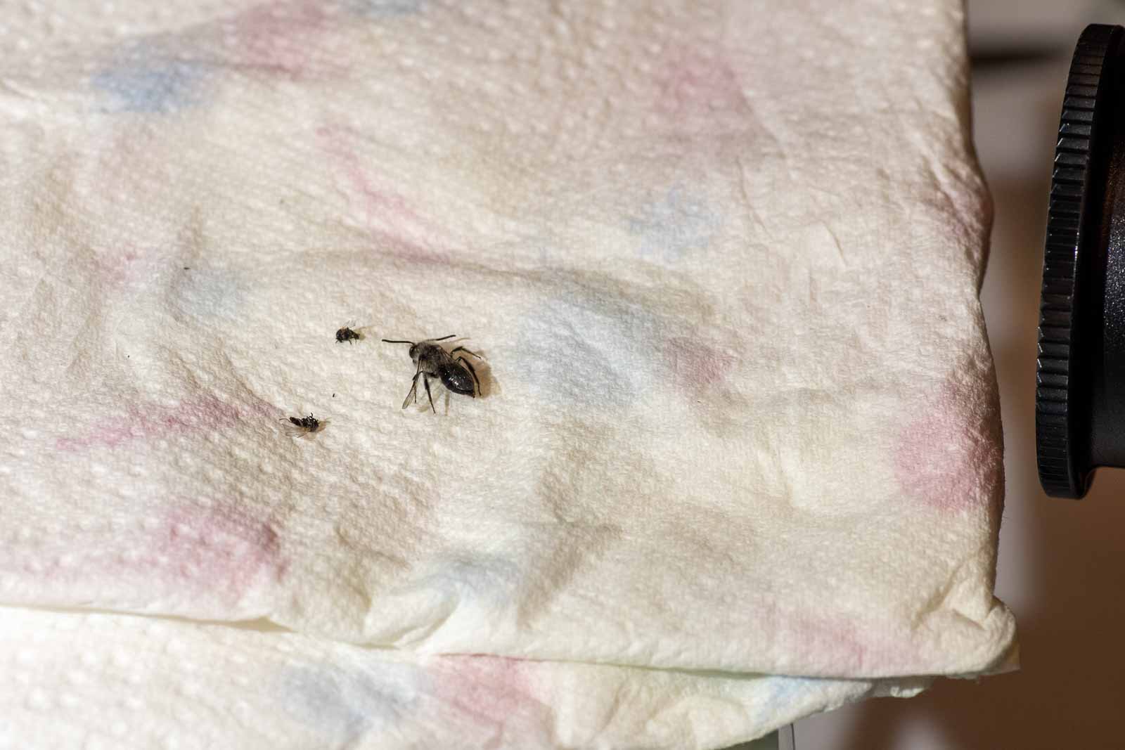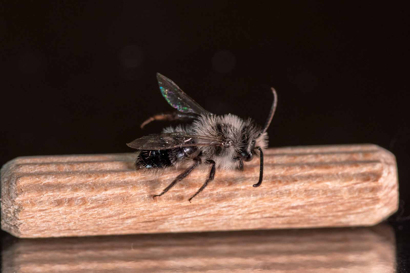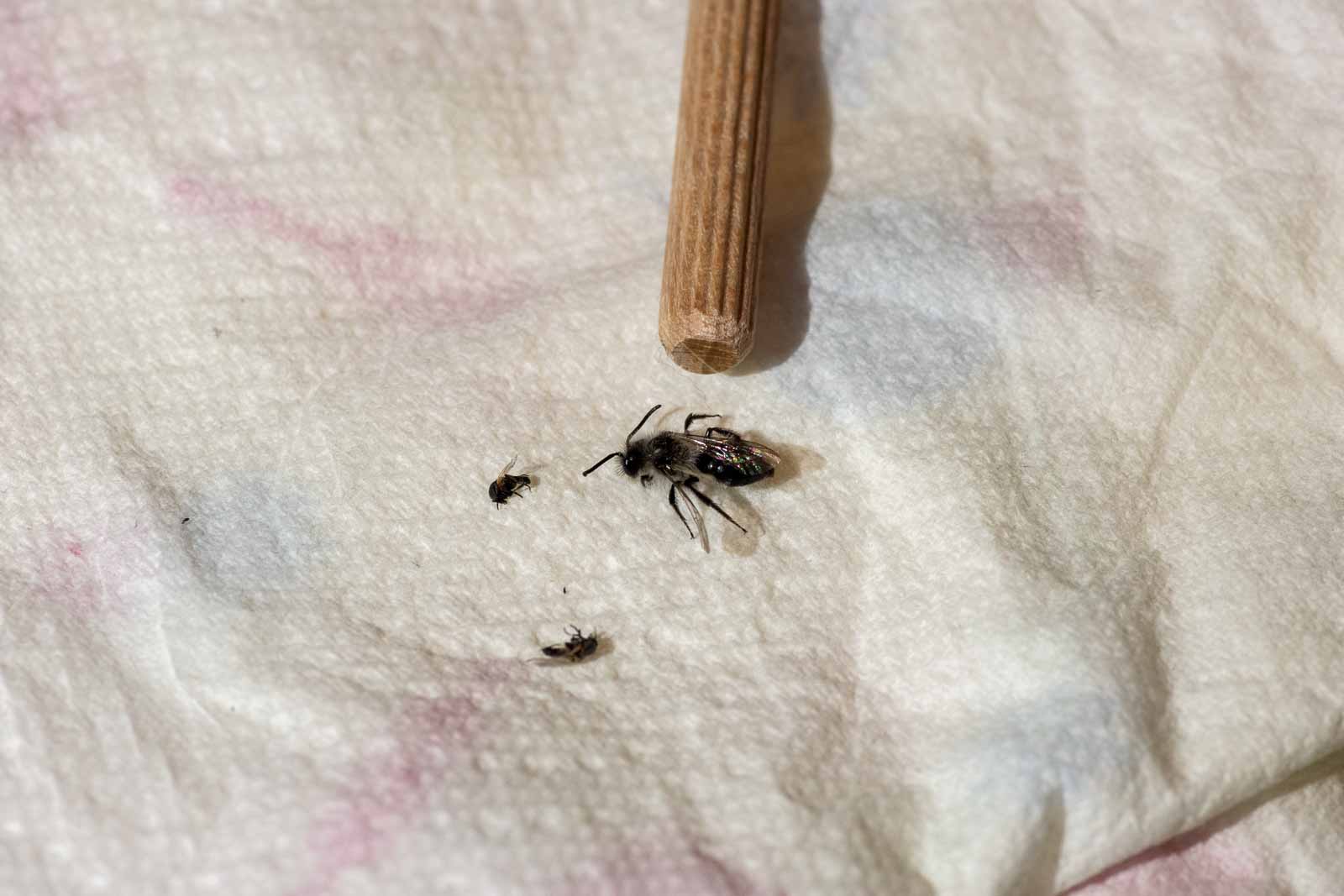 Die Sandbiene habe ich wohl mehr versehentlich beim Umgraben des mir von Häbbätt überlassenen Betonblumenkübels mit ausgehoben. Dem kleinen Jungen war’s anscheinend noch zu früh auszuschwärmen, und offensichtlich auch noch etwas zu kalt. Weshalb der dann unbemerkt in meinem Haupthaar eine willkommene Übernachtungsgelegenheit fand. Leider konnte ich den am nächsten Morgen dann doch nur noch tot auskämmen …