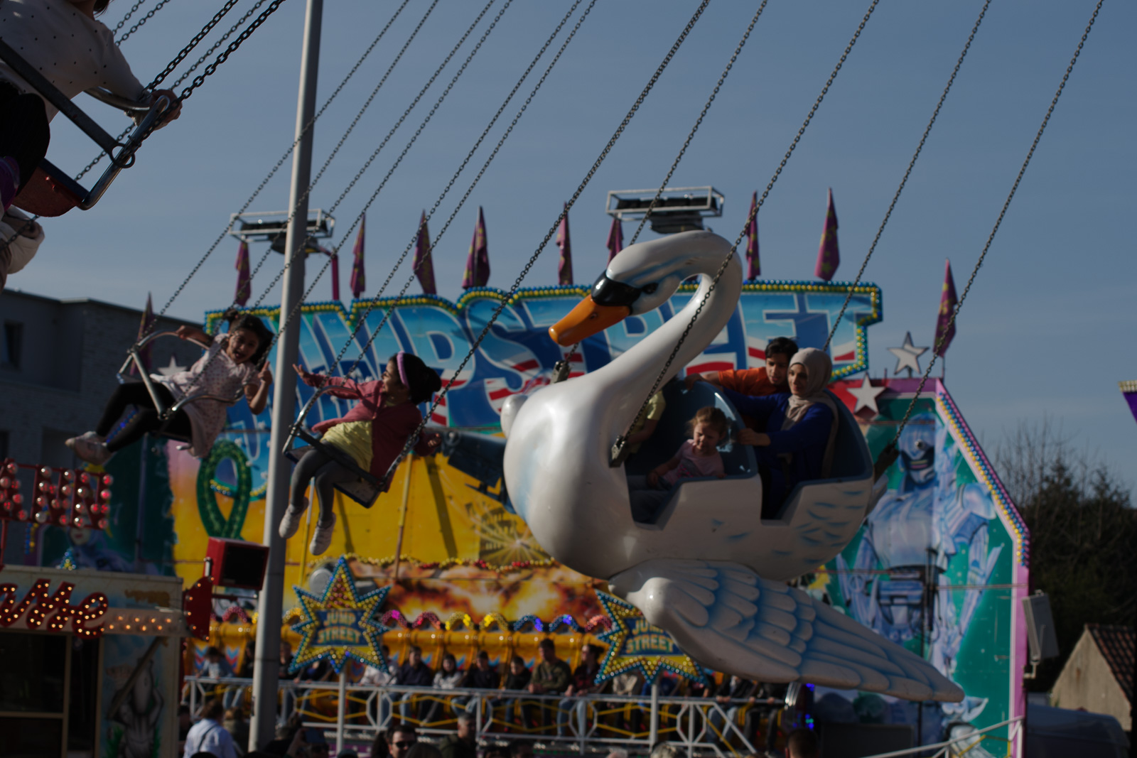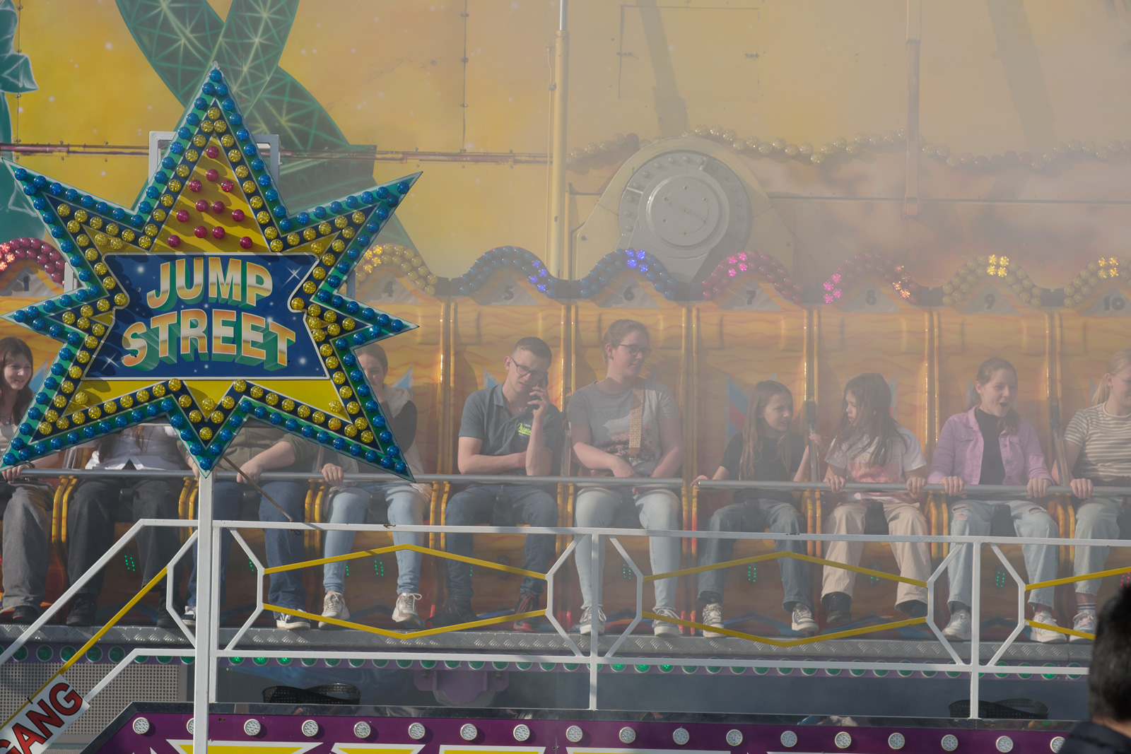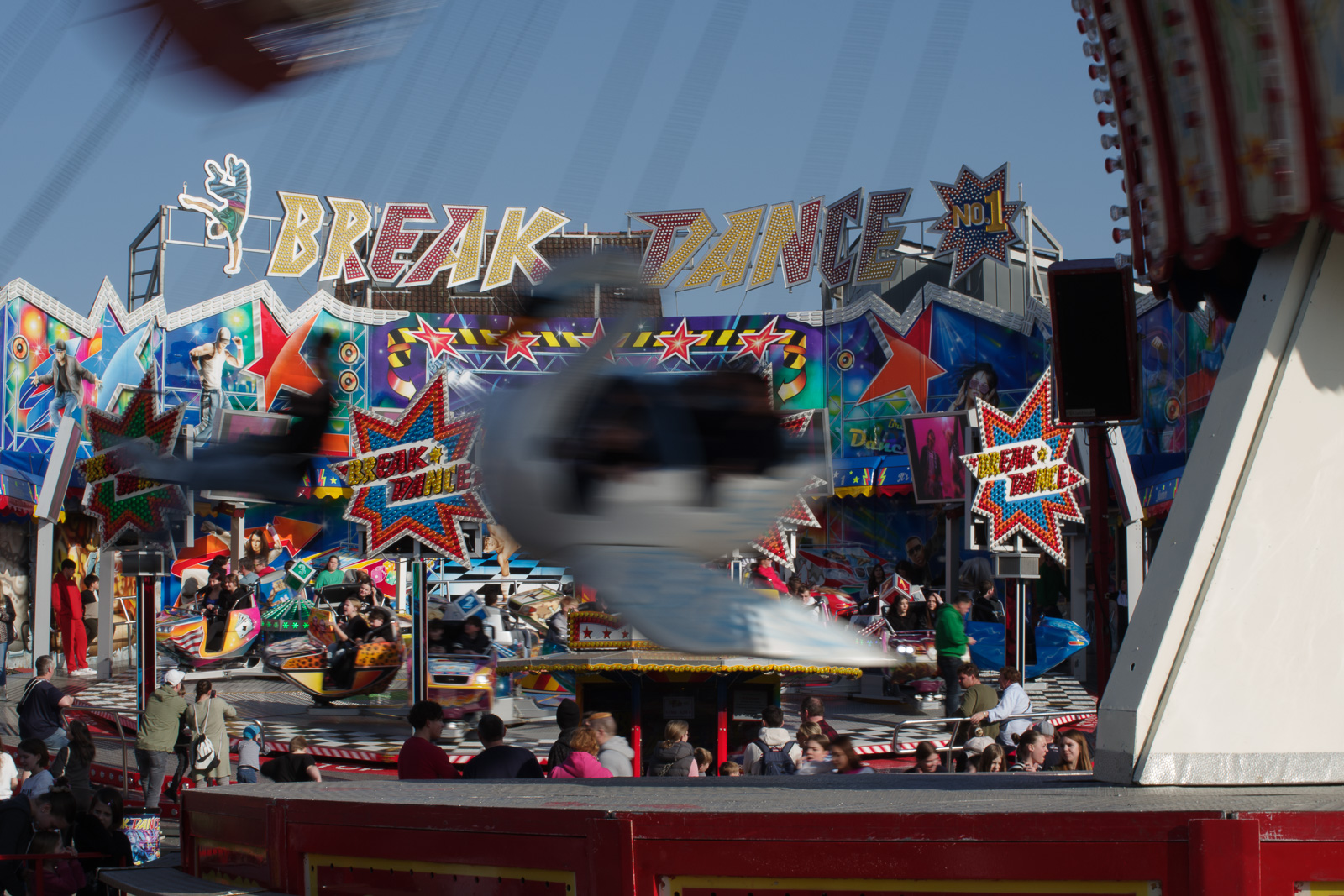 Genau genommen ist die „Frühjahrskirmes“ eigentlich gar keine Kirmes in eigentlichen Sinne, sondern eher ’ne spärliche Ansammlung von Fressbuden mit überteuerten Produkten, und dazwischen sind drei oder vier unspektakuläre Fahrgeschäfte, die keinen Hering vom Teller ziehen. Dafür ist der Platz auf dem das Event stattfindet auch zu klein, und damit ist die nur wenig überzeugende Wirkung der Kirmes auf mich auch entschuldigt.