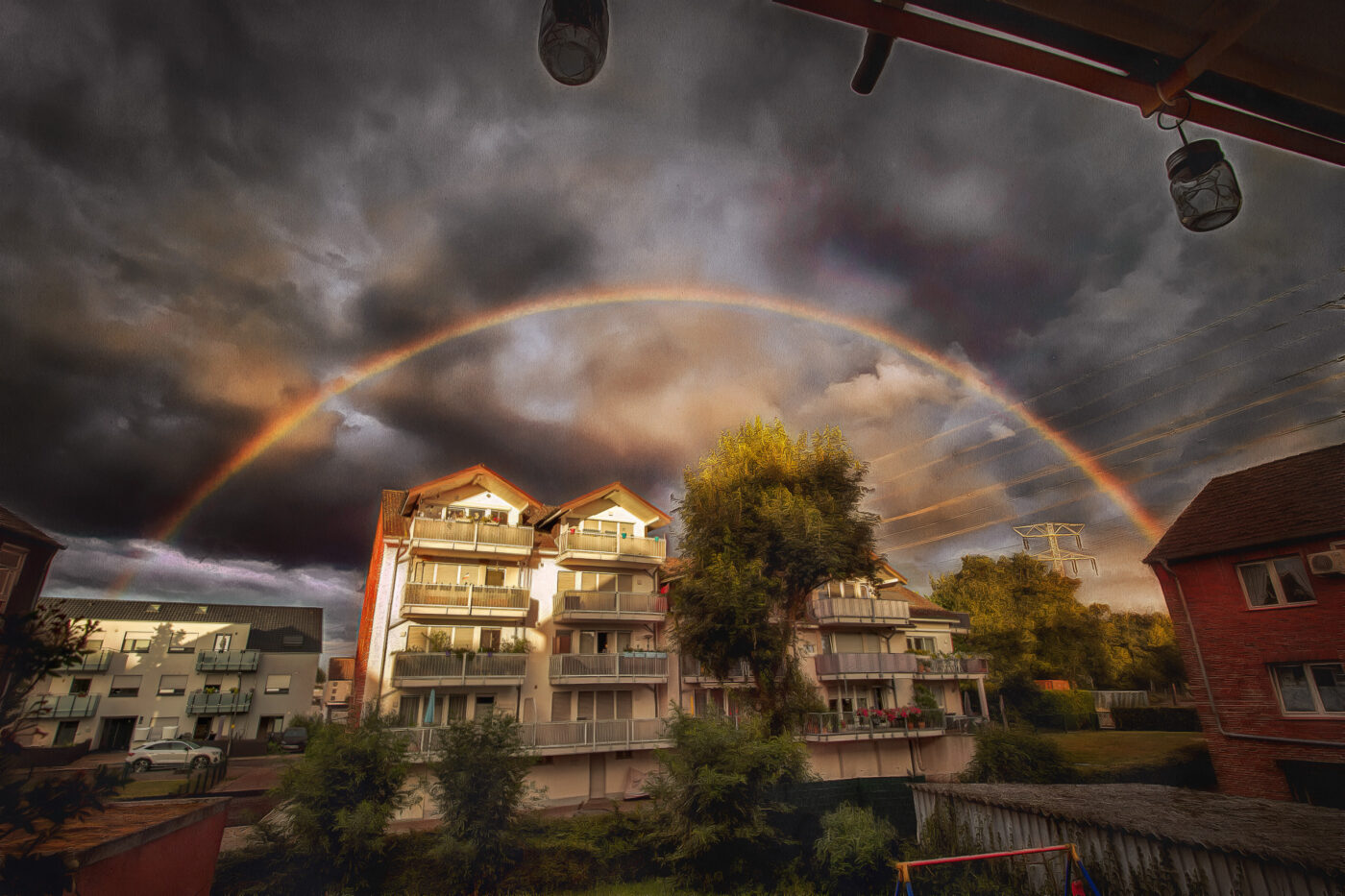 Und weil sich Regenbögen deshalb gerne während eines abziehenden Regengebiets und im Westen aufklarenden Himmels, der die untergehende Sonne freigibt, zeigen, hat der residenzialische Freusitz den Vorteil einer Wetterbeobachtungsplattform. Auch wenn es sich dabei – wei in einem historischem Kino – nur um einen „Rasiersitz“ handelt und nicht um den teuren Logenplatz im 3. OG. Den hätte ich wohl gerne, müsste dann aber Treppen steigen, was mir auch nicht gefallen würde …