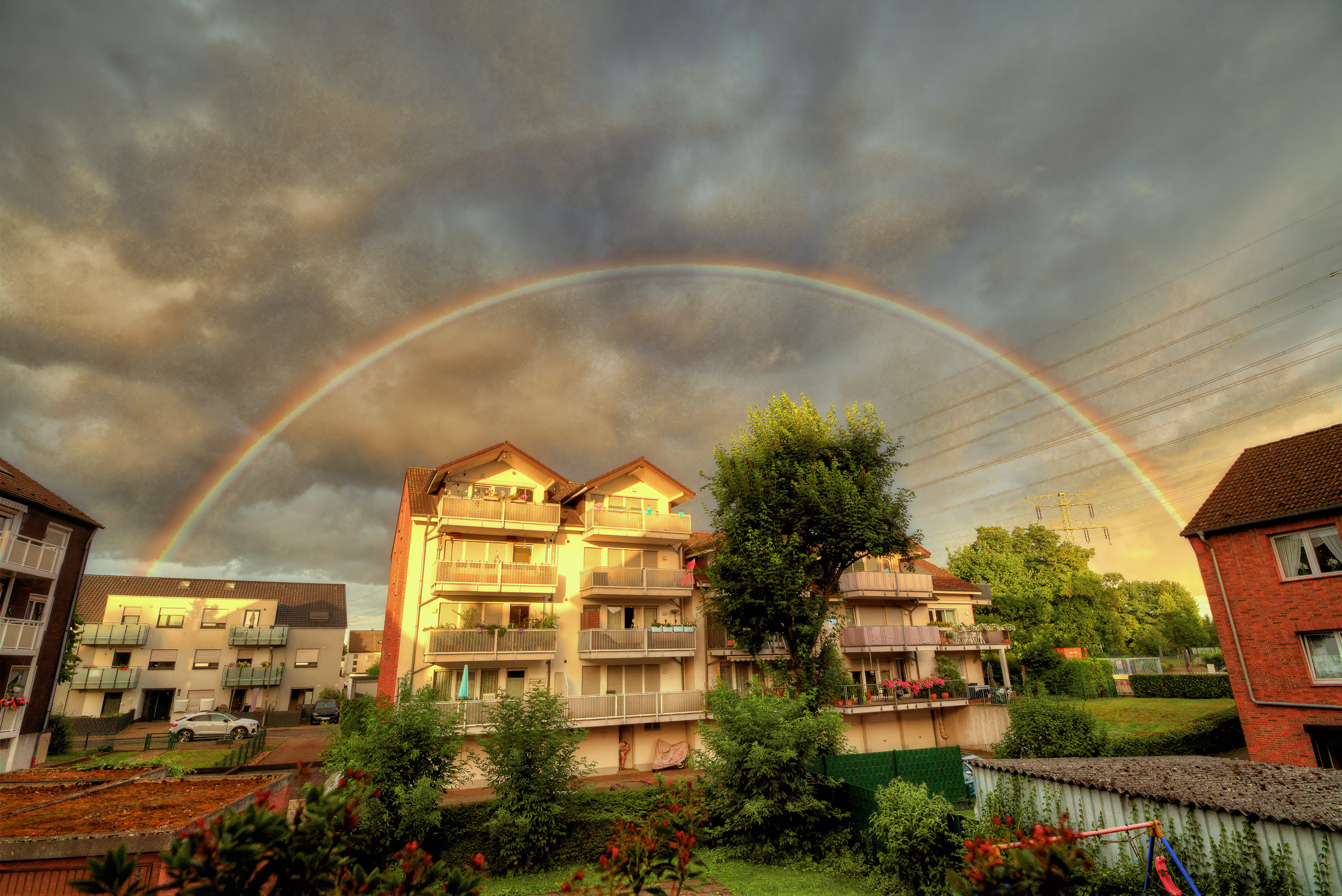 Und weil sich Regenbögen deshalb gerne während eines abziehenden Regengebiets und im Westen aufklarenden Himmels, der die untergehende Sonne freigibt, zeigen, hat der residenzialische Freusitz den Vorteil einer Wetterbeobachtungsplattform. Auch wenn es sich dabei – wei in einem historischem Kino – nur um einen „Rasiersitz“ handelt und nicht um den teuren Logenplatz im 3. OG. Den hätte ich wohl gerne, müsste dann aber Treppen steigen, was mir auch nicht gefallen würde …