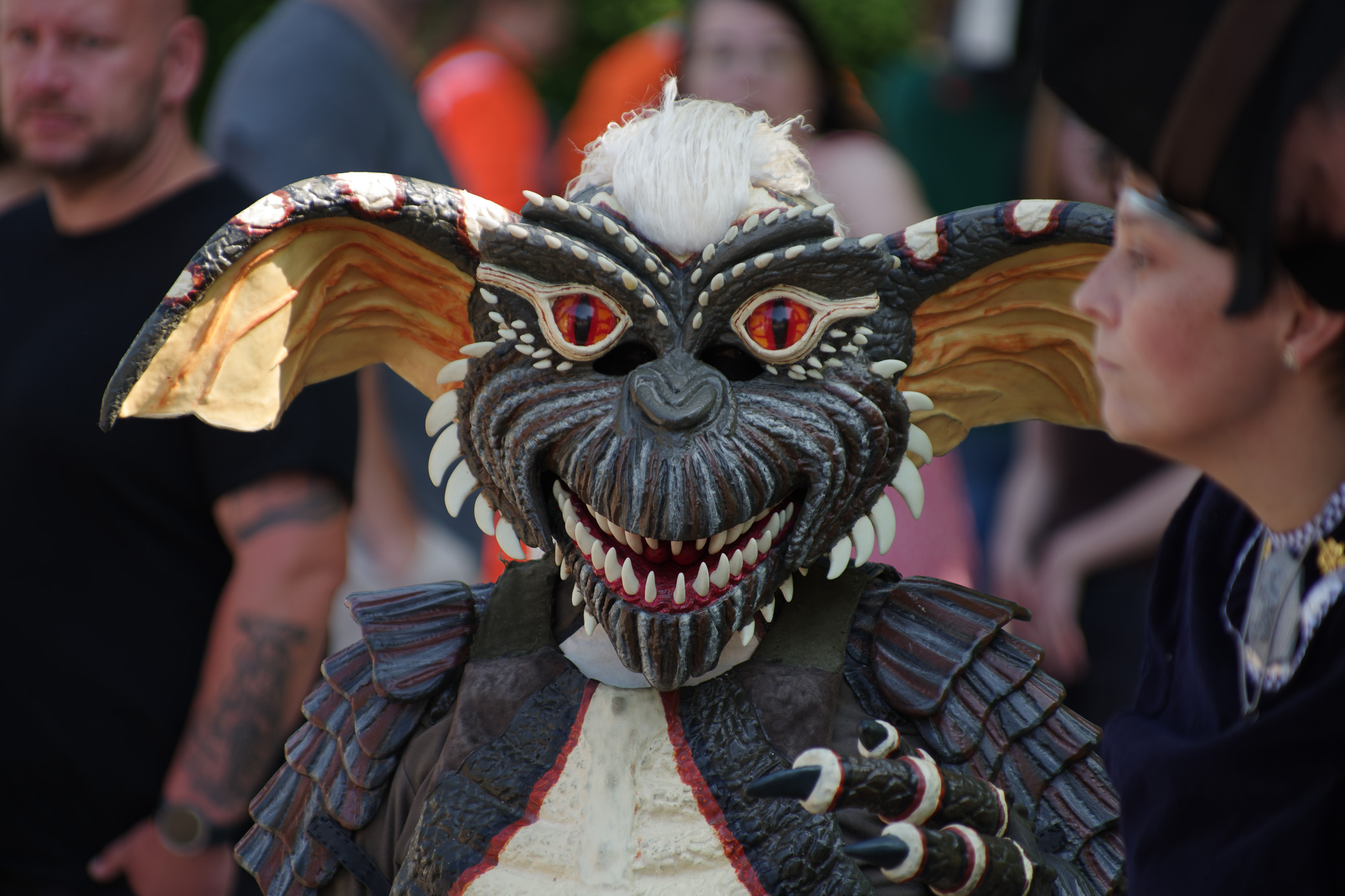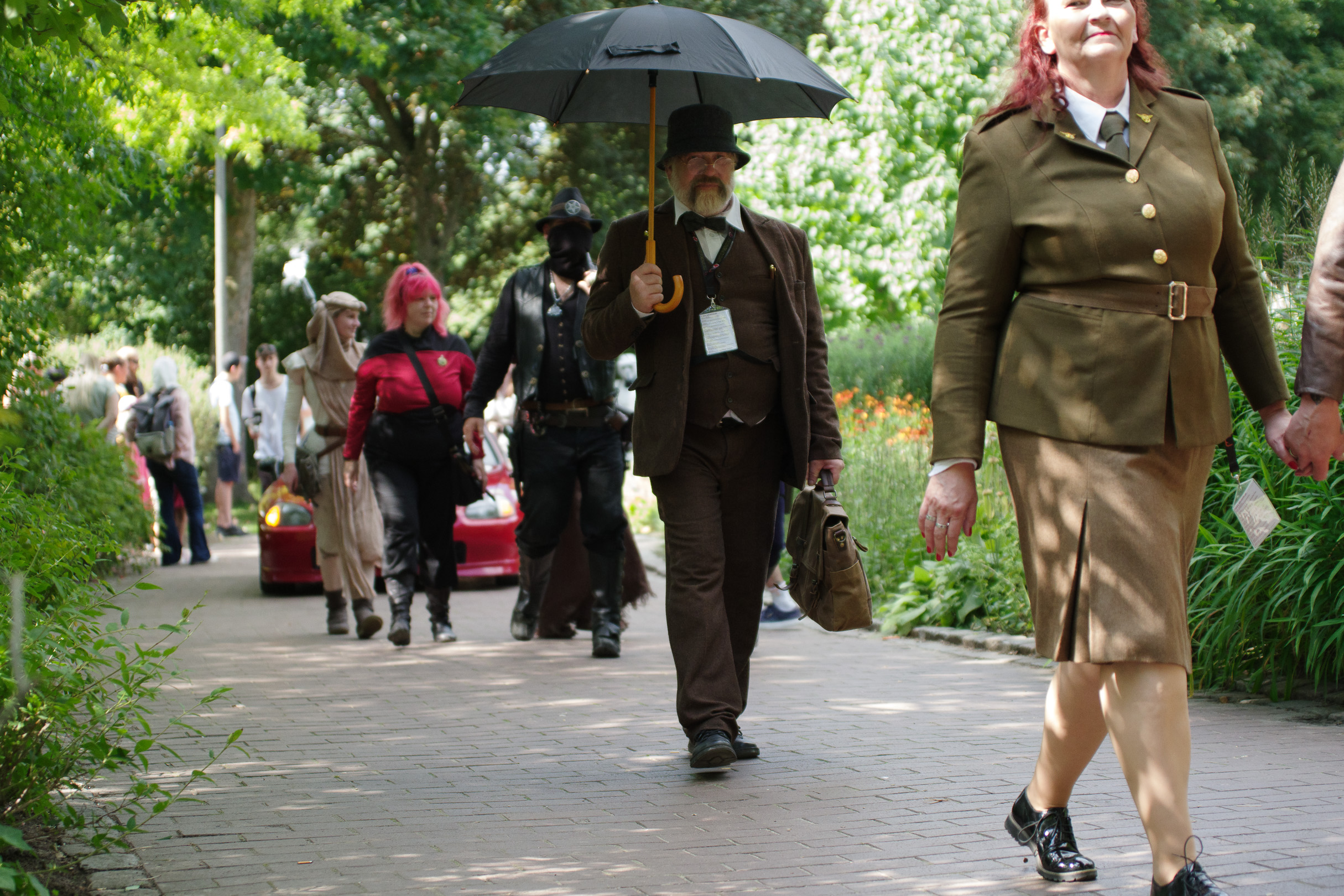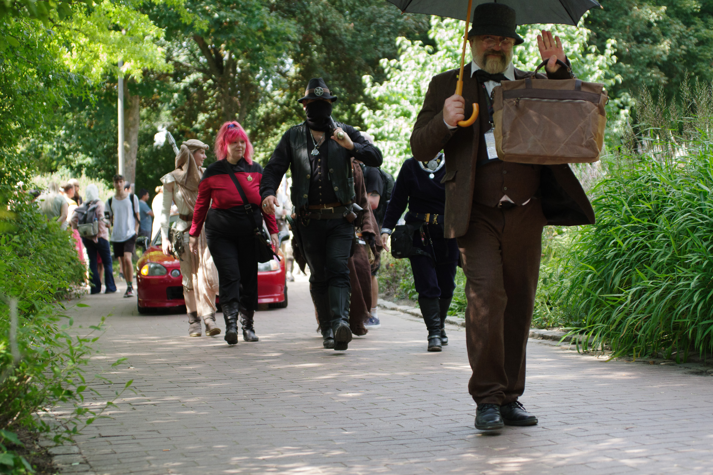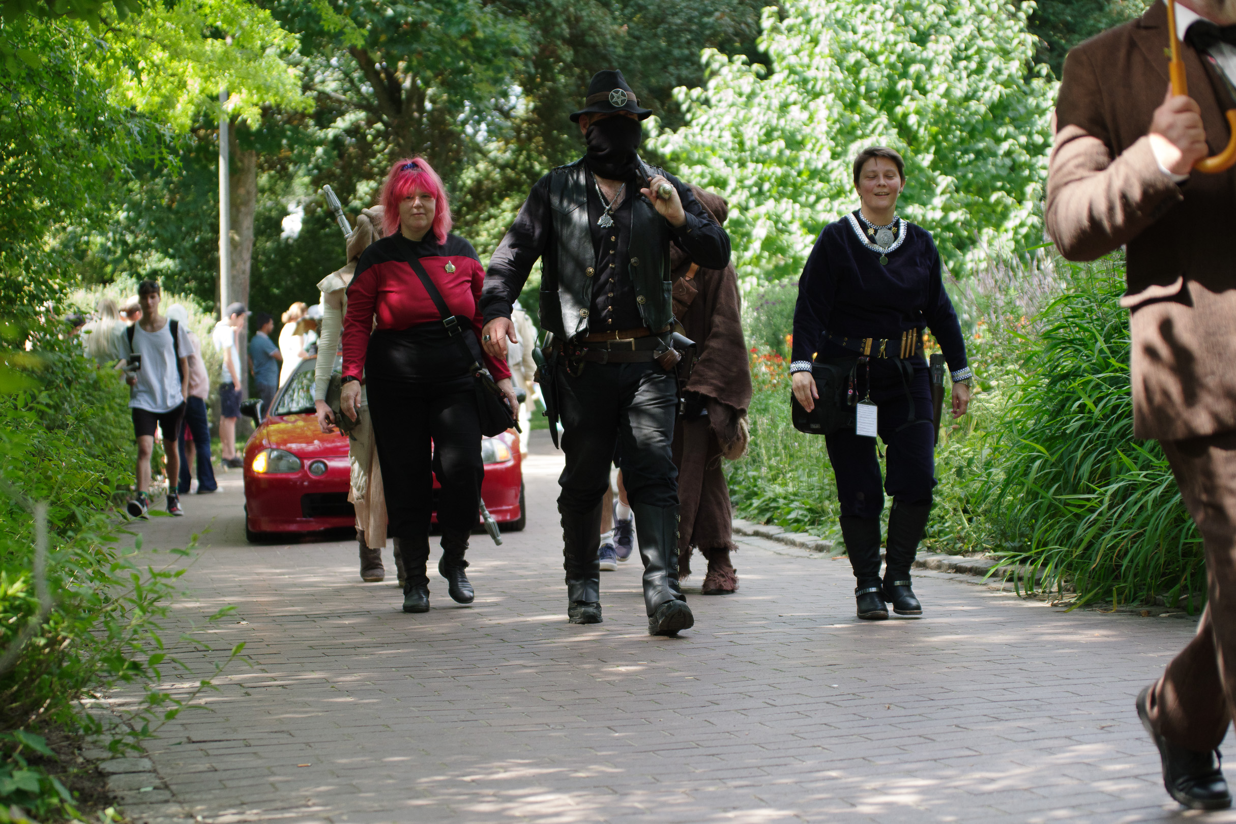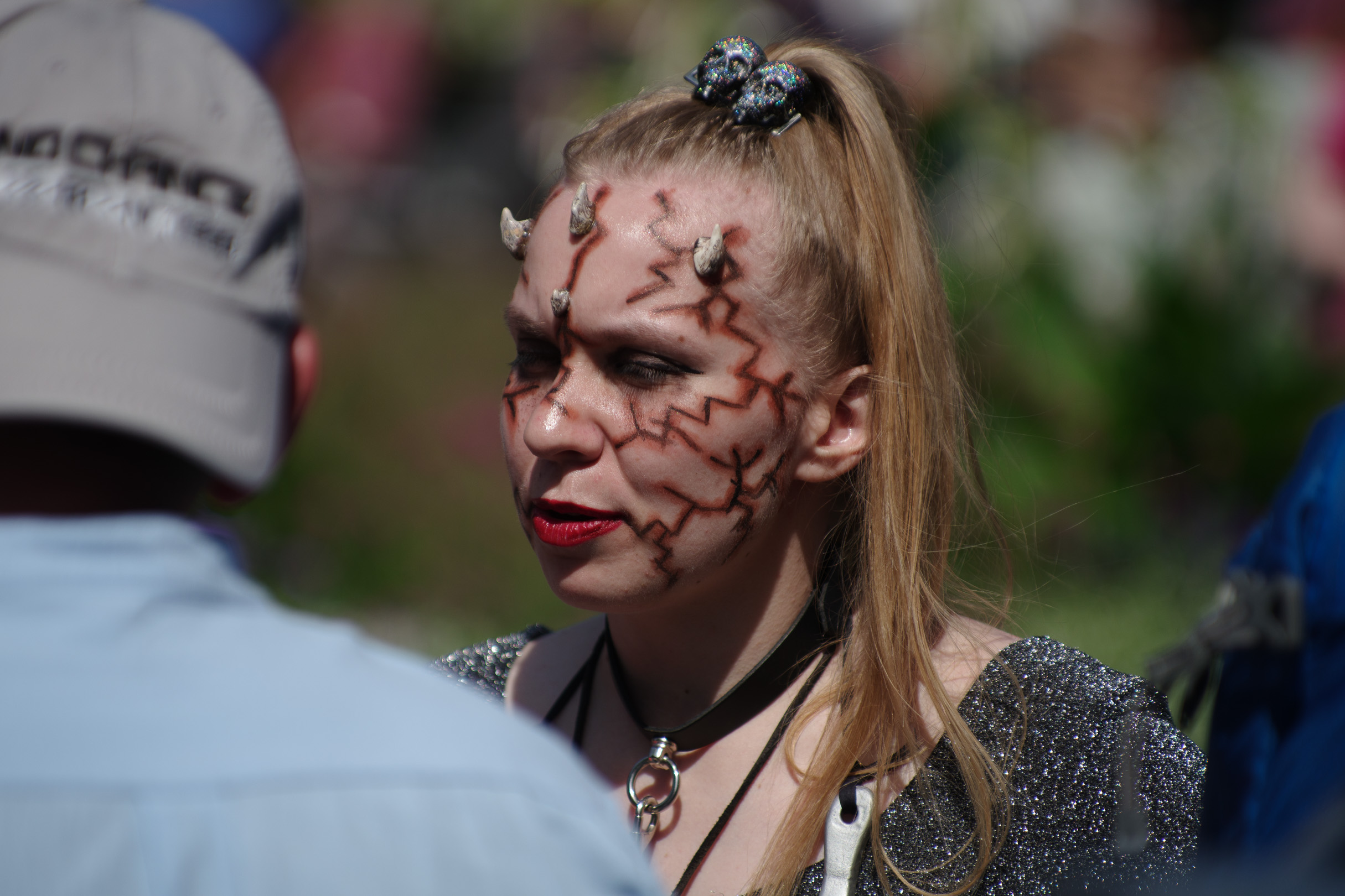 Die zu Beginn von mir erhaschten Trophäen bewegten sich bereitwillig aber zumeist umringt von anderen Besuchern im Bereich des Haupteingangs. Das machte die Sache nicht einfacher. Licht, Schatten und andere menschliche Störungen und vor allem meine eigene Unzulänglichkeit (ich musste mich in das Motivthema „menschenähnliche Gestalt“ erst mal einarbeiten und hatte in den ersten Bildern zuviel Himmel und zu wenig Beine drauf) verhinderten nur zu oft die begehrten Perspektiven auf die Maskeraden der Teilnehmer.
