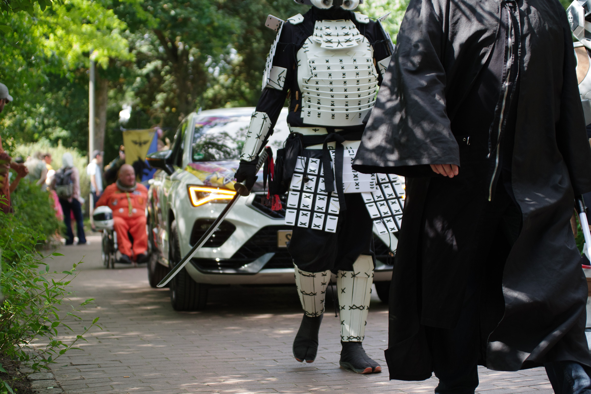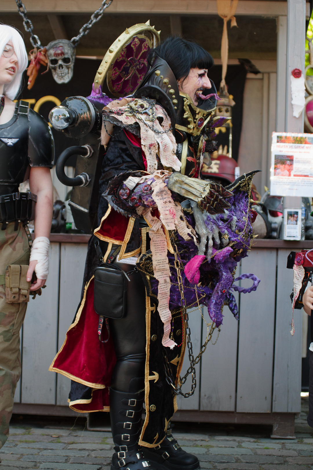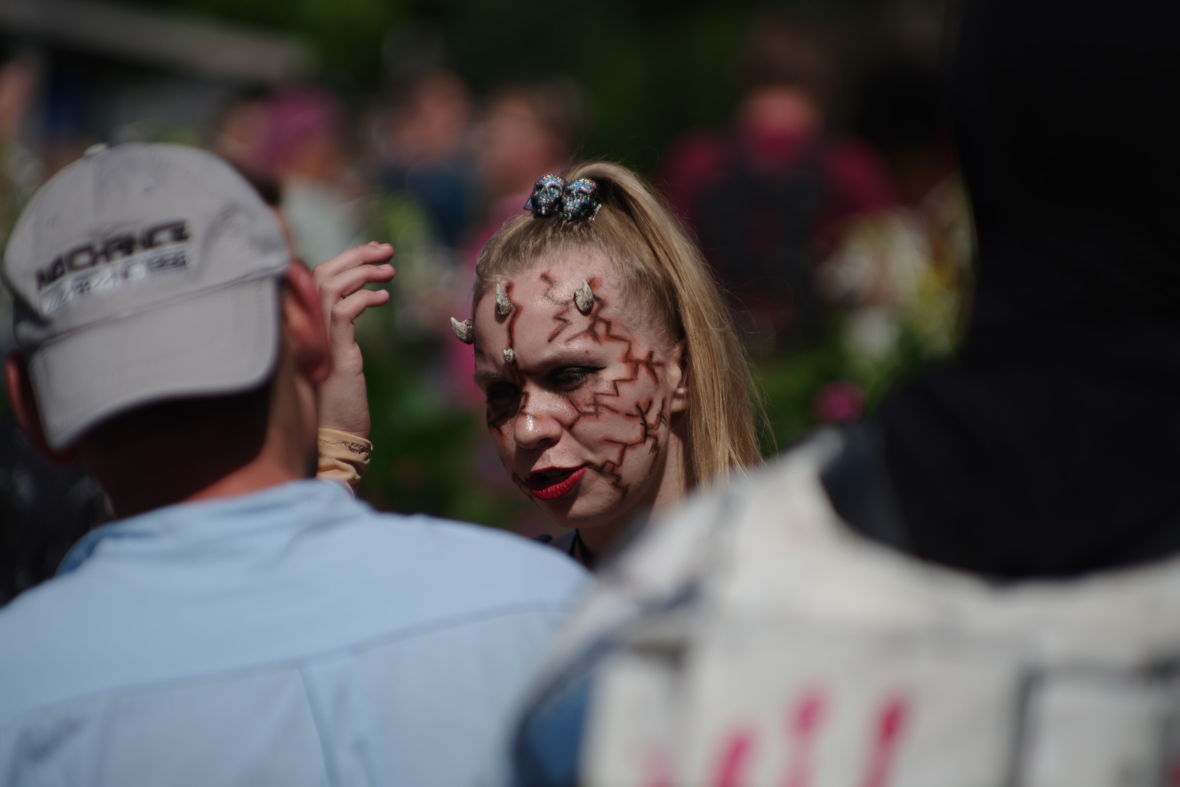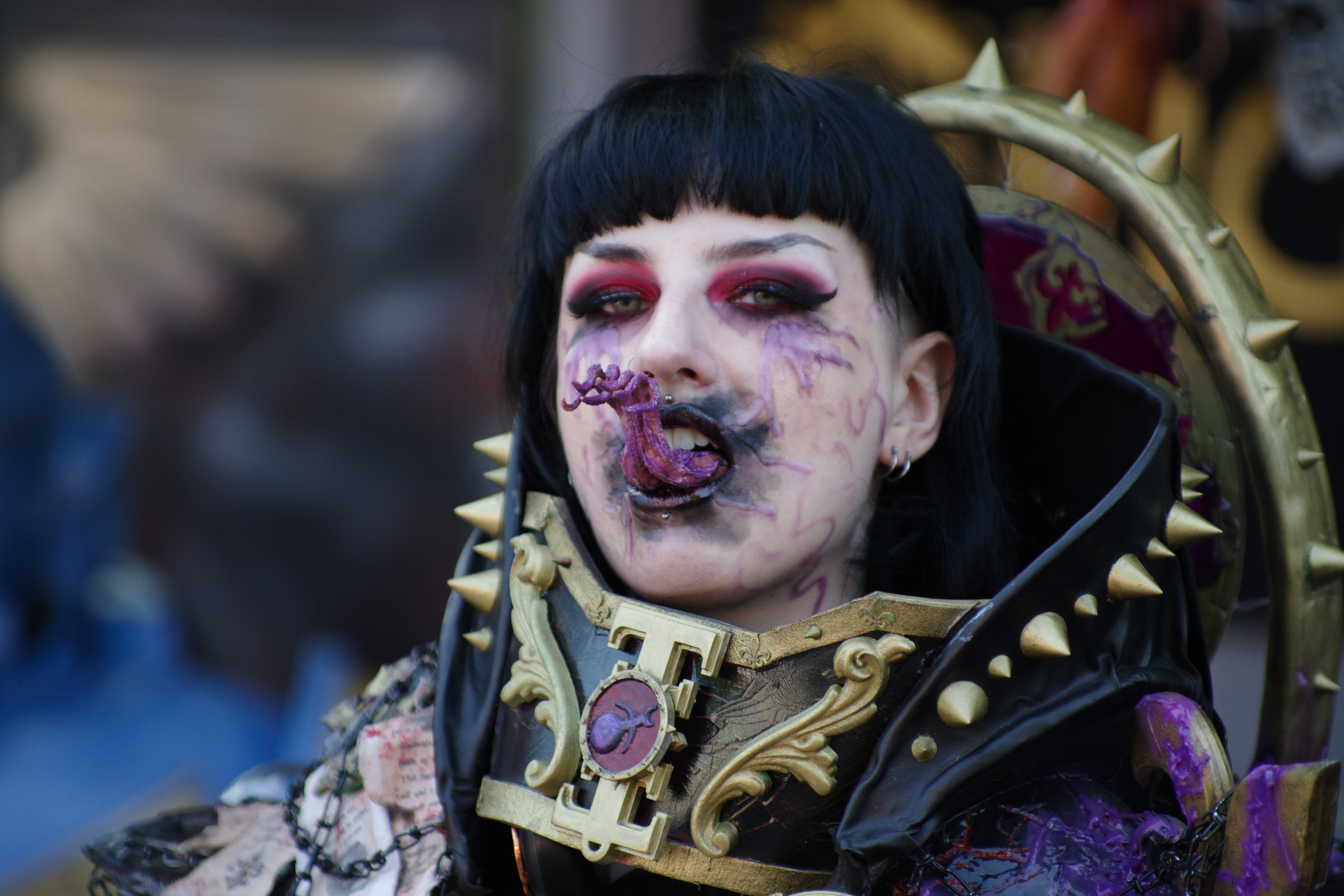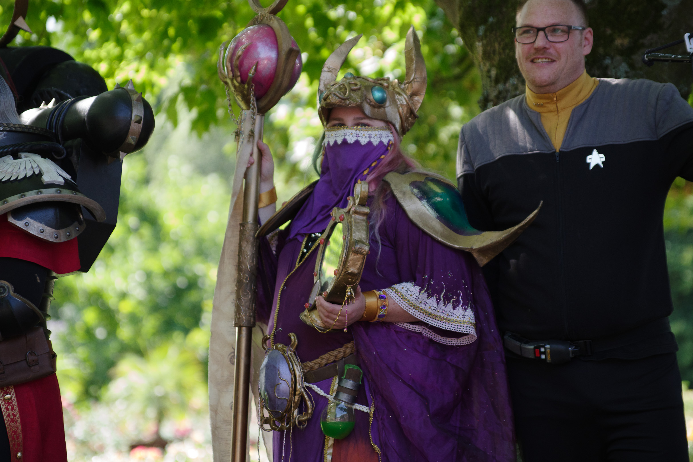 Die zu Beginn von mir erhaschten Trophäen bewegten sich bereitwillig aber zumeist umringt von anderen Besuchern im Bereich des Haupteingangs. Das machte die Sache nicht einfacher. Licht, Schatten und andere menschliche Störungen und vor allem meine eigene Unzulänglichkeit (ich musste mich in das Motivthema „menschenähnliche Gestalt“ erst mal einarbeiten und hatte in den ersten Bildern zuviel Himmel und zu wenig Beine drauf) verhinderten nur zu oft die begehrten Perspektiven auf die Maskeraden der Teilnehmer.
