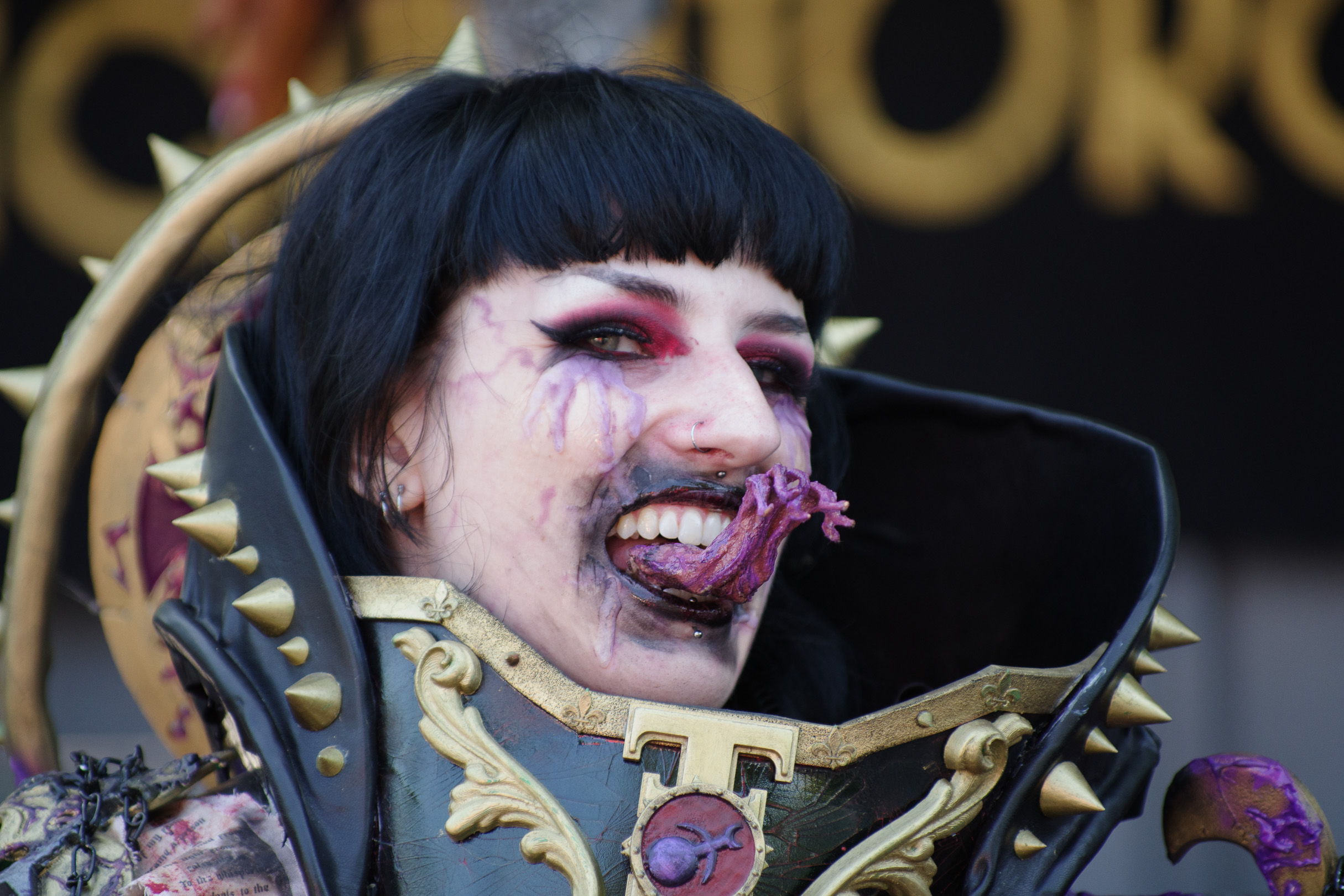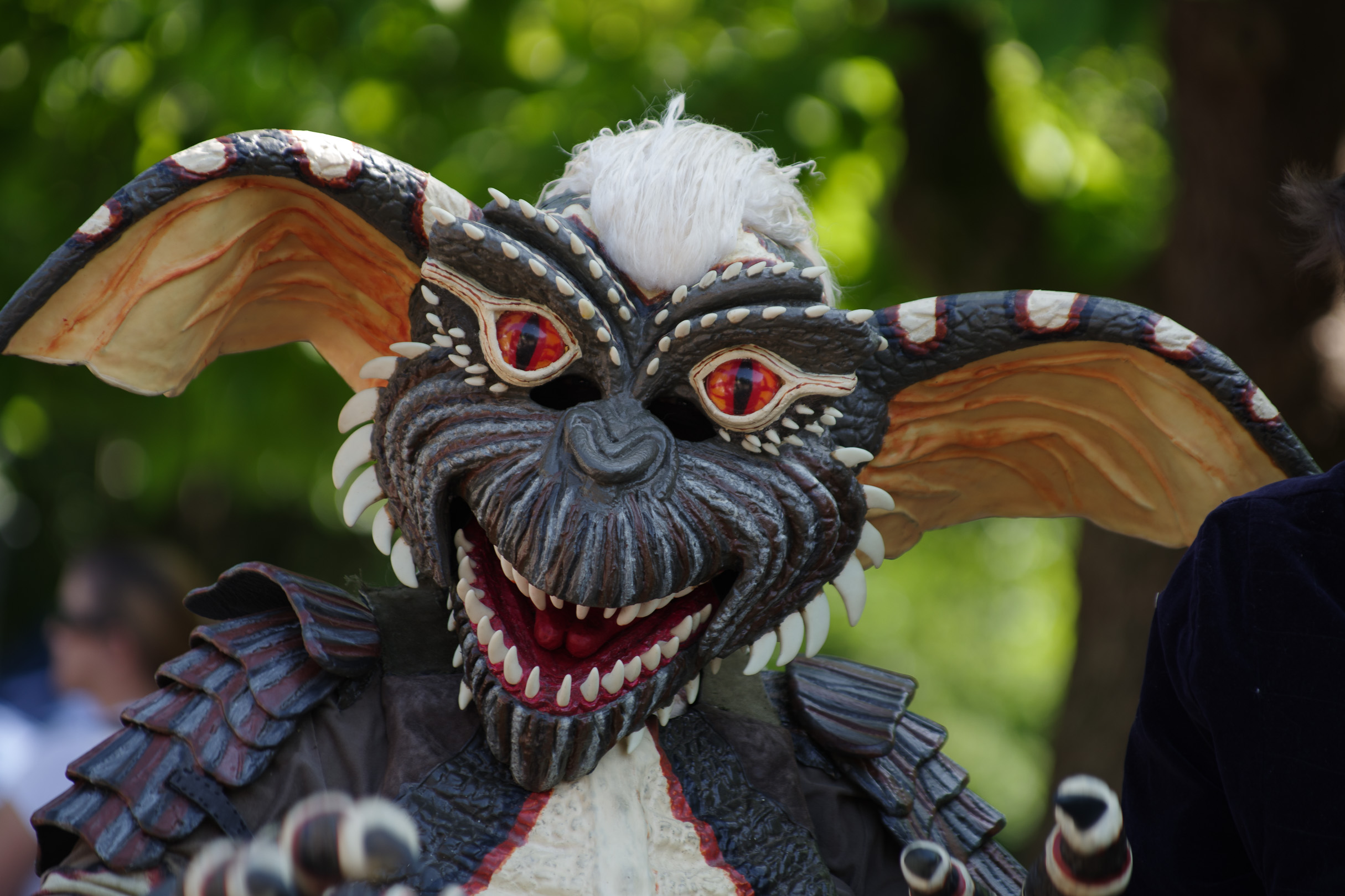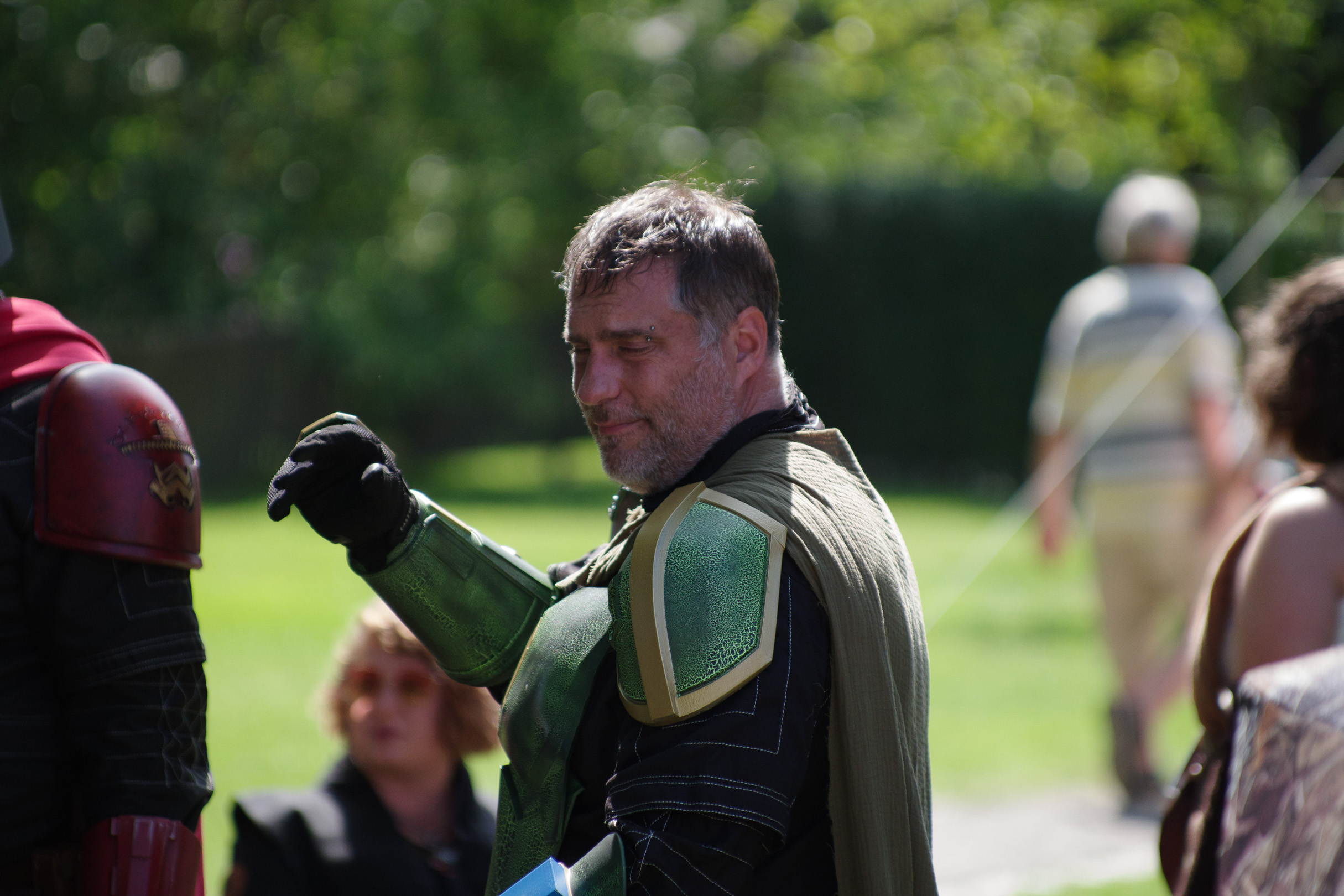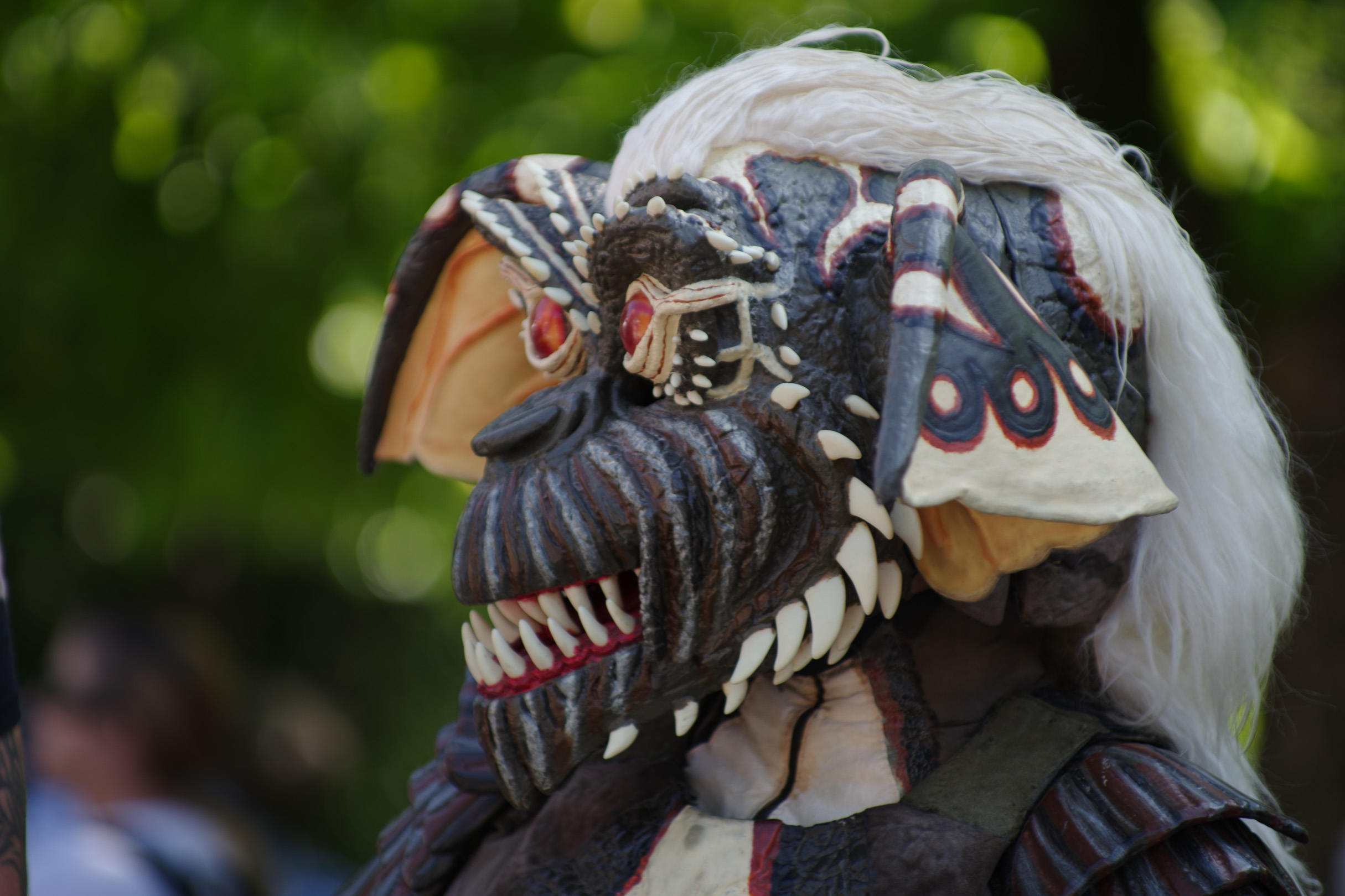 Die zu Beginn von mir erhaschten Trophäen bewegten sich bereitwillig aber zumeist umringt von anderen Besuchern im Bereich des Haupteingangs. Das machte die Sache nicht einfacher. Licht, Schatten und andere menschliche Störungen und vor allem meine eigene Unzulänglichkeit (ich musste mich in das Motivthema „menschenähnliche Gestalt“ erst mal einarbeiten und hatte in den ersten Bildern zuviel Himmel und zu wenig Beine drauf) verhinderten nur zu oft die begehrten Perspektiven auf die Maskeraden der Teilnehmer.