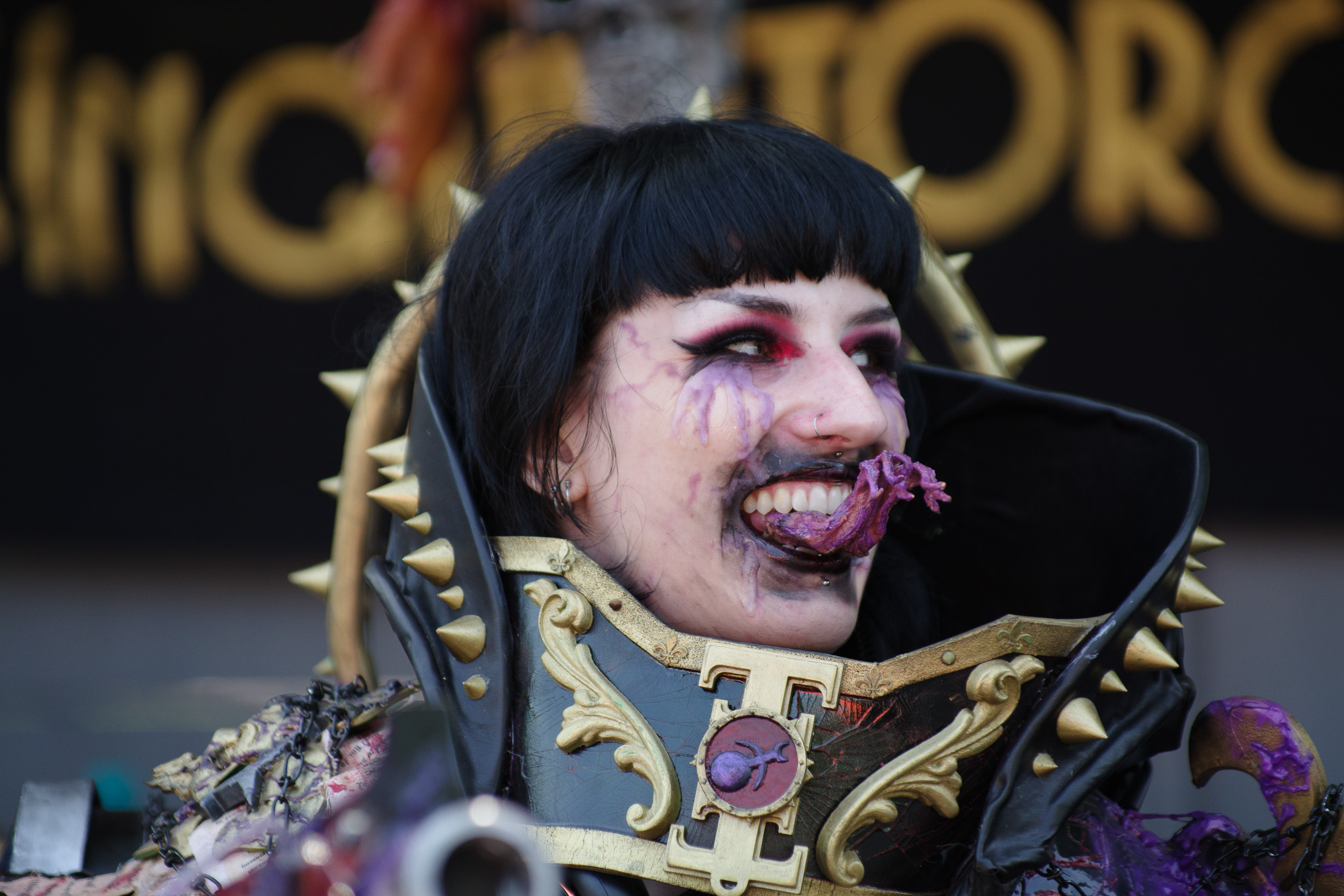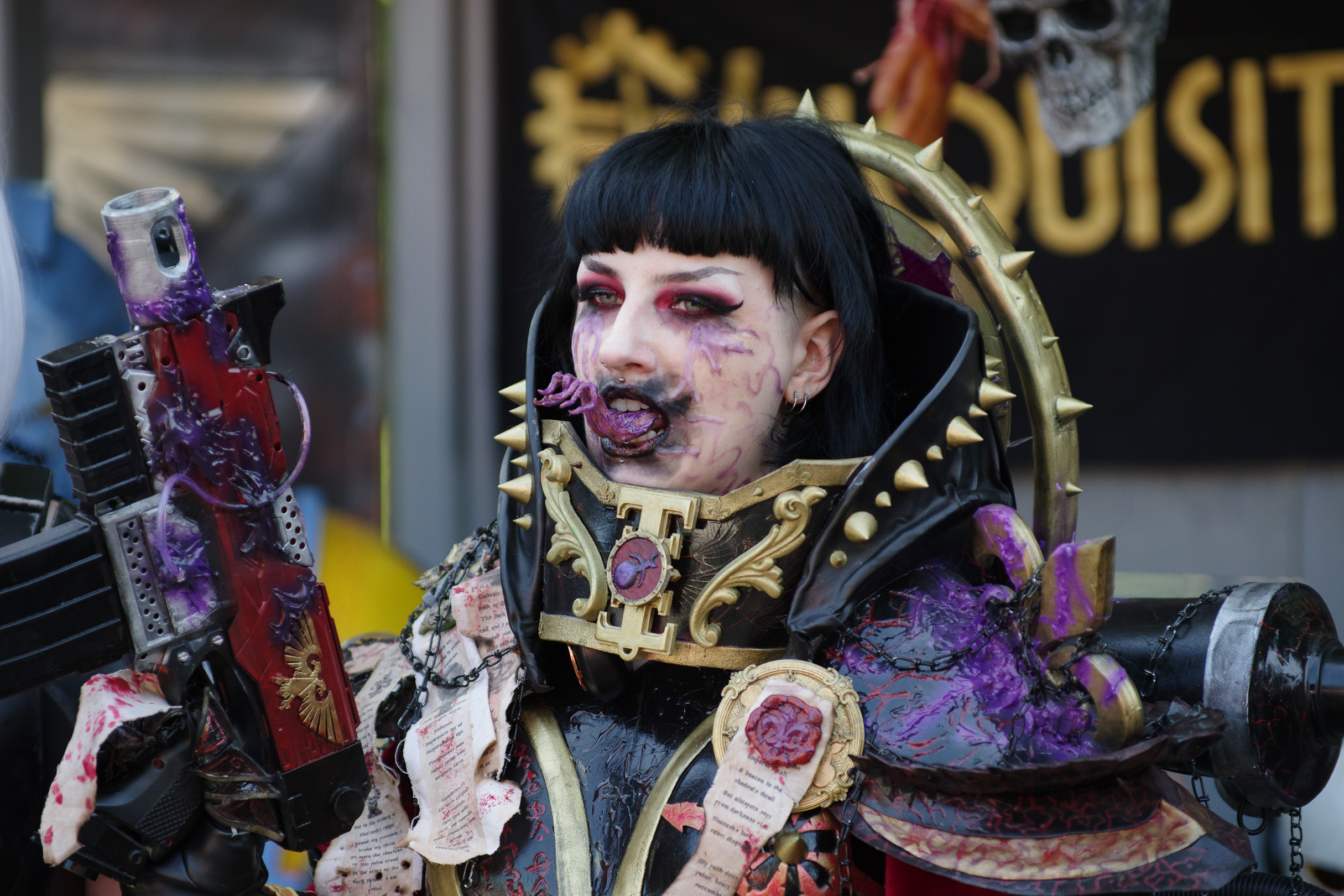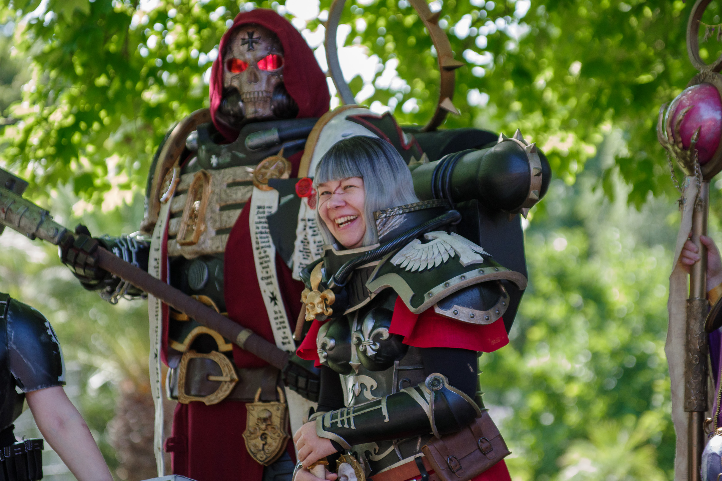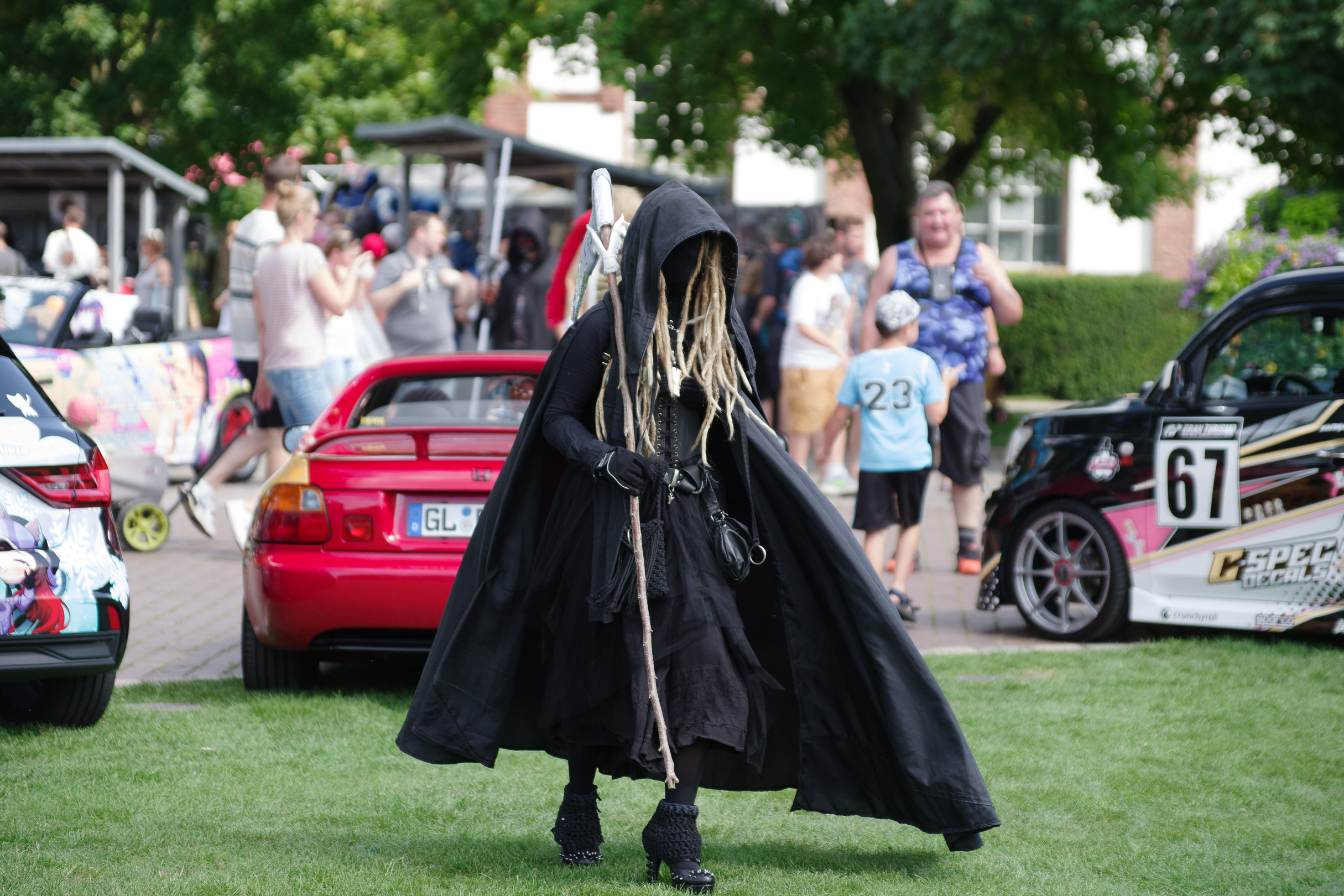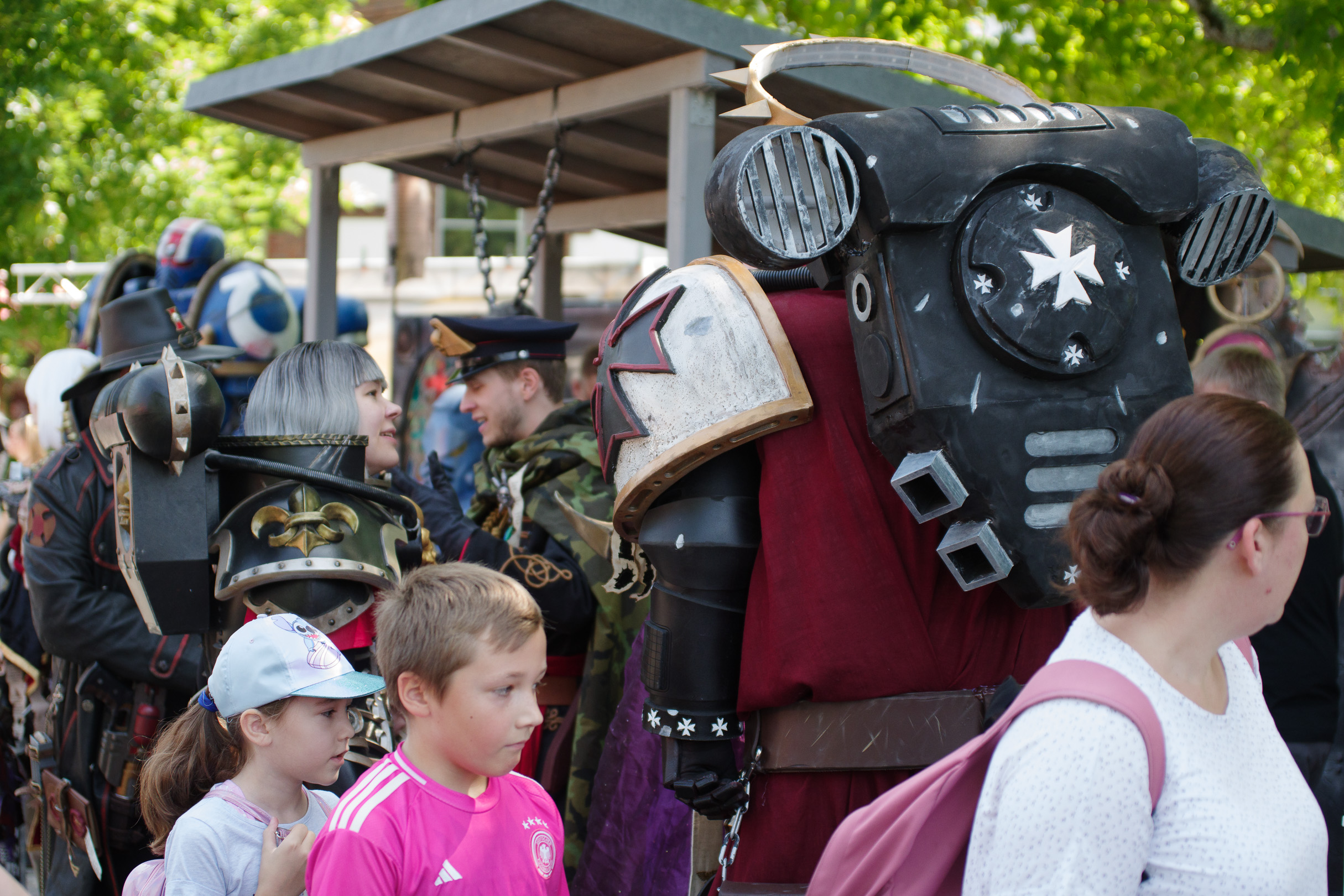Die zu Beginn von mir erhaschten Trophäen bewegten sich bereitwillig aber zumeist umringt von anderen Besuchern im Bereich des Haupteingangs. Das machte die Sache nicht einfacher. Licht, Schatten und andere menschliche Störungen und vor allem meine eigene Unzulänglichkeit (ich musste mich in das Motivthema „menschenähnliche Gestalt“ erst mal einarbeiten und hatte in den ersten Bildern zuviel Himmel und zu wenig Beine drauf) verhinderten nur zu oft die begehrten Perspektiven auf die Maskeraden der Teilnehmer.