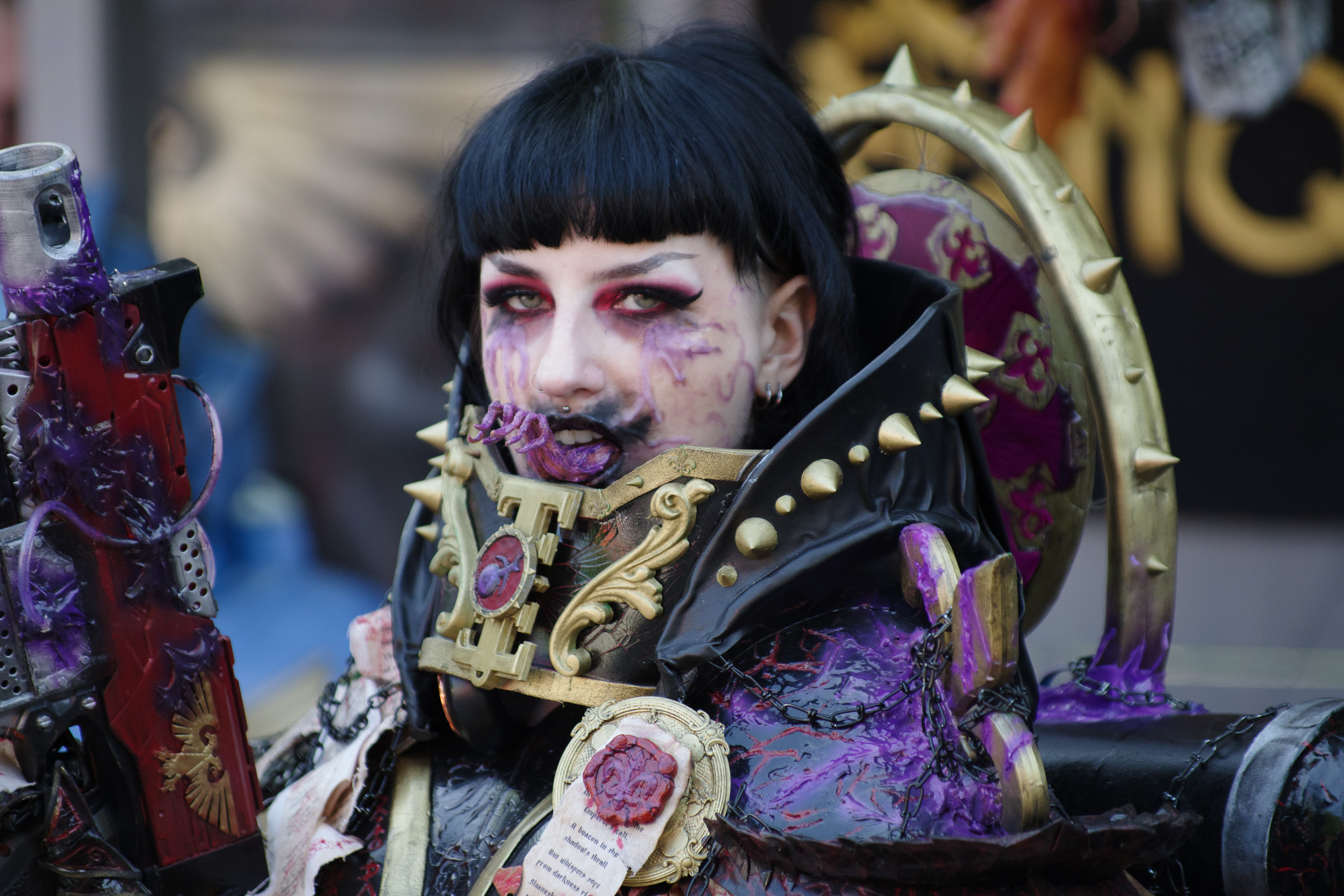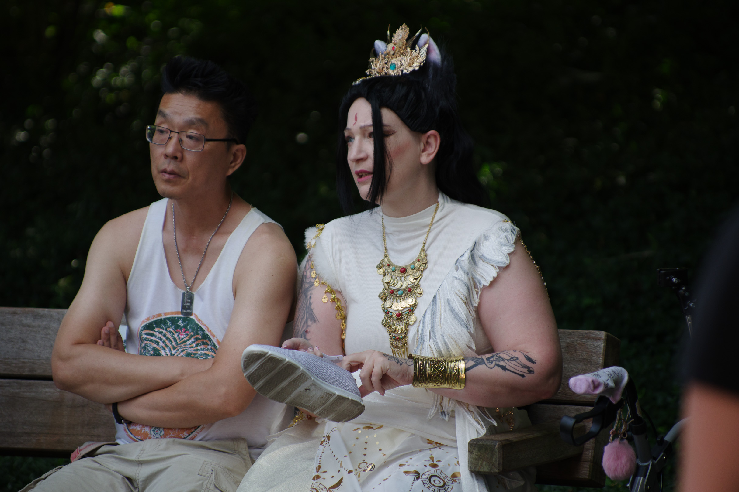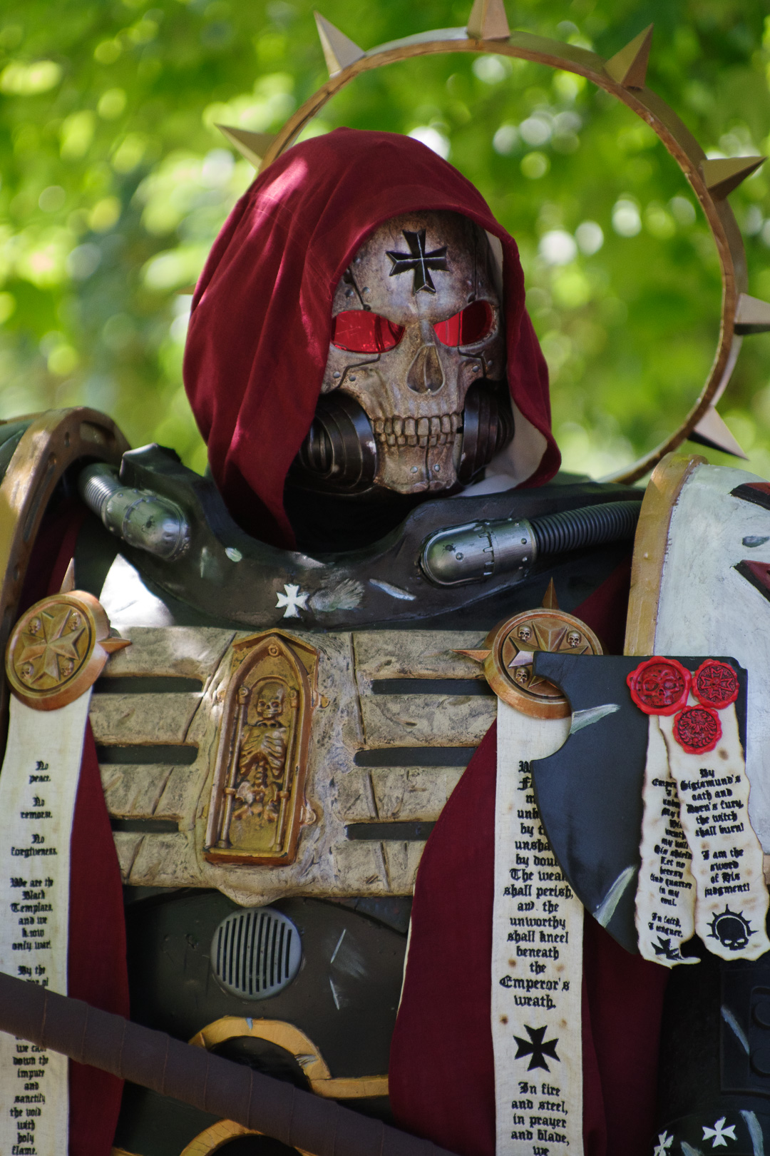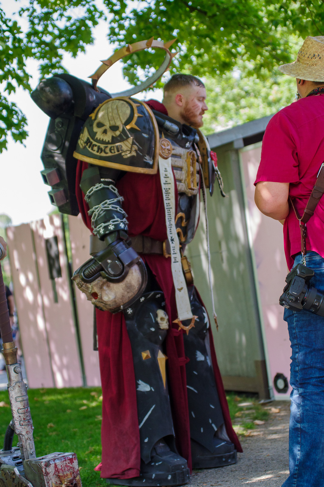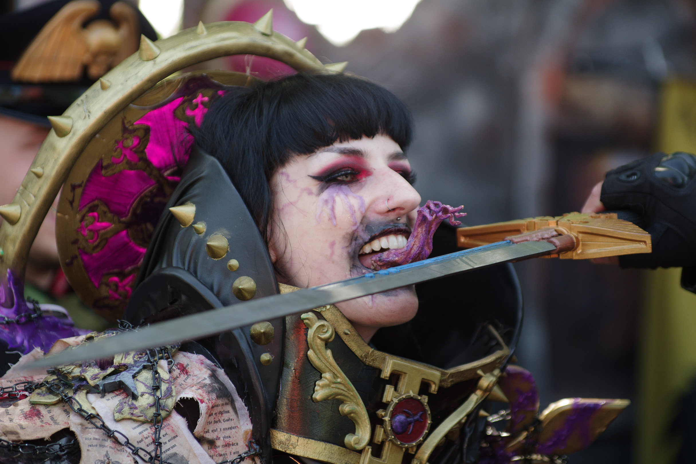 Die zu Beginn von mir erhaschten Trophäen bewegten sich bereitwillig aber zumeist umringt von anderen Besuchern im Bereich des Haupteingangs. Das machte die Sache nicht einfacher. Licht, Schatten und andere menschliche Störungen und vor allem meine eigene Unzulänglichkeit (ich musste mich in das Motivthema „menschenähnliche Gestalt“ erst mal einarbeiten und hatte in den ersten Bildern zuviel Himmel und zu wenig Beine drauf) verhinderten nur zu oft die begehrten Perspektiven auf die Maskeraden der Teilnehmer.