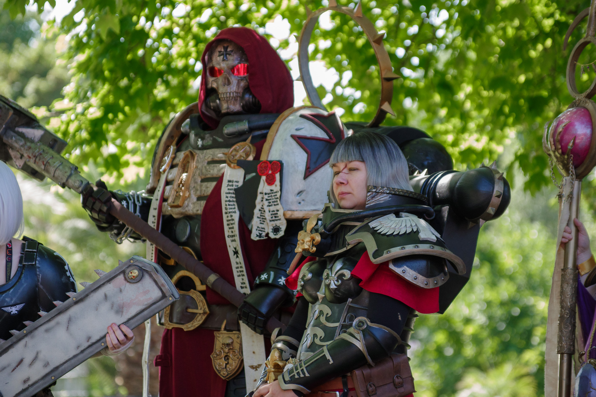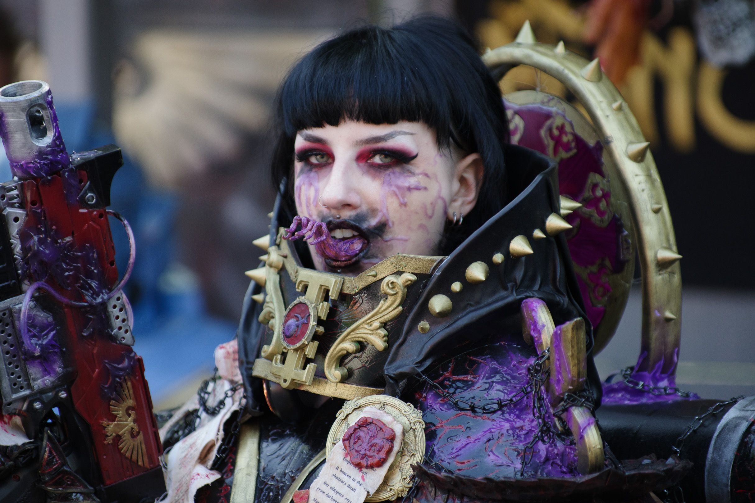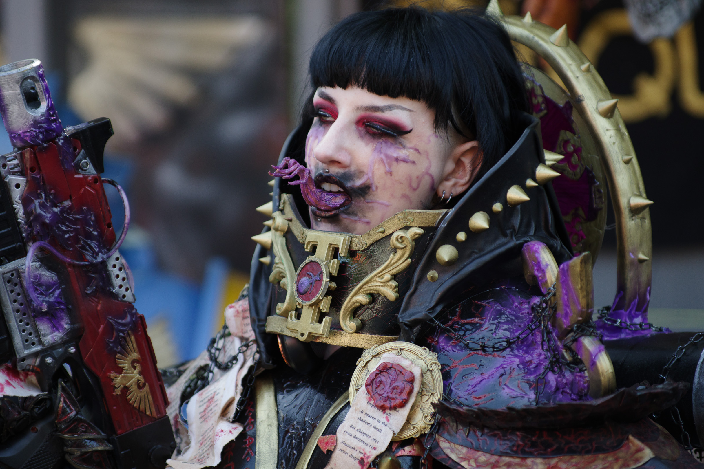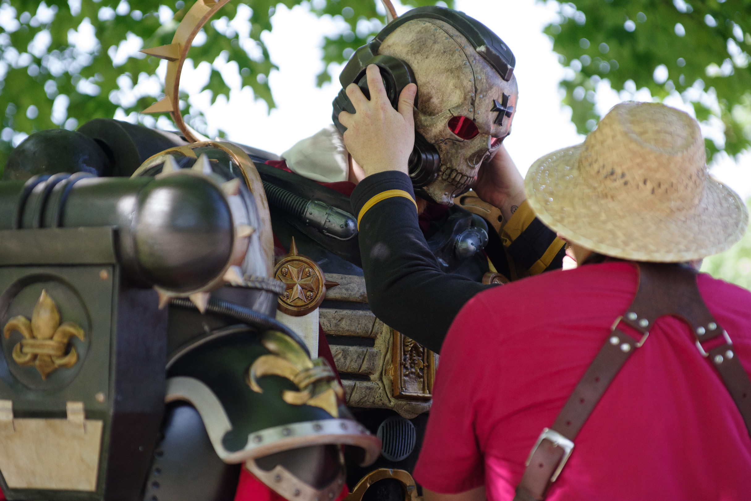 Die zu Beginn von mir erhaschten Trophäen bewegten sich bereitwillig aber zumeist umringt von anderen Besuchern im Bereich des Haupteingangs. Das machte die Sache nicht einfacher. Licht, Schatten und andere menschliche Störungen und vor allem meine eigene Unzulänglichkeit (ich musste mich in das Motivthema „menschenähnliche Gestalt“ erst mal einarbeiten und hatte in den ersten Bildern zuviel Himmel und zu wenig Beine drauf) verhinderten nur zu oft die begehrten Perspektiven auf die Maskeraden der Teilnehmer.