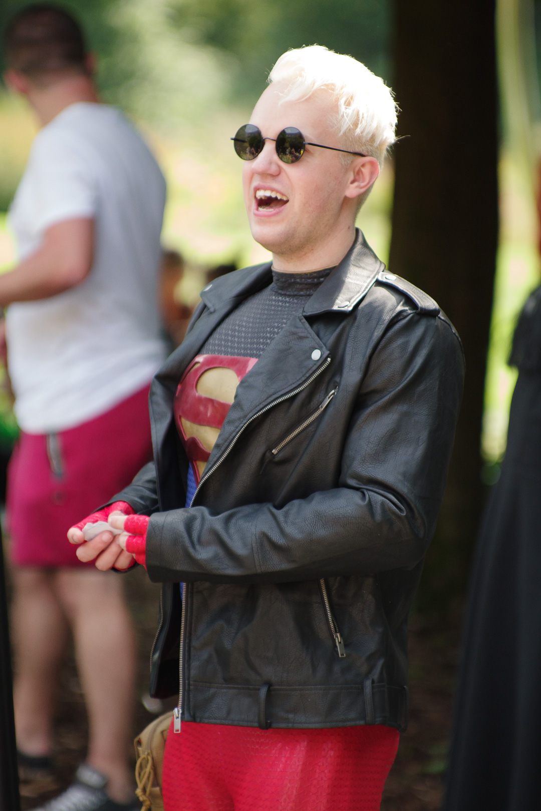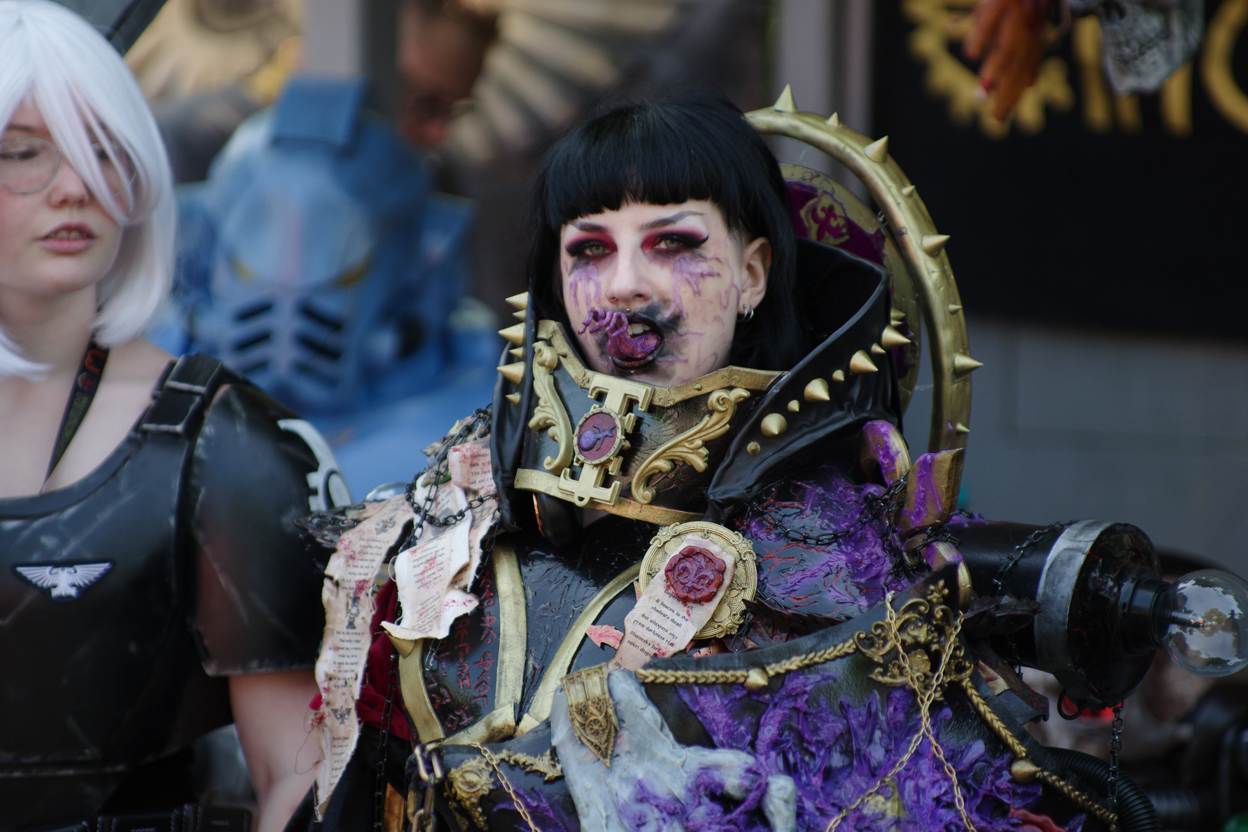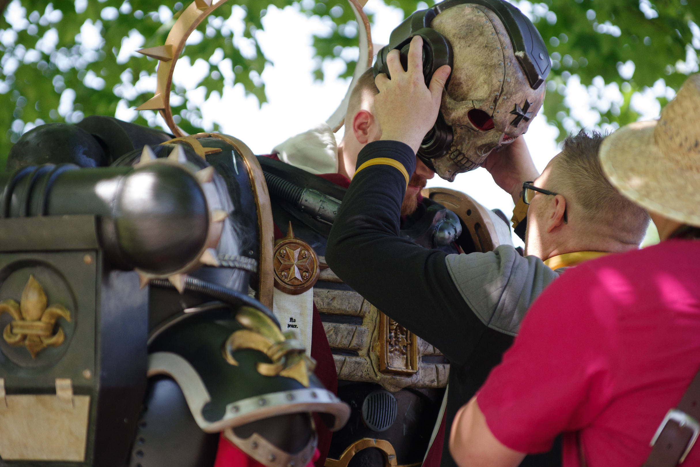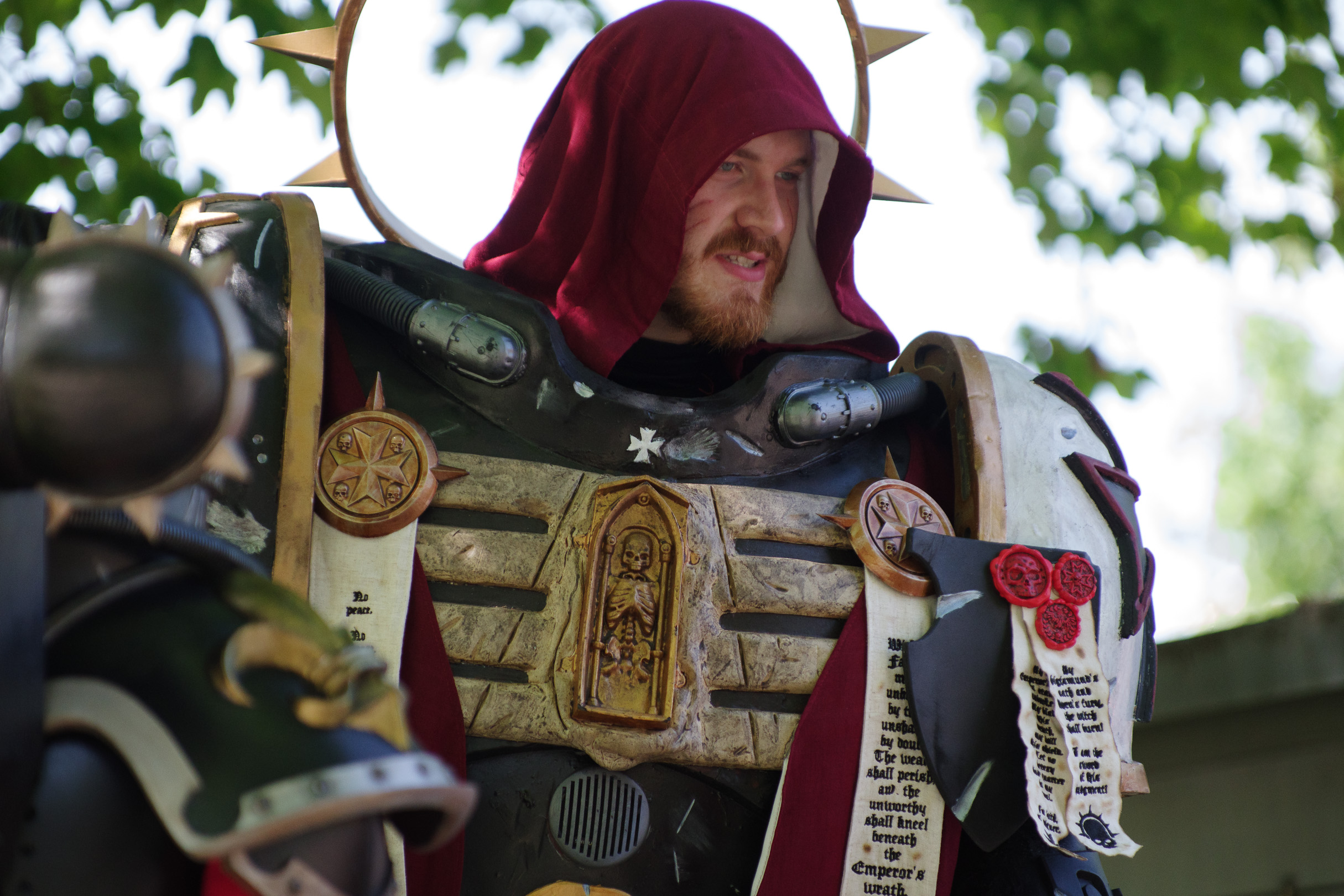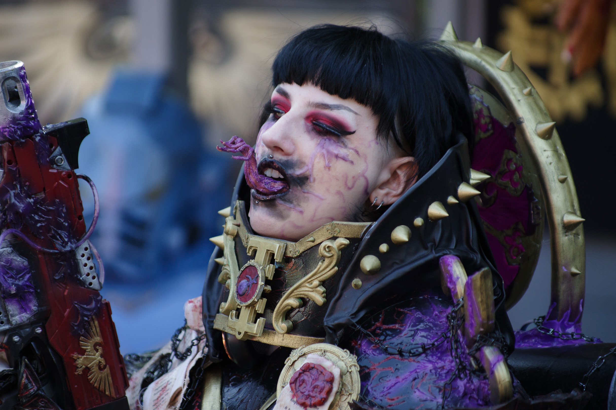 Die zu Beginn von mir erhaschten Trophäen bewegten sich bereitwillig aber zumeist umringt von anderen Besuchern im Bereich des Haupteingangs. Das machte die Sache nicht einfacher. Licht, Schatten und andere menschliche Störungen und vor allem meine eigene Unzulänglichkeit (ich musste mich in das Motivthema „menschenähnliche Gestalt“ erst mal einarbeiten und hatte in den ersten Bildern zuviel Himmel und zu wenig Beine drauf) verhinderten nur zu oft die begehrten Perspektiven auf die Maskeraden der Teilnehmer.