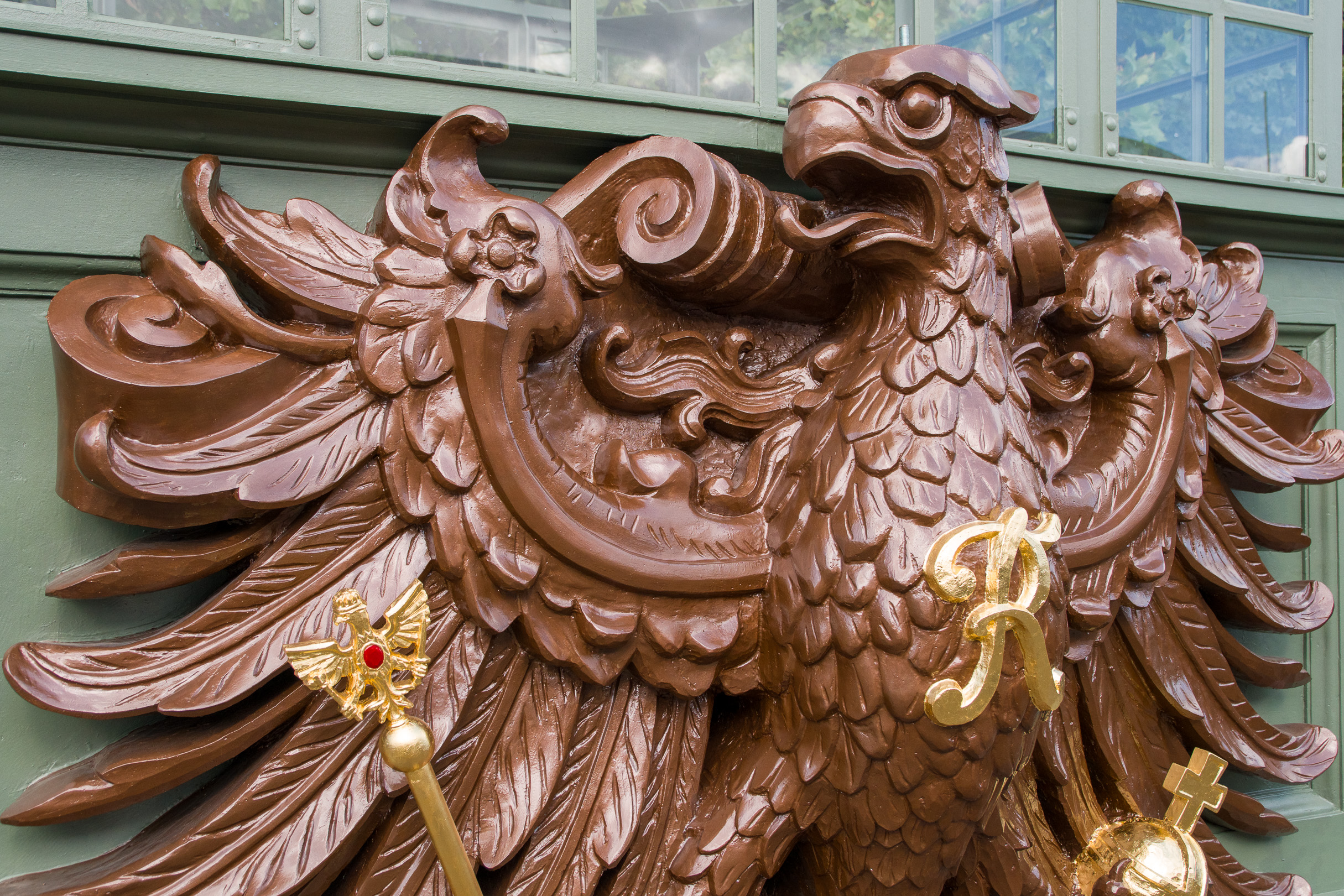 Wer das verbrochen hat, gehört gesteinigt: die Puppe wurde hochglanzkackbraun angepinselt und die Insignien mit noch glänzenderem Hochglanzgold etwas viel zu kitschig zum Leuchten gebracht.