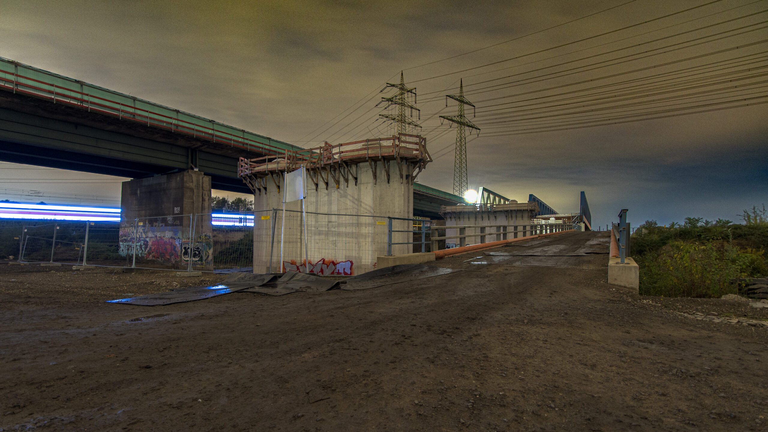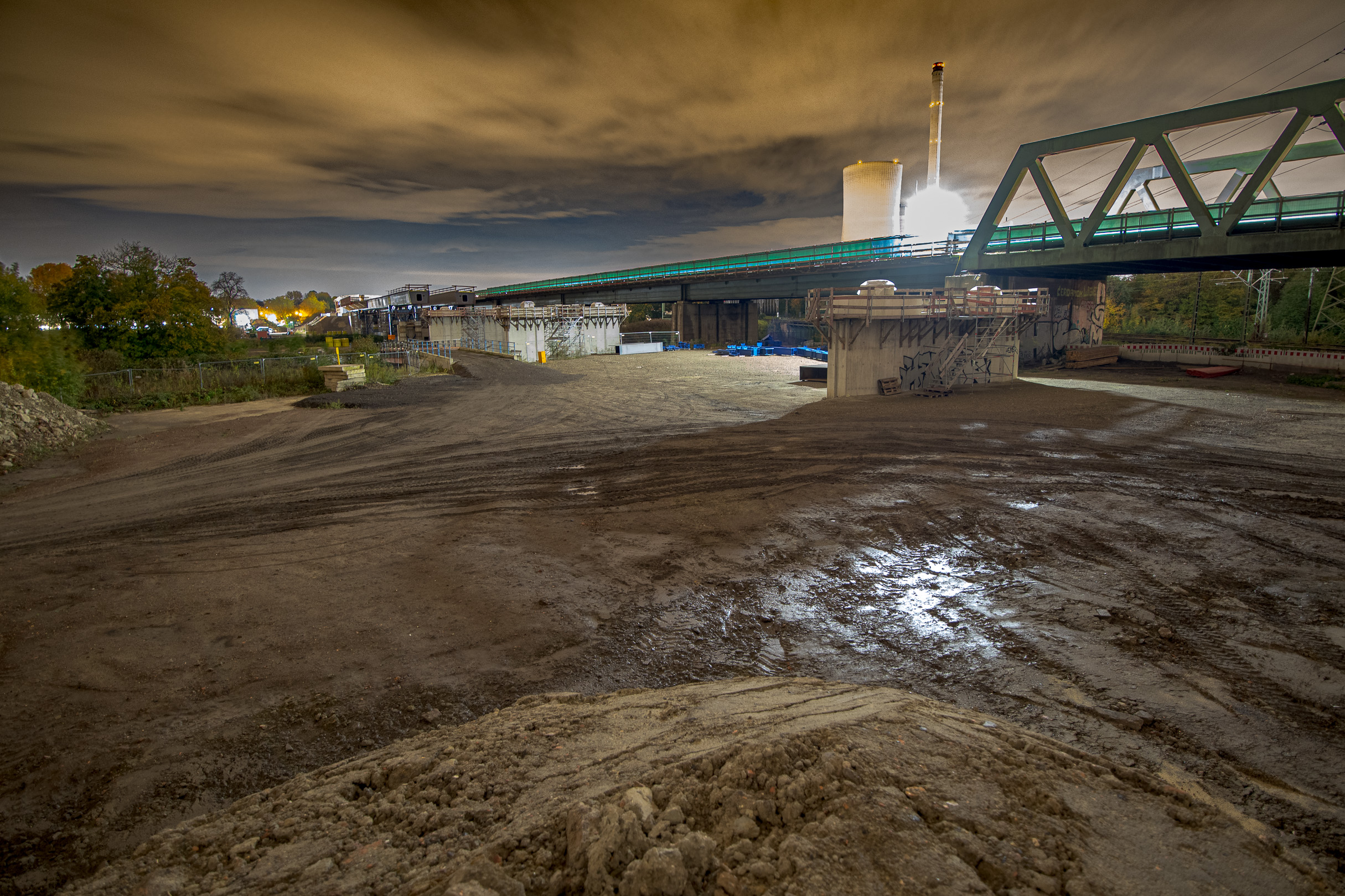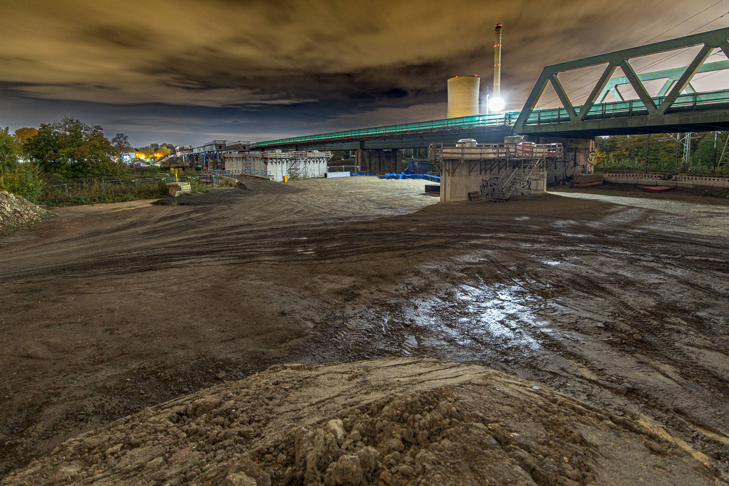 Denn hier wird nachts NICHT gearbeitet. Das ist für einen allgemein wünschenswerten zügigen Baufortschritt zwar eher nicht so toll, für einen Besuch, um sich da mal Auge machend nach dem Stand der Dinge zu erkundigen, dann aber schon wieder recht praktikabel, weil man ja quasi freie Bahn an den Bahnen hat. Denn es handelt sich tatsächlich nicht nur um die Auto-, sondern auch um mehrere Eisenbahnlinien und Schifffahrtsrouten, die an dieser Stelle für munteres Verkehrsaufkommen sorgen.