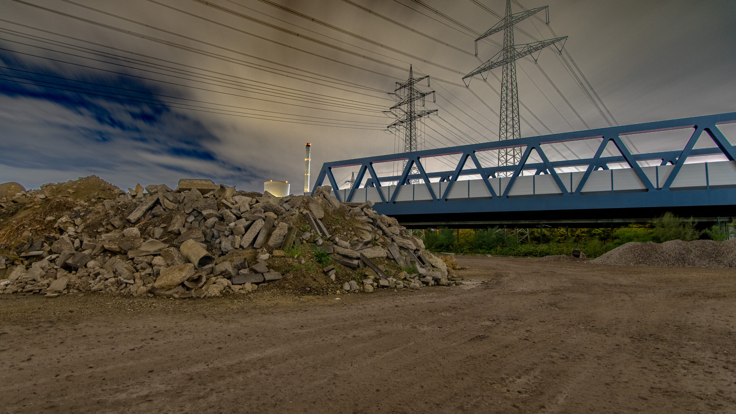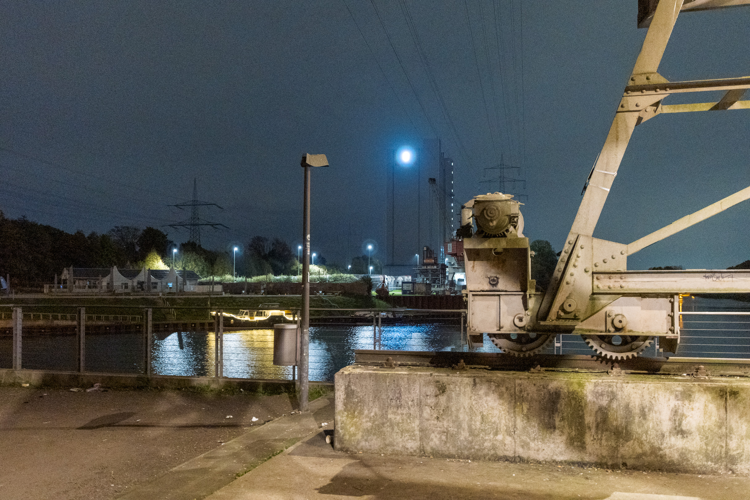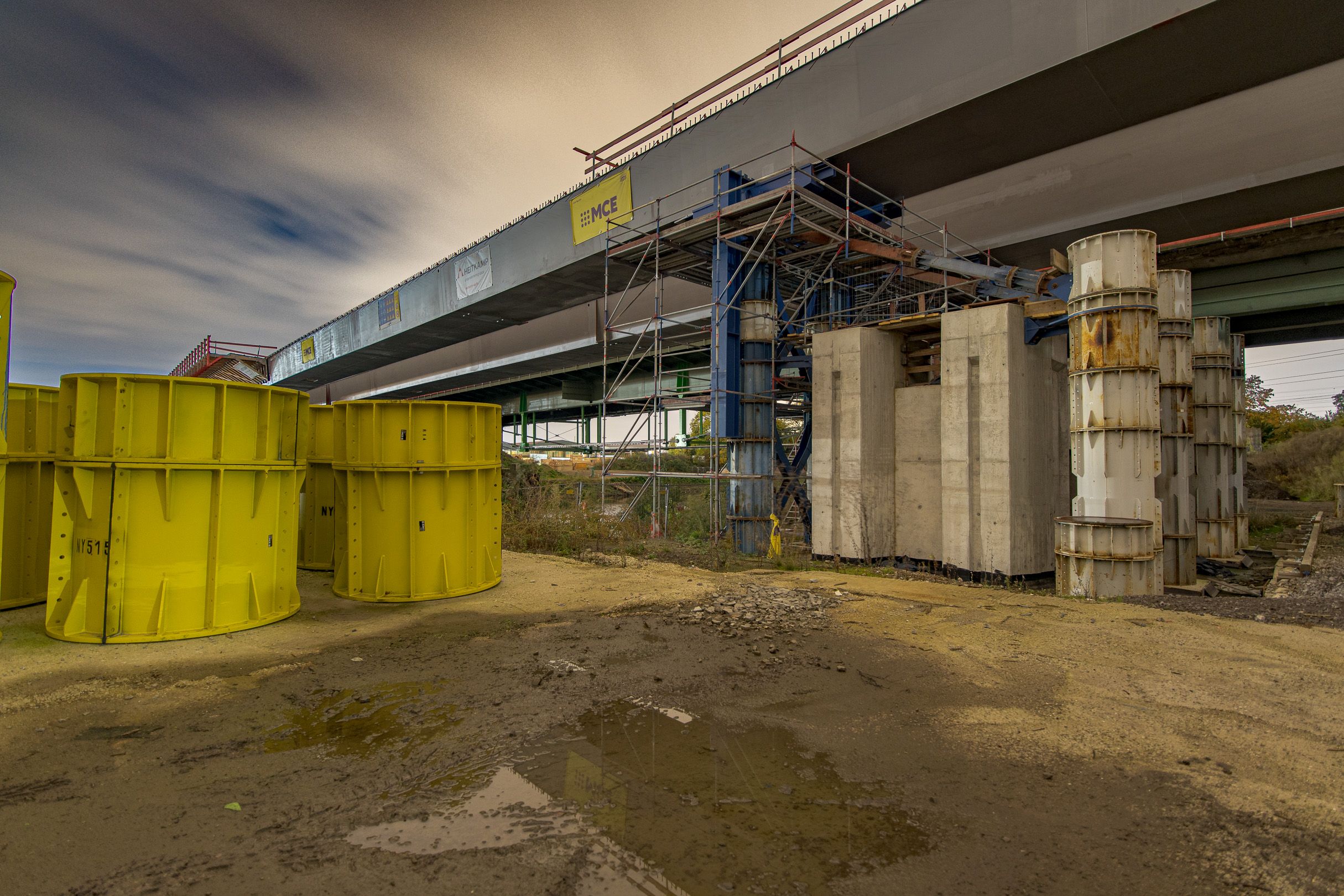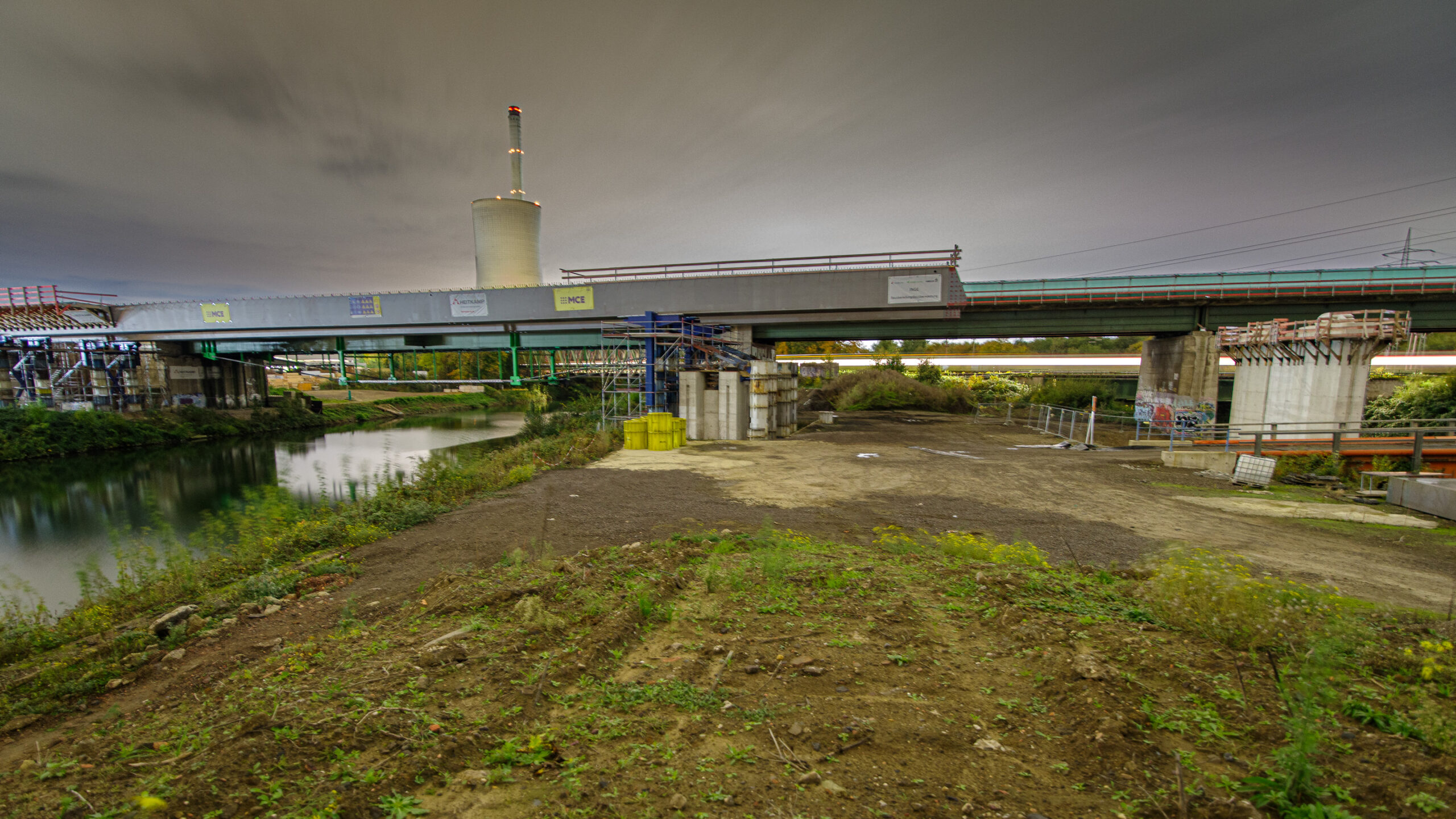 Denn hier wird nachts NICHT gearbeitet. Das ist für einen allgemein wünschenswerten zügigen Baufortschritt zwar eher nicht so toll, für einen Besuch, um sich da mal Auge machend nach dem Stand der Dinge zu erkundigen, dann aber schon wieder recht praktikabel, weil man ja quasi freie Bahn an den Bahnen hat. Denn es handelt sich tatsächlich nicht nur um die Auto-, sondern auch um mehrere Eisenbahnlinien und Schifffahrtsrouten, die an dieser Stelle für munteres Verkehrsaufkommen sorgen.