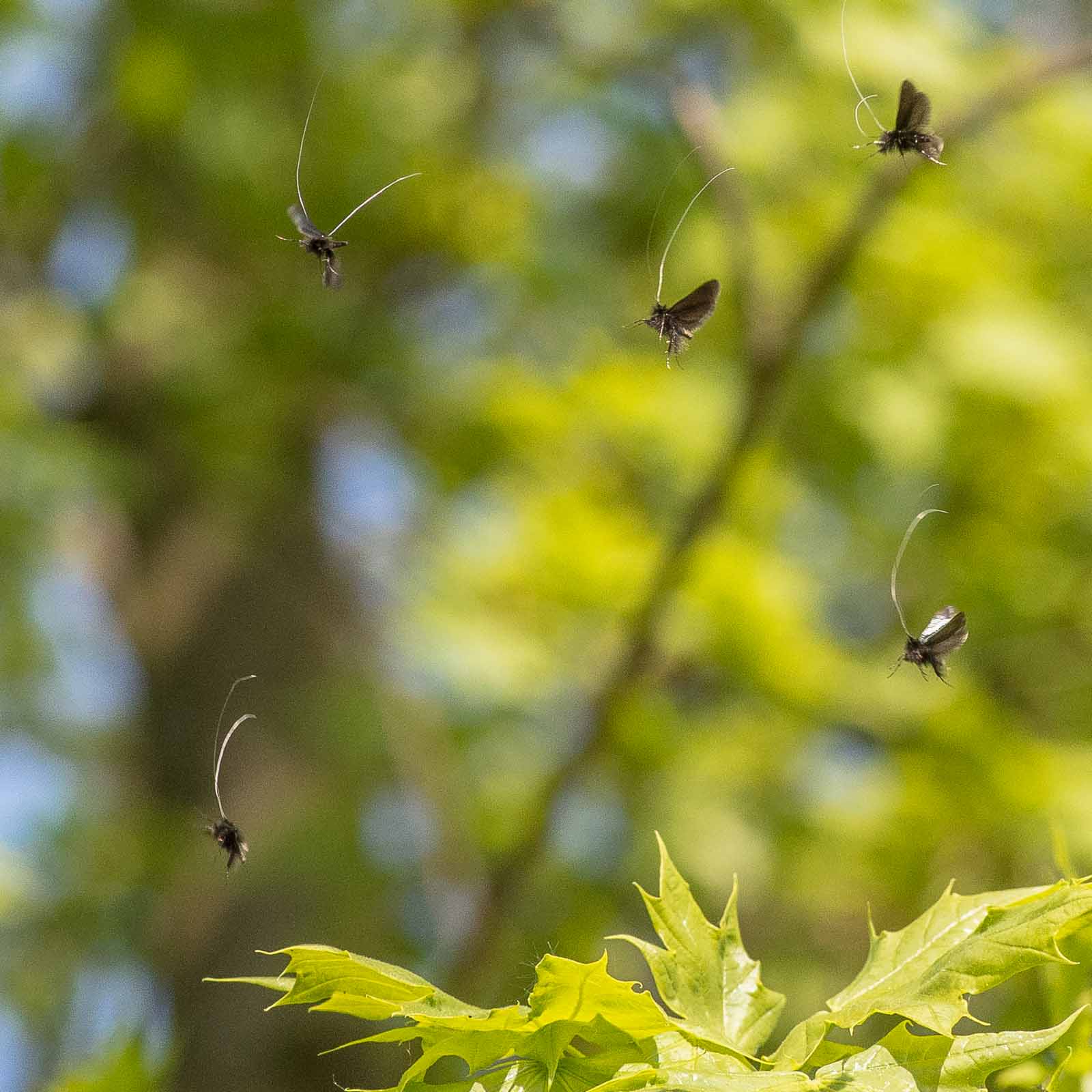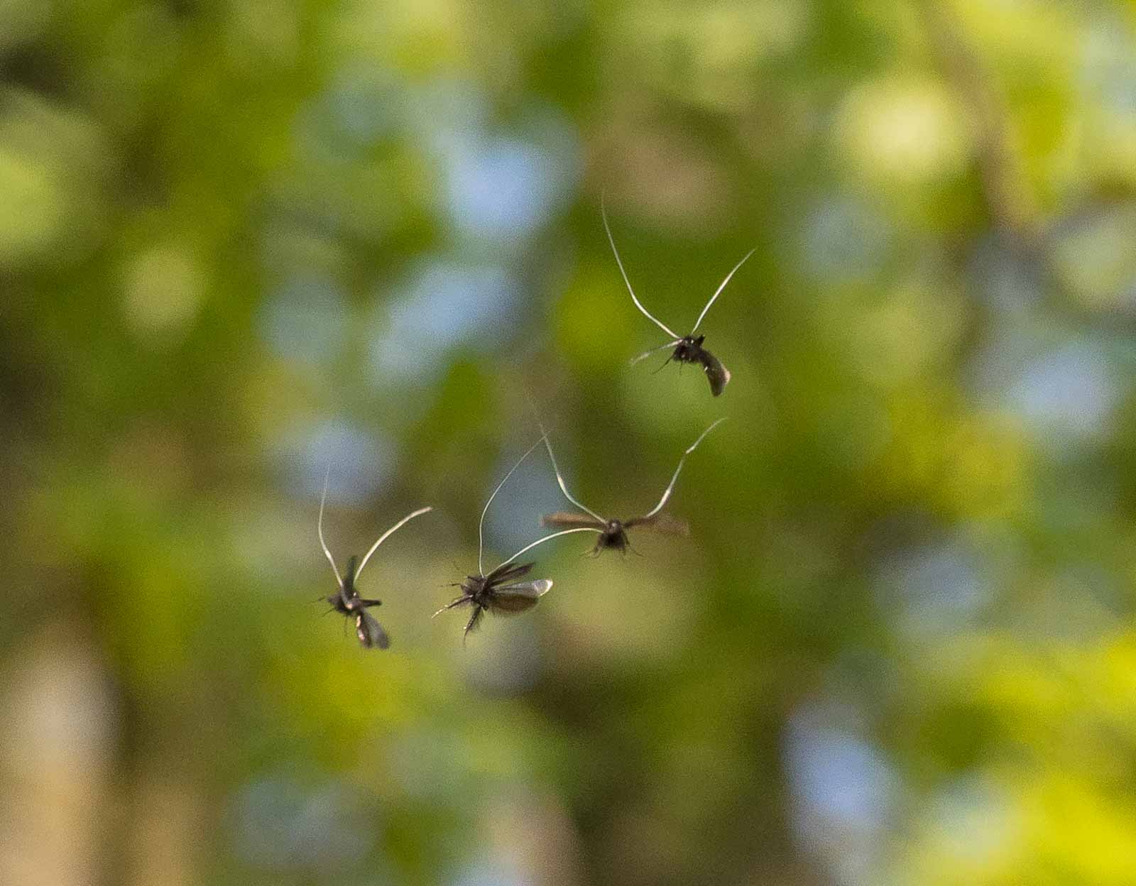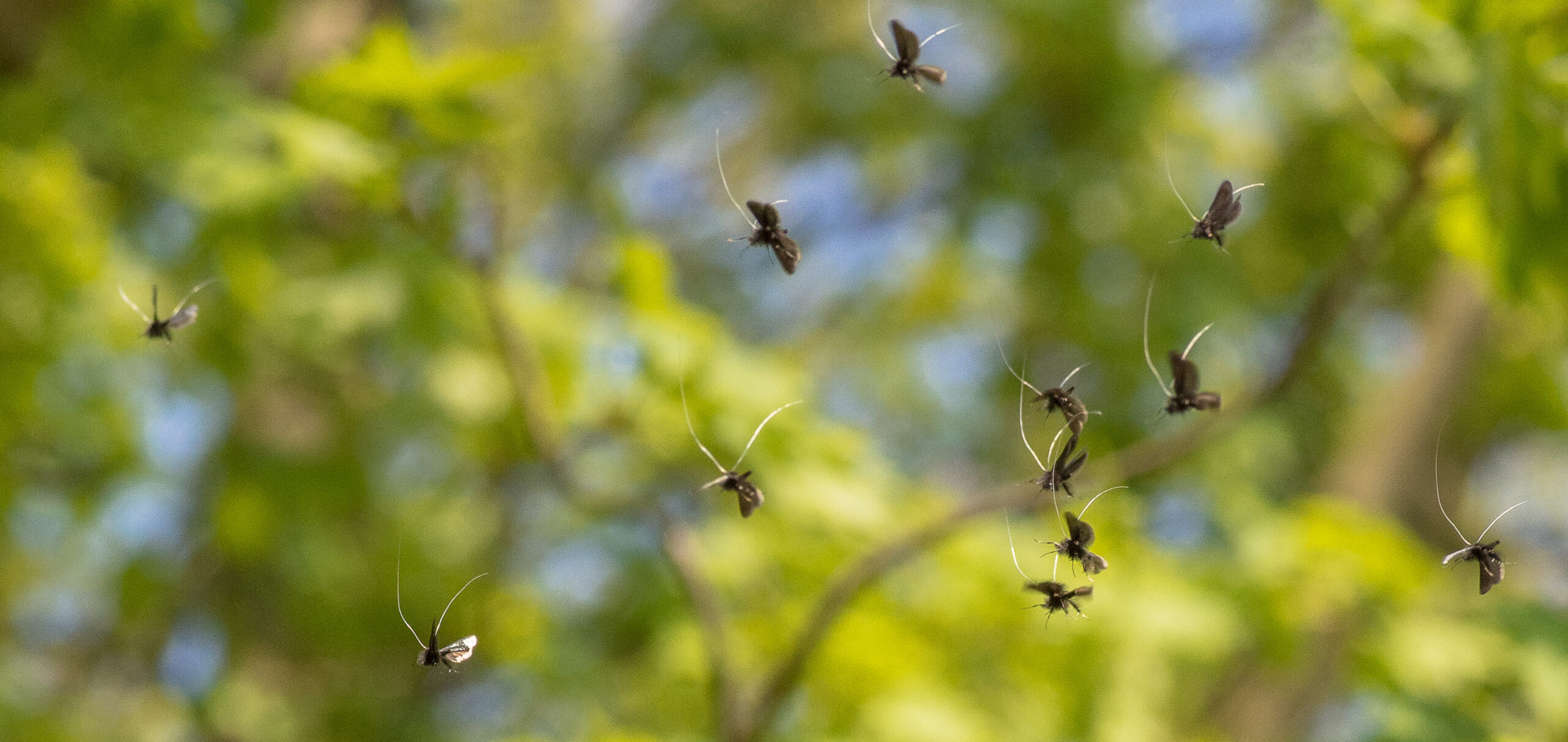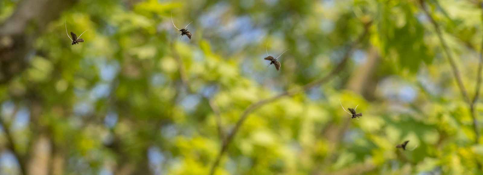 Die Angaben über die Flugzeiten der Falter reichen von Ende März bis Juni. Die Männchen bilden an besonnten Waldrändern Schwärme von bis zu 30 Exemplaren, die Äste von Buchen (Fagus), Eichen (Quercus), Ahorn (Acer), Eschen (Fraxinus) und anderen Laubbäumen umtänzeln. Dabei werden Blätter und Zweige von der unteren Region bis in die Wipfelregion umflogen. Während des Fluges sind die langen Fühler steil nach oben und hinten gerichtet. Die Weibchen schwärmen nicht, sondern leben versteckt in der Strauchschicht. Die Falter paaren sich im Flug, wenn ein Weibchen einen Schwarm Männchen anfliegt. Der gemeinsame Flug während der Kopulation ist nur von kurzer Dauer, anschließend lassen sich die Falter in der Bodenvegetation nieder.