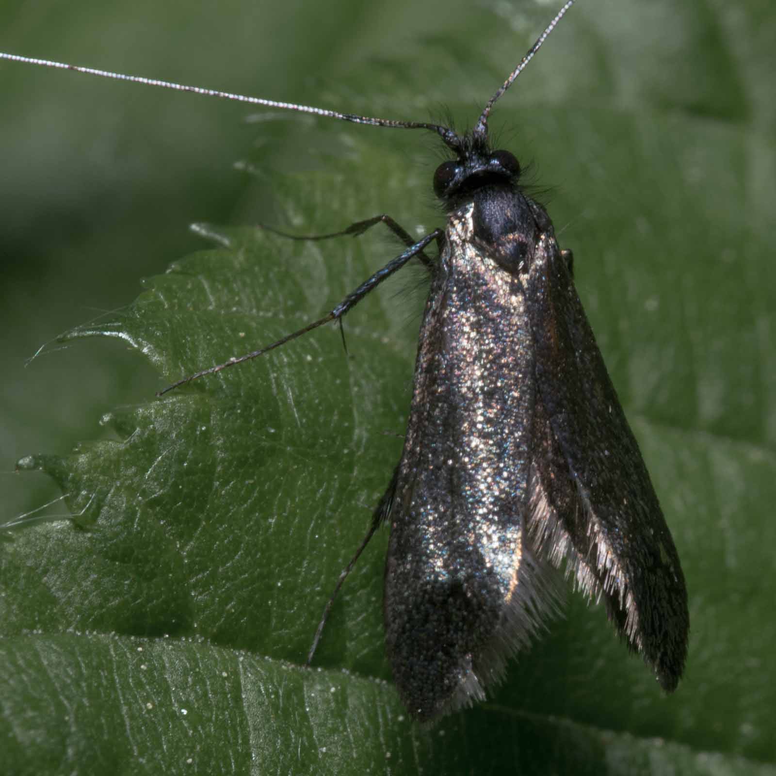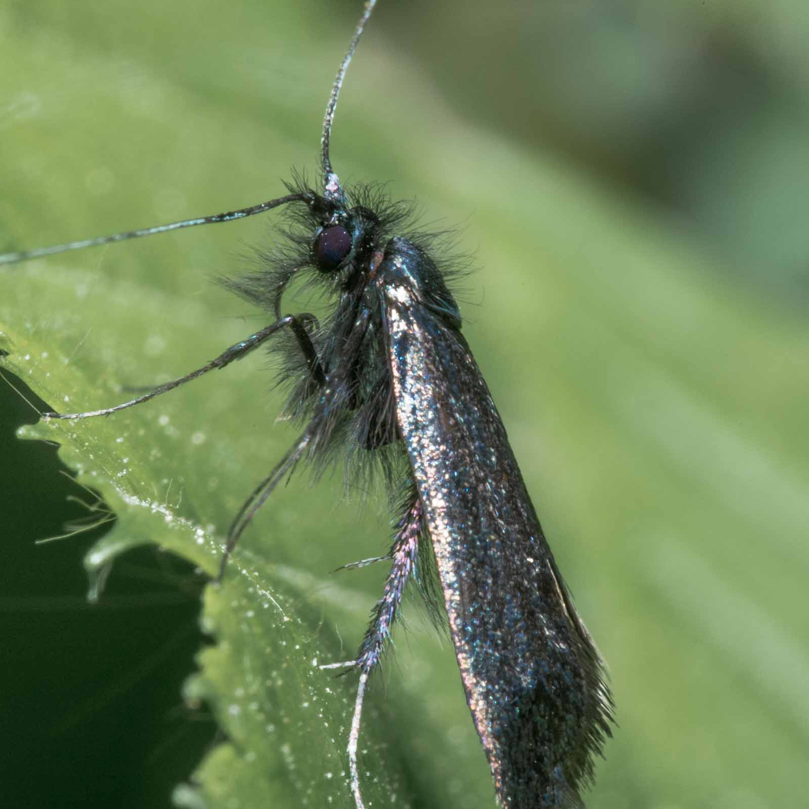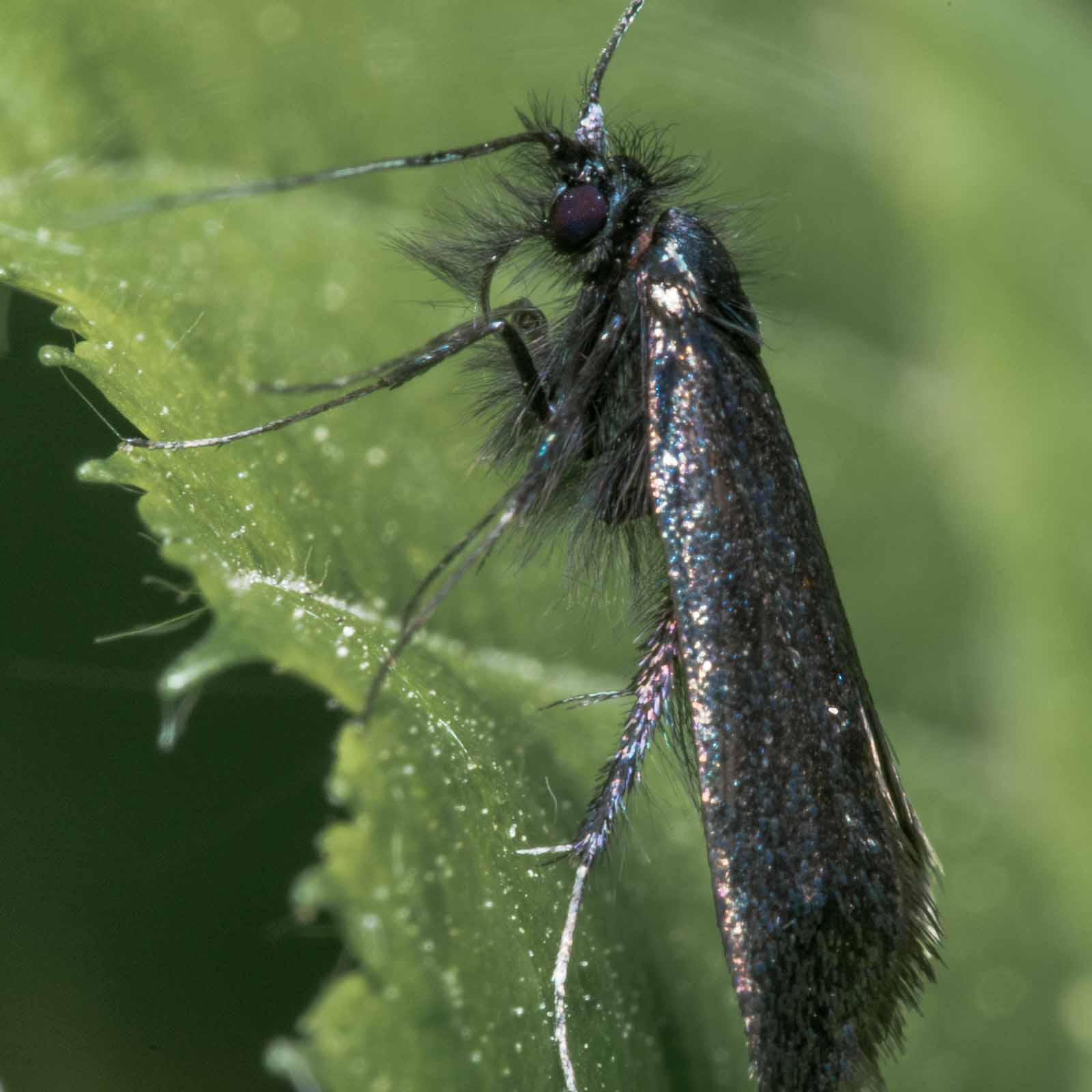 Die Falter erreichen eine Flügelspannweite von 14 bis 18 Millimetern. Die Männchen haben lange, weißliche Fühler die etwa dreimal so lang wie die Flügel sind. Bei den Weibchen sind sie deutlich kürzer und erreichen etwa die 1,5 – fache Flügellänge. Die Vorderflügel beider Geschlechter sind bronzefarben oder metallisch grün. Die Hinterflügel sind schwarz und glänzen violett.