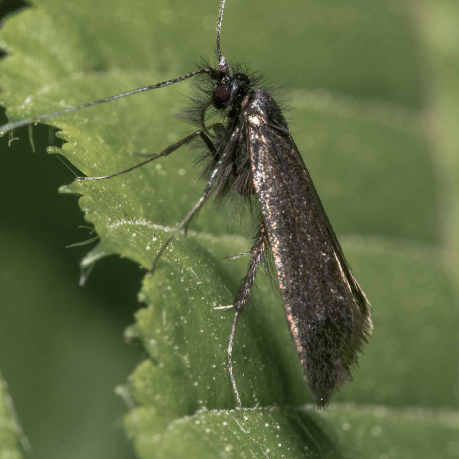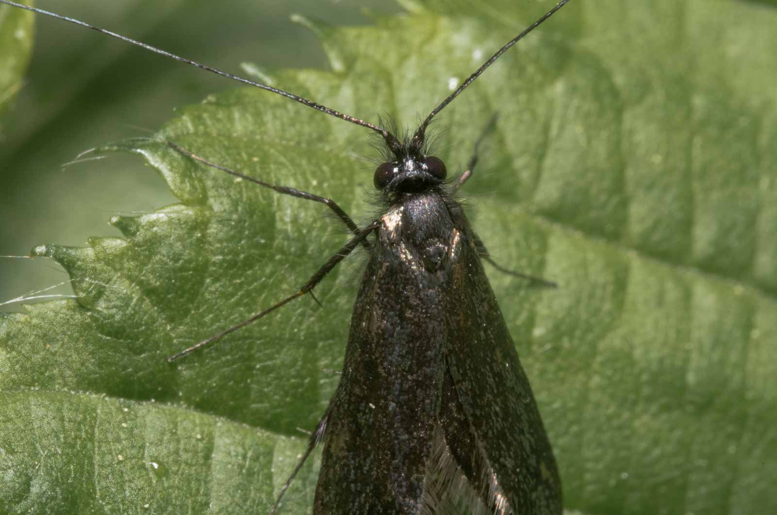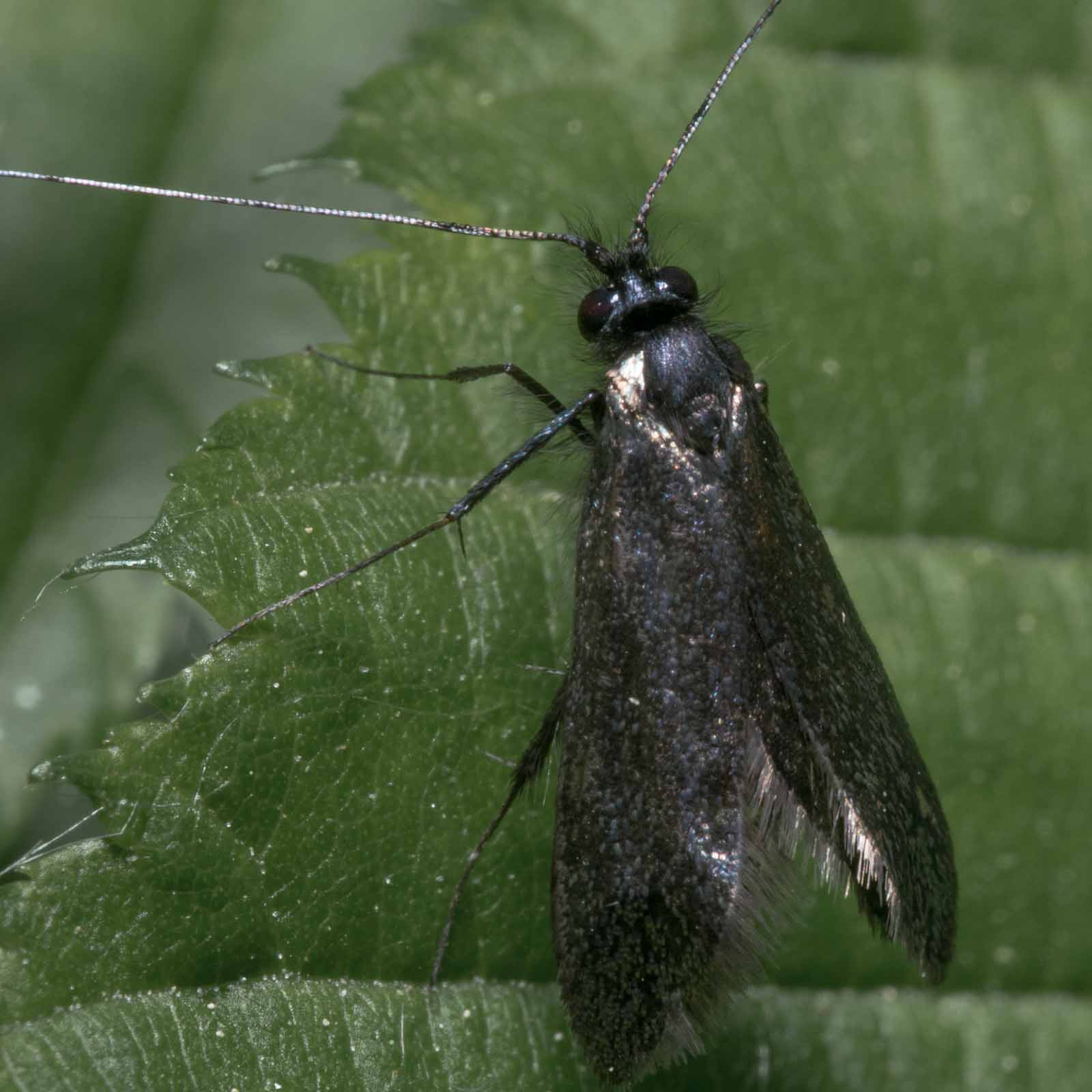 Die Falter erreichen eine Flügelspannweite von 14 bis 18 Millimetern. Die Männchen haben lange, weißliche Fühler die etwa dreimal so lang wie die Flügel sind. Bei den Weibchen sind sie deutlich kürzer und erreichen etwa die 1,5 – fache Flügellänge. Die Vorderflügel beider Geschlechter sind bronzefarben oder metallisch grün. Die Hinterflügel sind schwarz und glänzen violett.