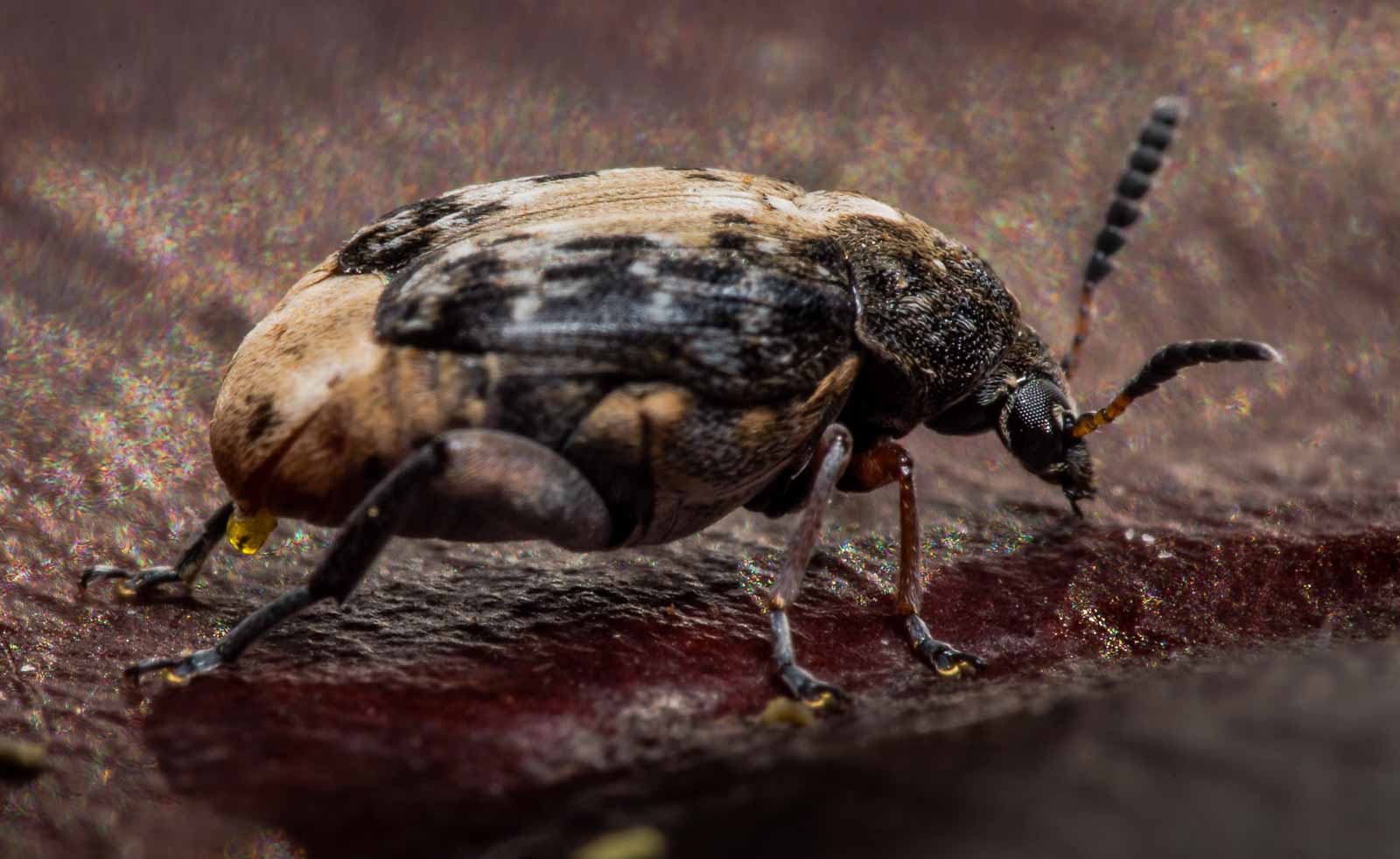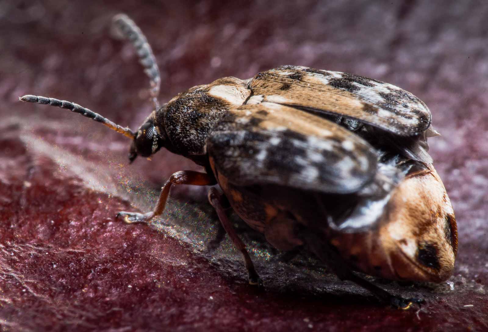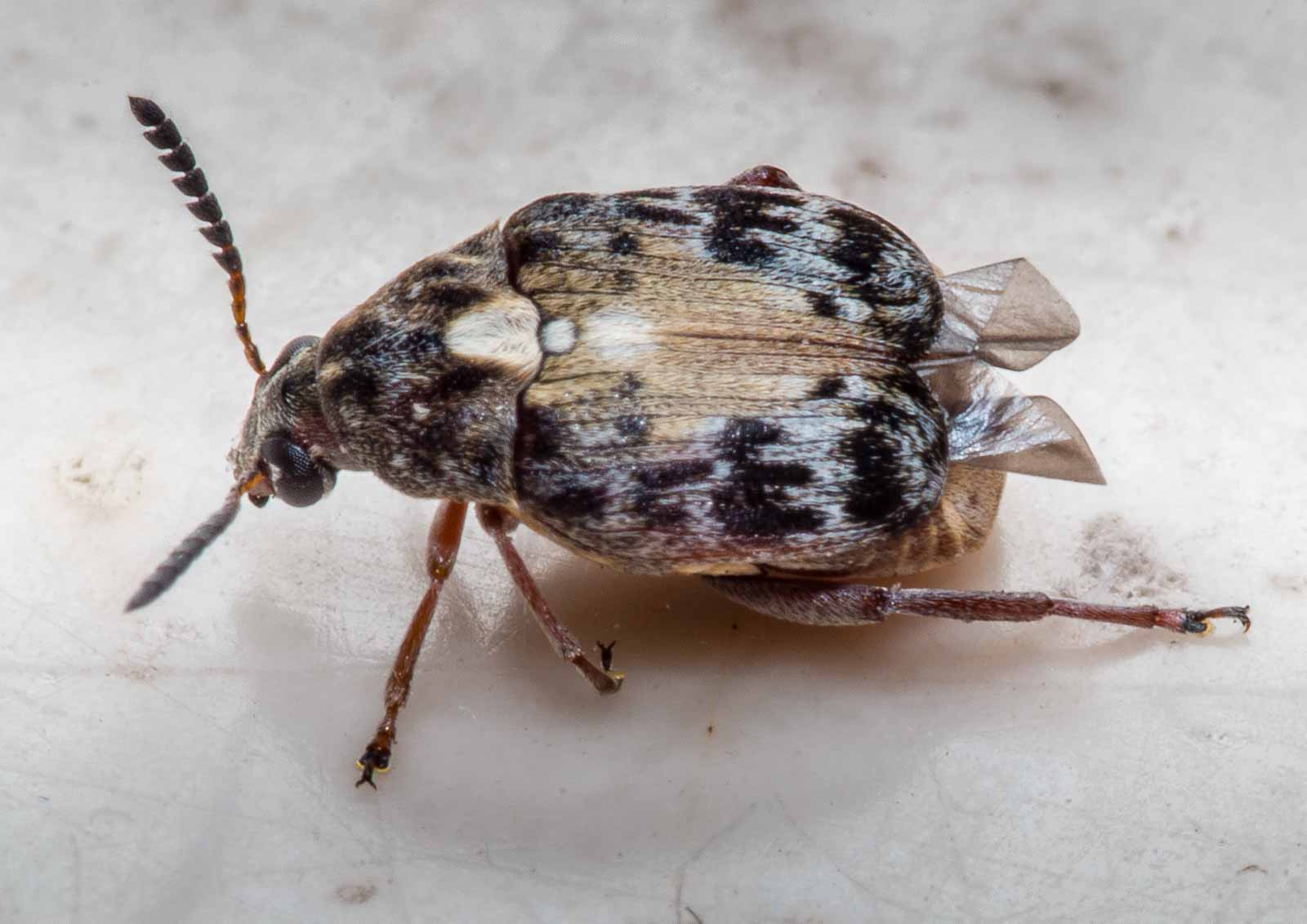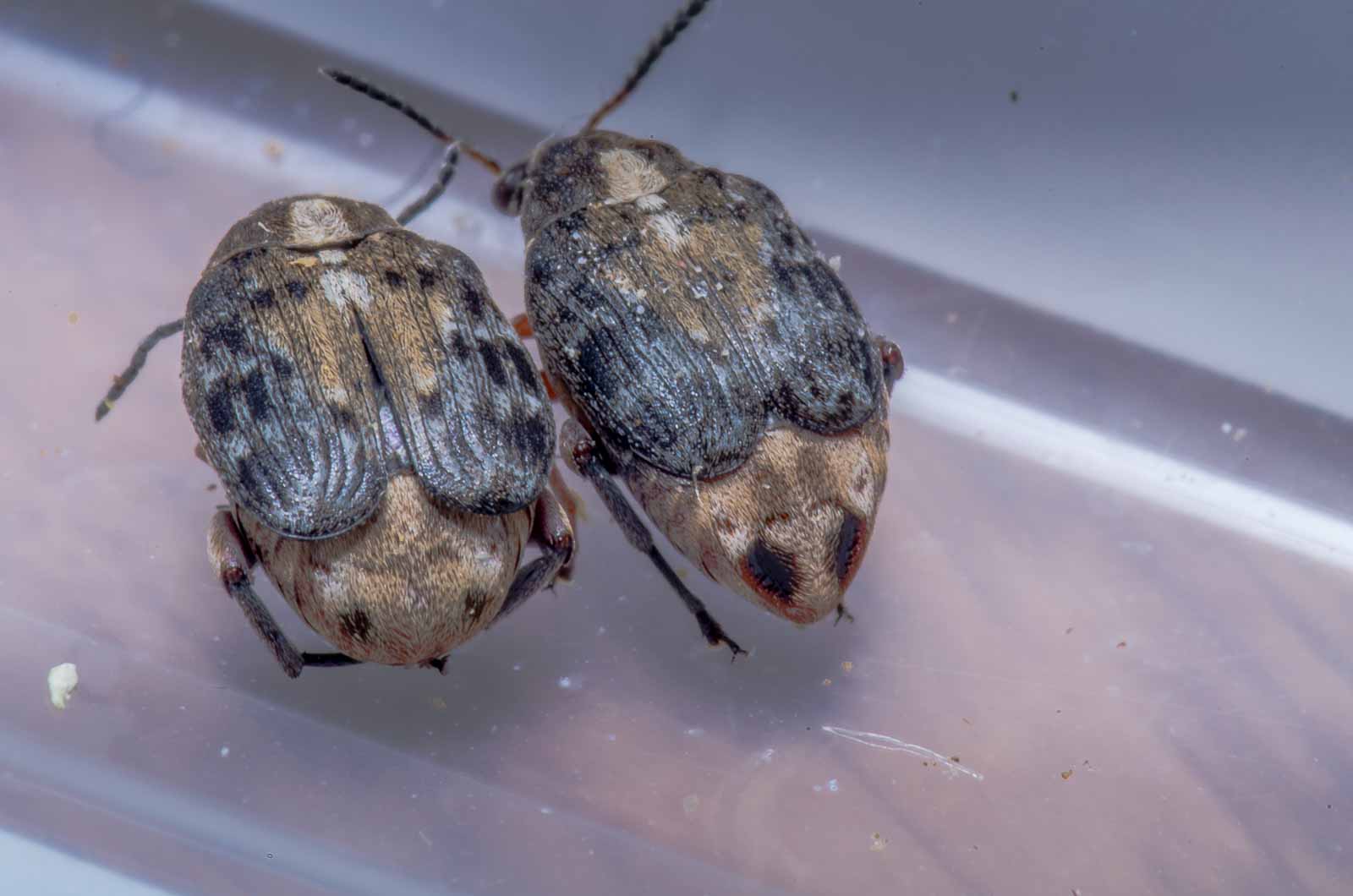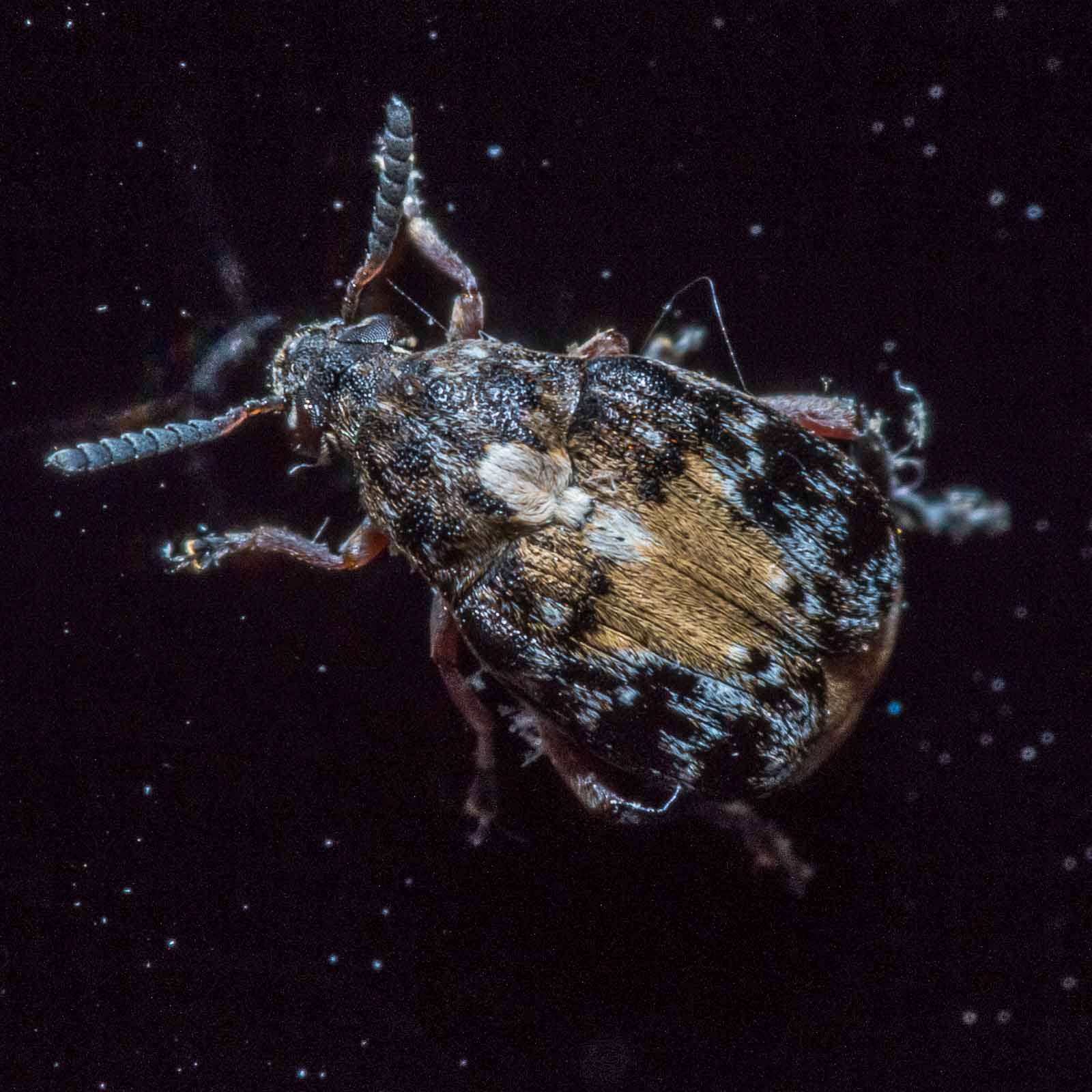 Als ich am selben Tag den Wohnzimmerschrank ausräumen und reinigen wollte, fielen mir dann auch die an den dort deponierten Lederhülsen durch Fraßlöcher entstandenen Krümel auf, zwischen denen sich etwa 10 der flugfähigen (und zudem auch sehr flugfreudigen) Käfer tummelten.